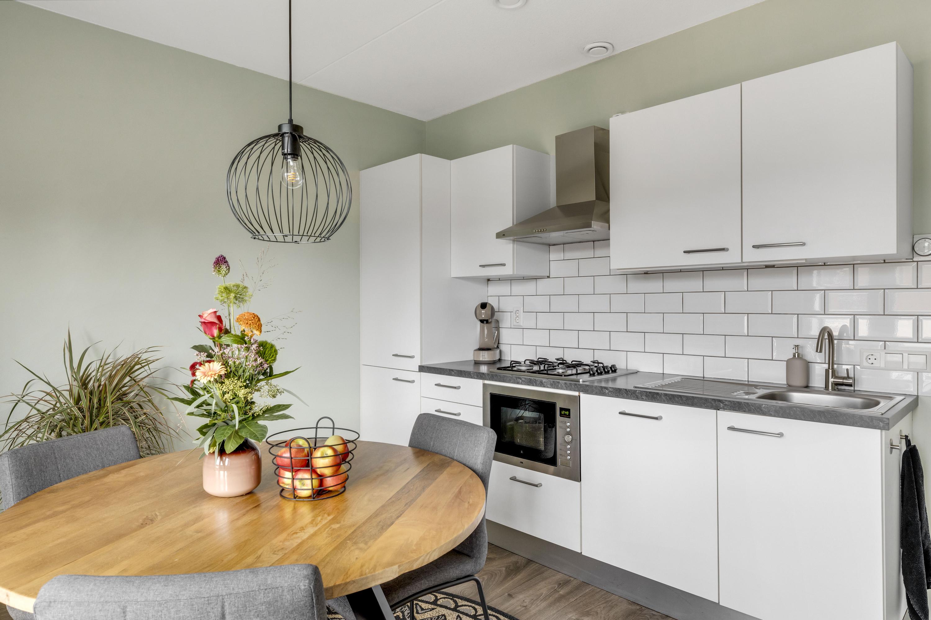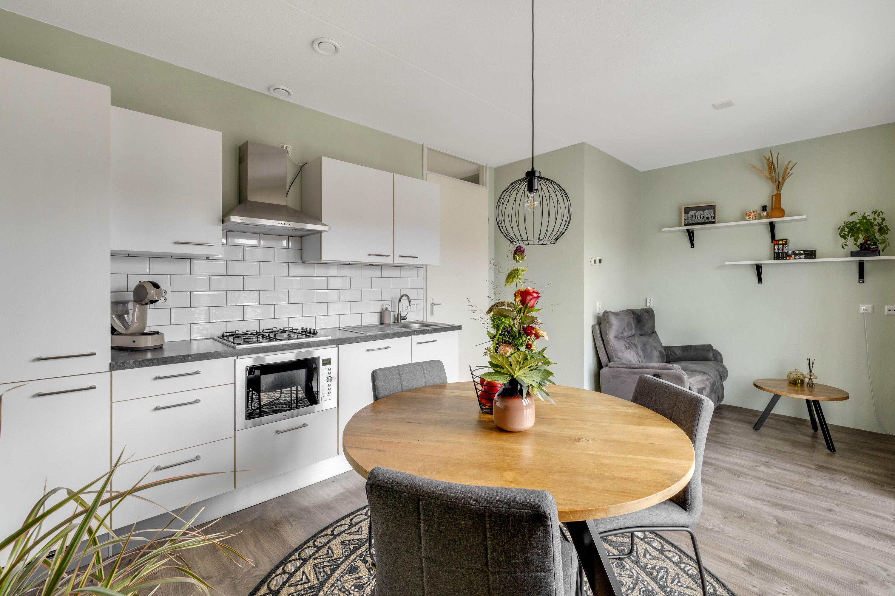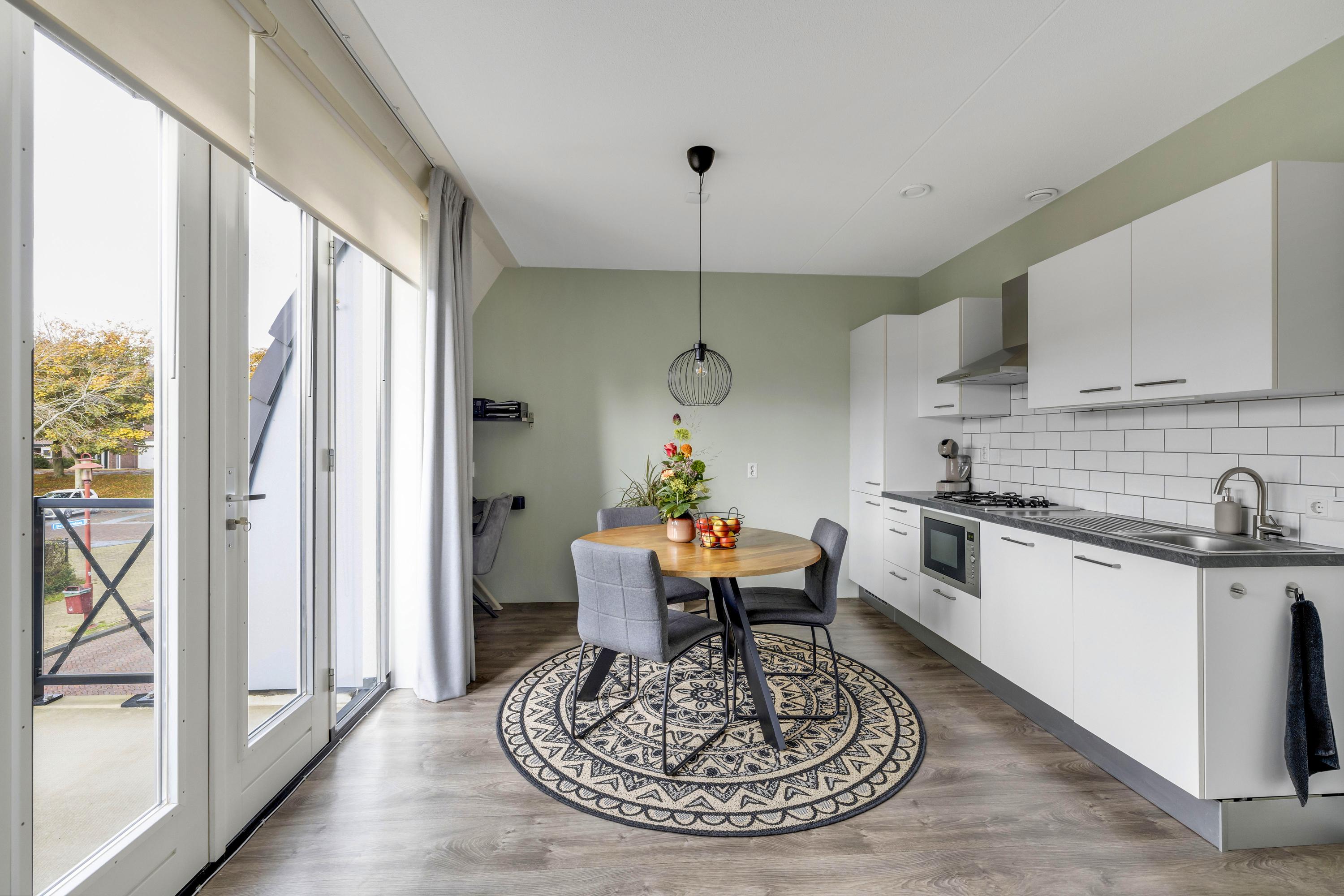 Lichte en sfeervolle woonkamer voorzien spachtelputz wanden en openslaande deuren naar het balkon. In de hoek bevindt zich de keuken. De wandopstelling is v.v. kunststof blad met spoelunit, koelkast, vriezer, 4 pits gaskookplaat, afzuigkap, combimagnetron en vaatwasser.