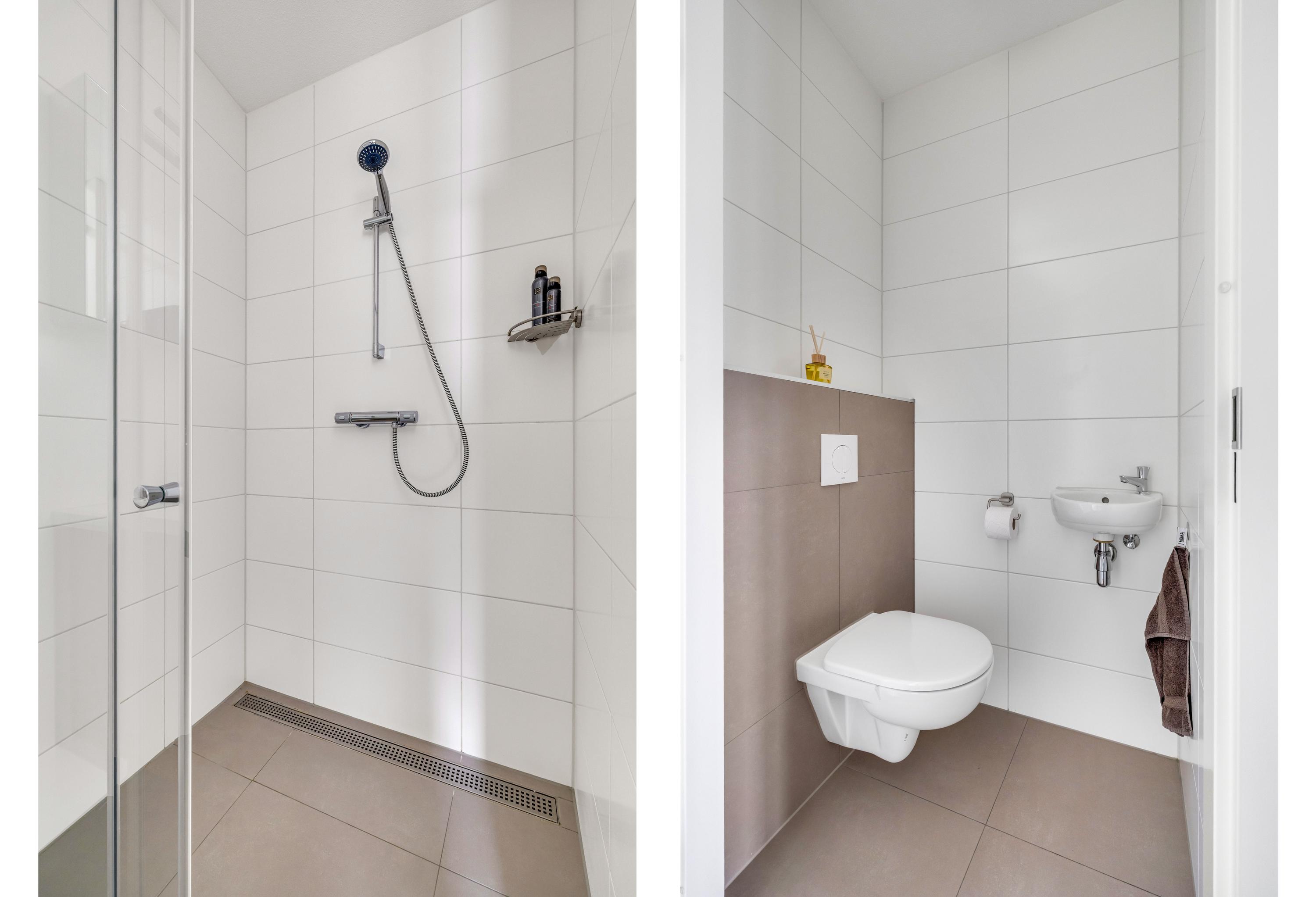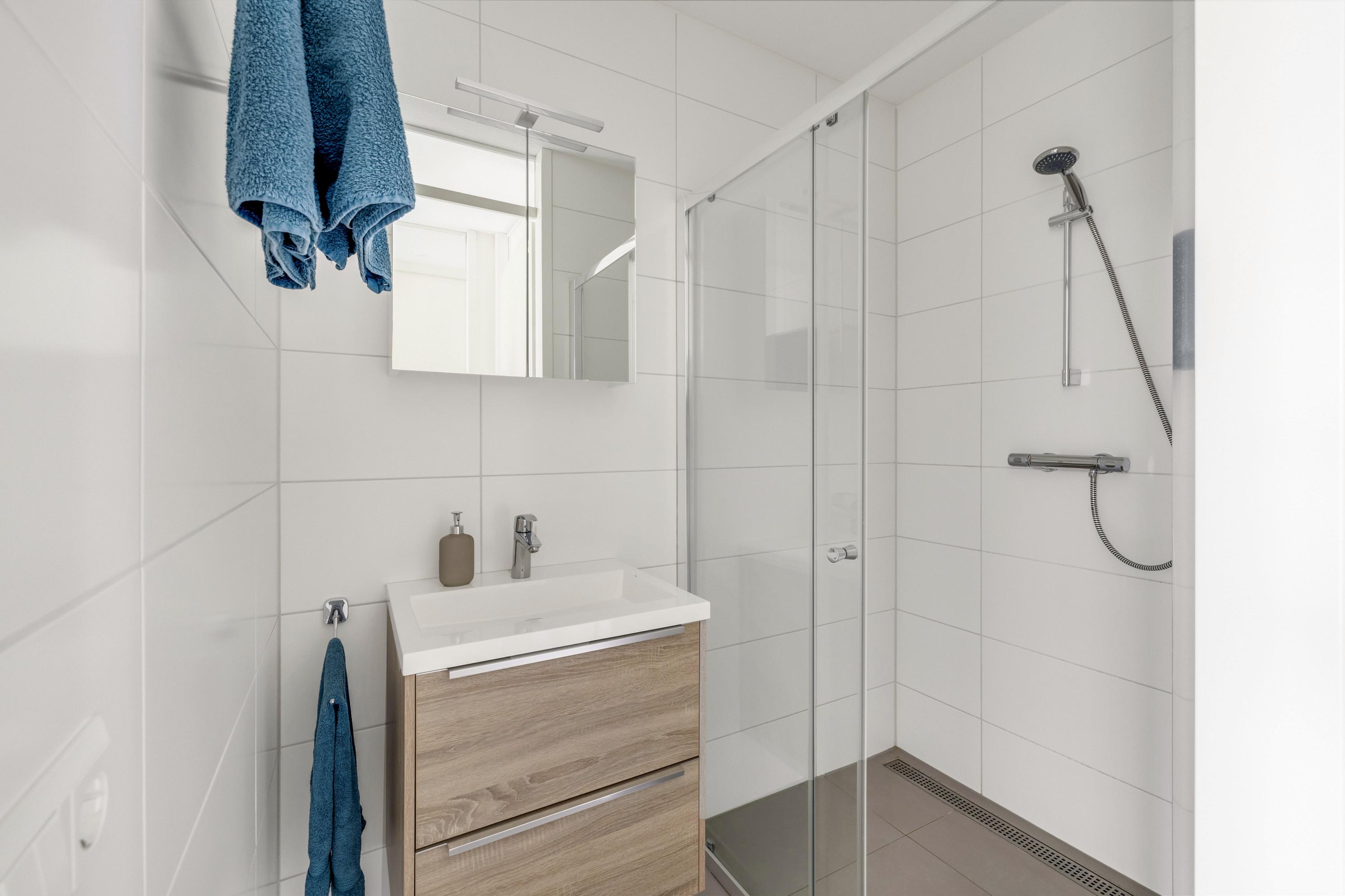 Modern betegelde badkamer voorzien van wastafelmeubel, douche en vloerverwarming.