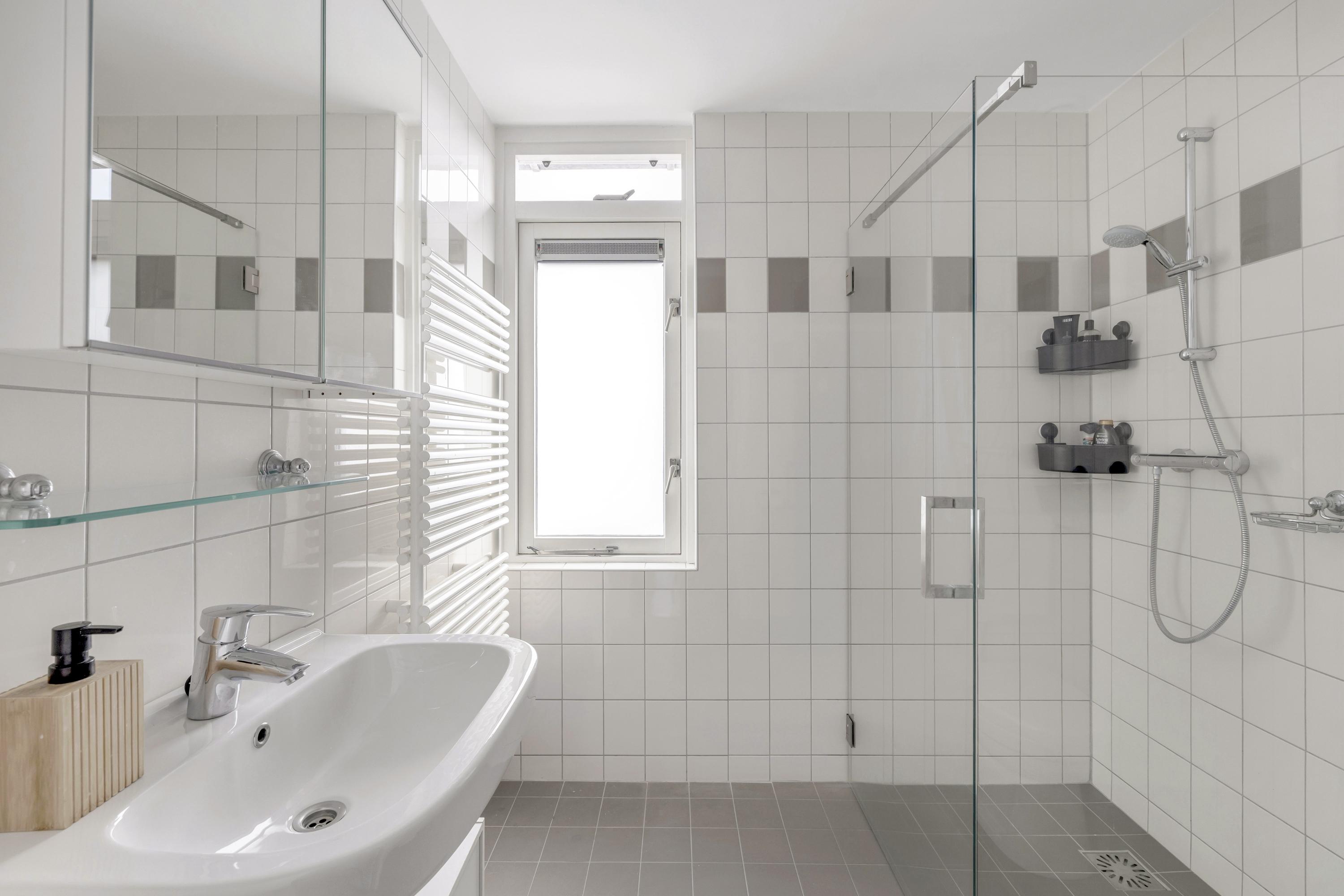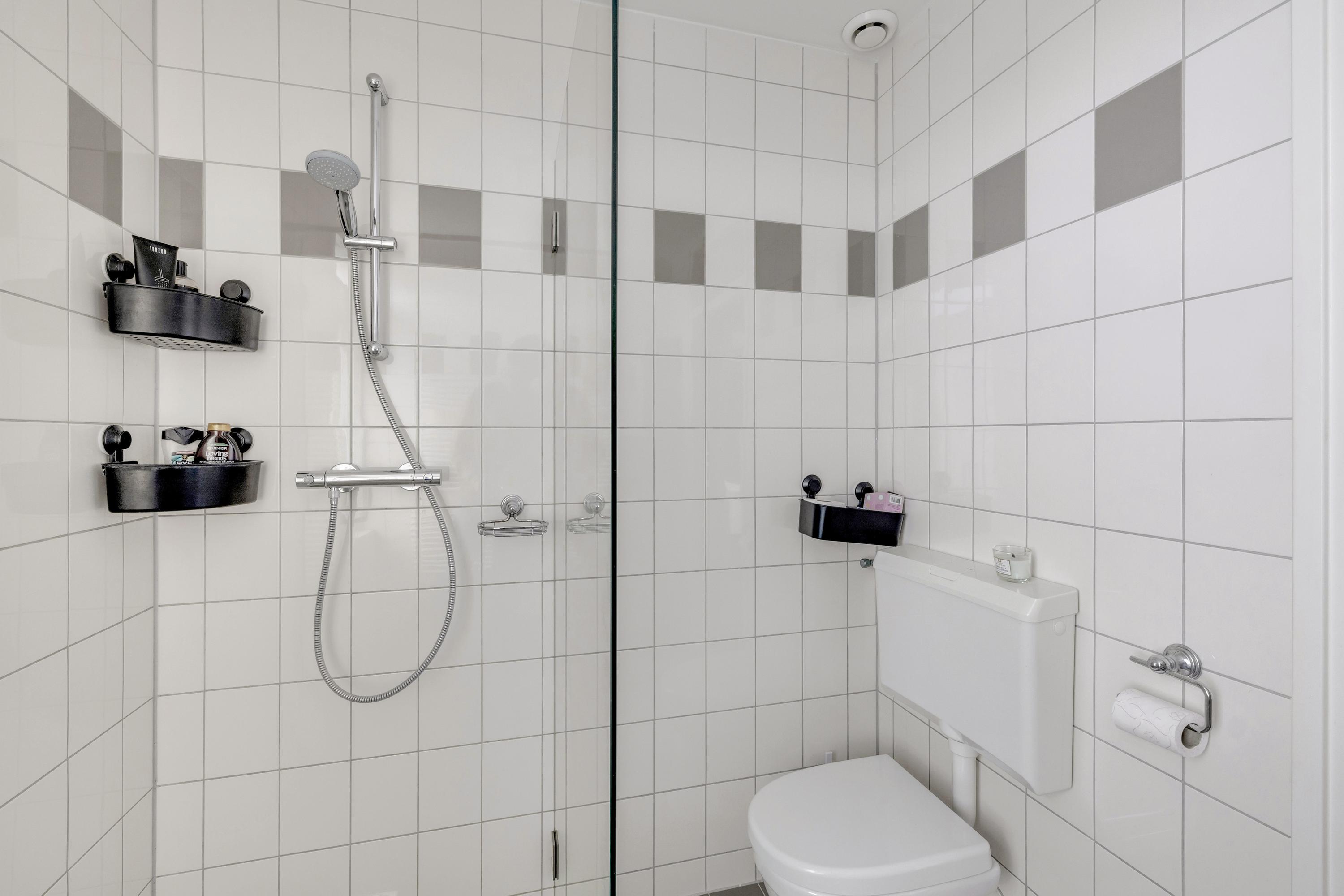 De nette, geheel betegelde badkamer is gesitueerd aan de voorzijde. De badkamer is v.v. een douchecabine, wastafel, radiator, tweede toilet en raam.