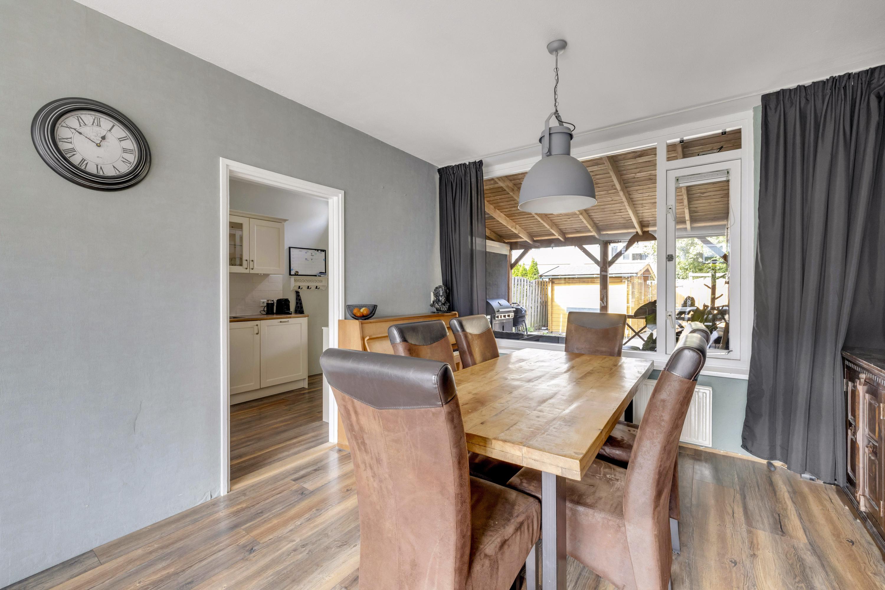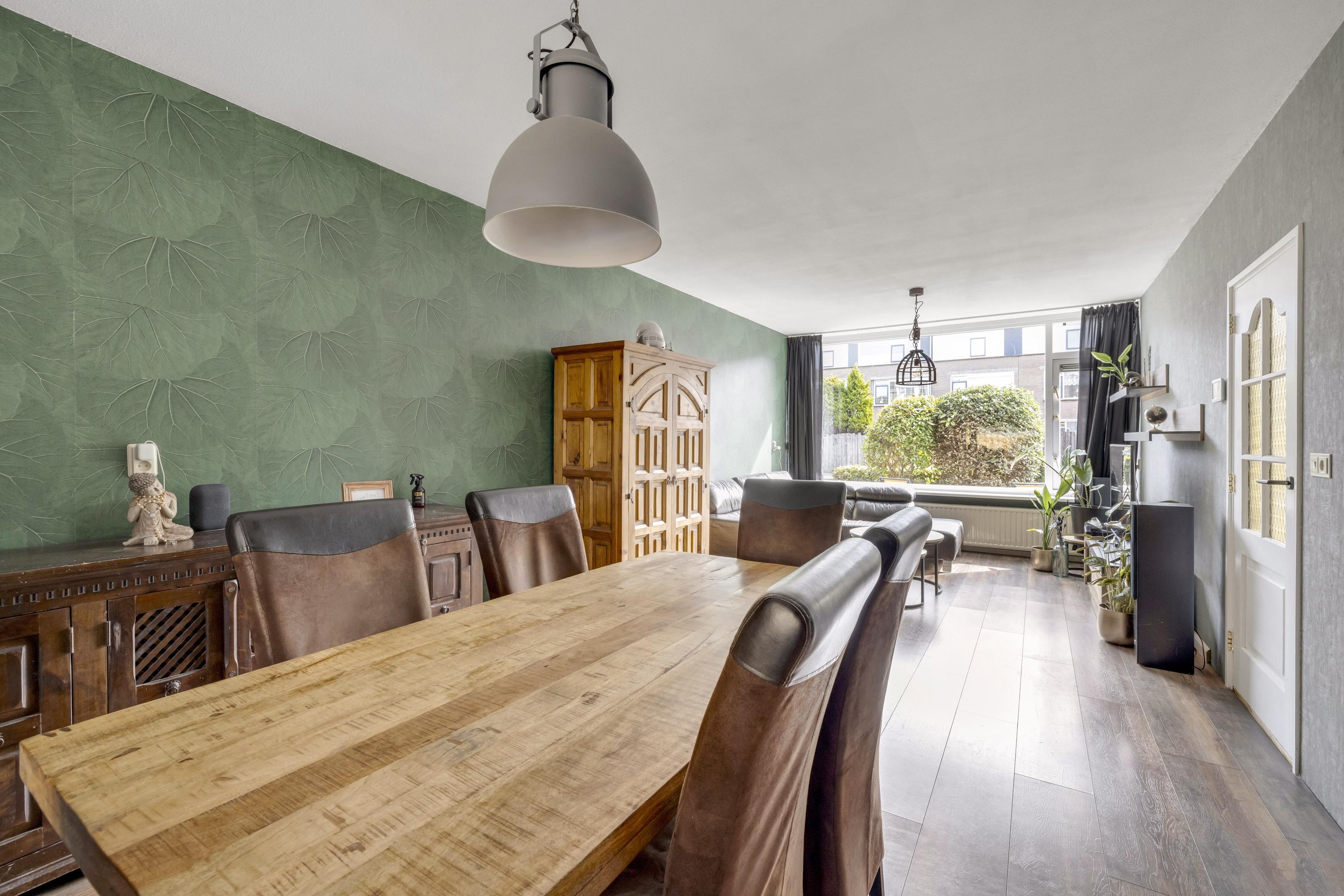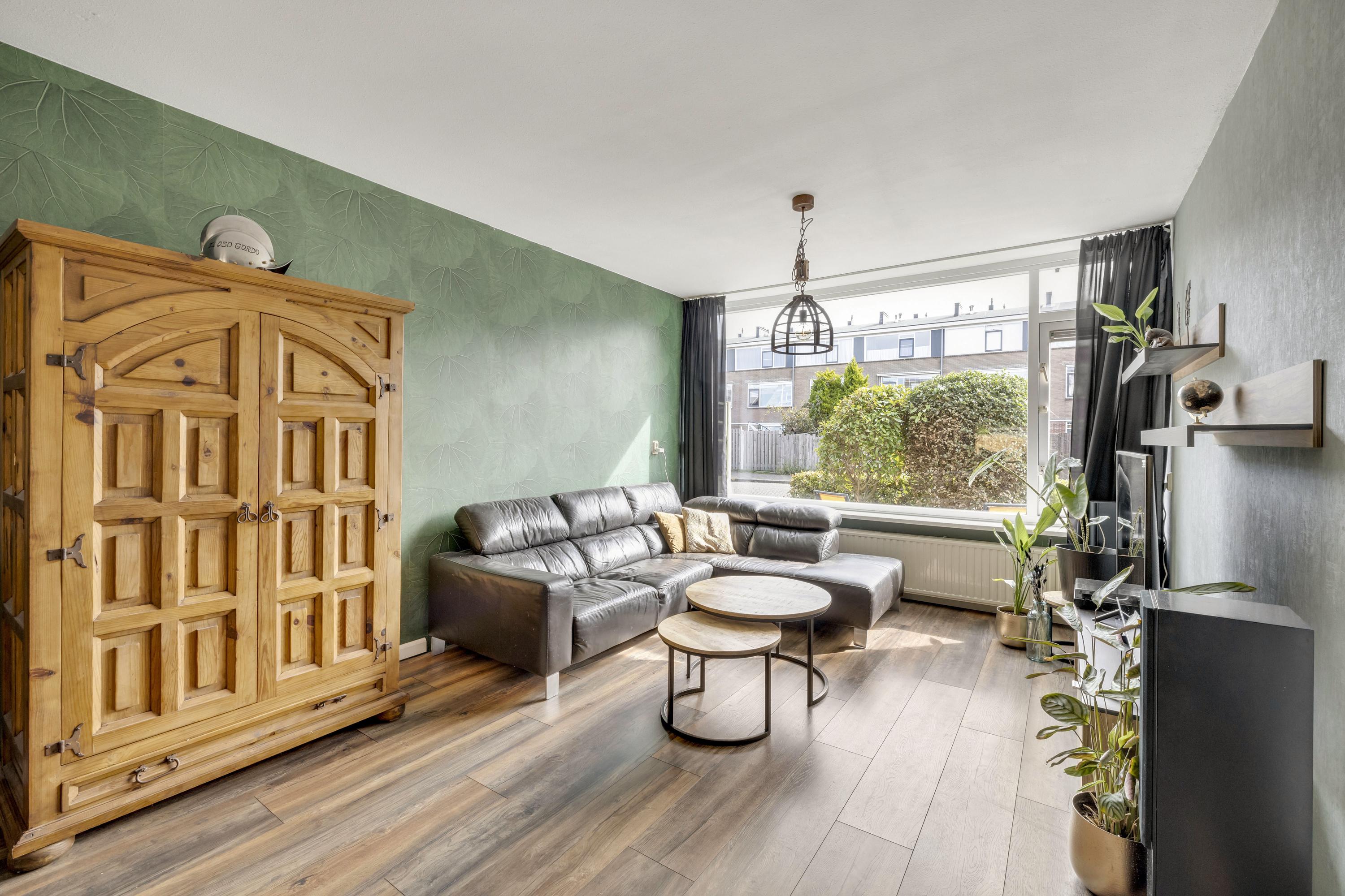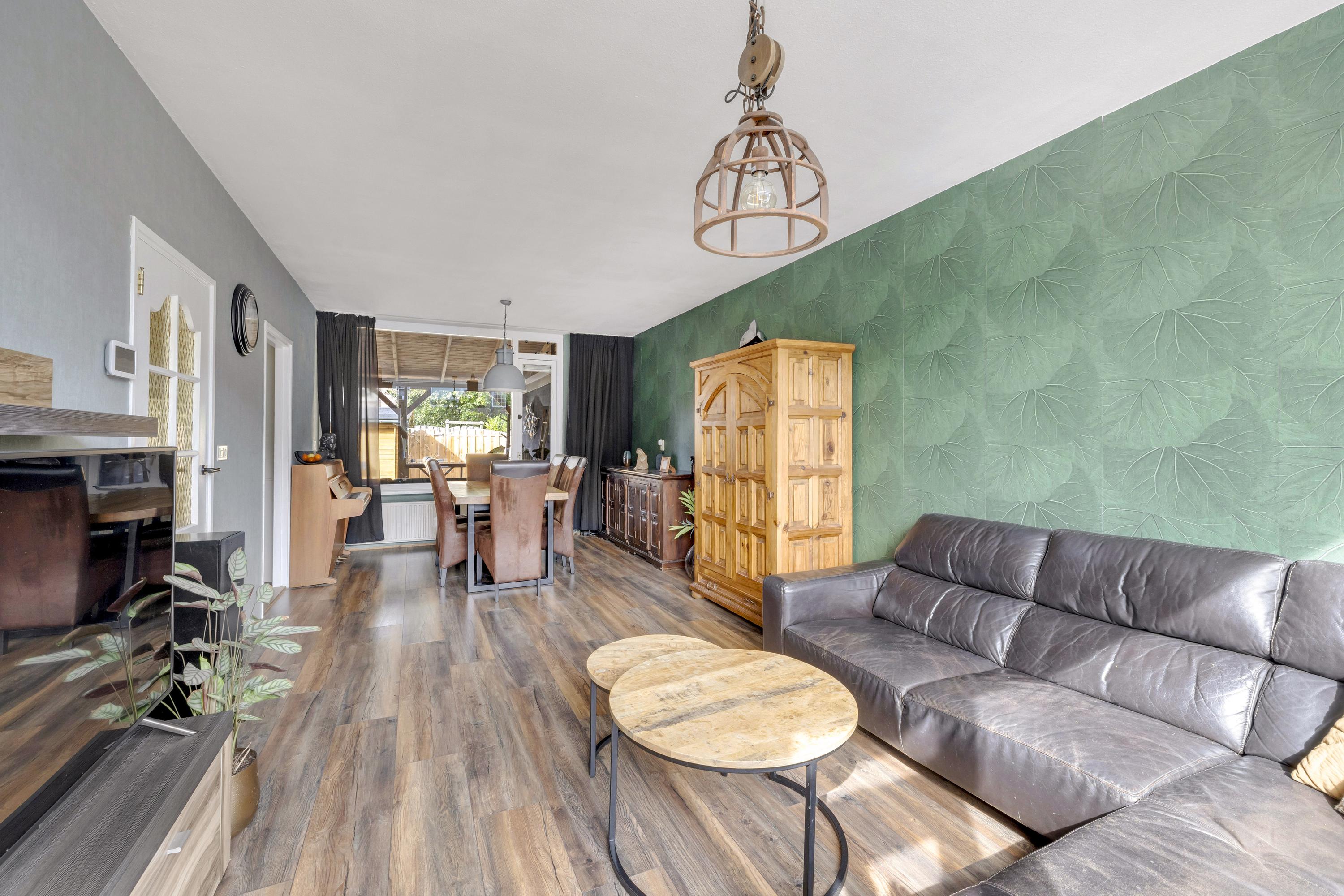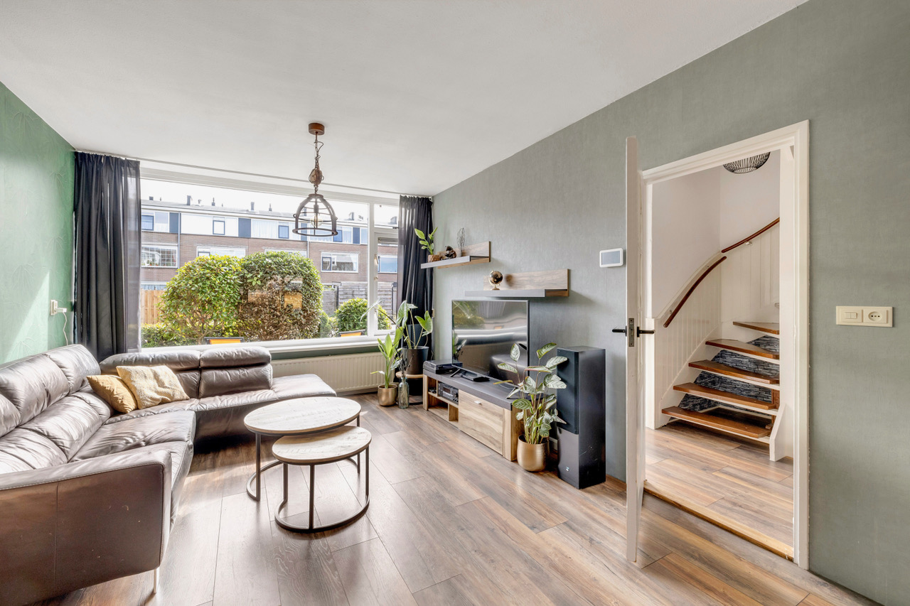 De heerlijk lichte woonkamer, type doorzon, heeft aan de voor- en achterzijde een grote raampartij en is v.v. een laminaatvloer welke in de keuken doorloopt.