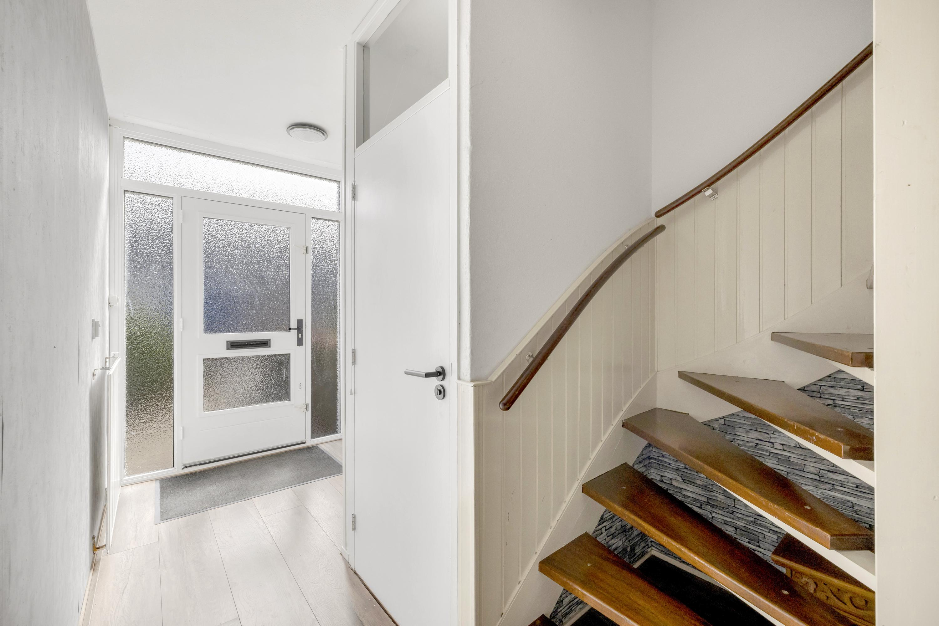 Entree/ hal met garderobe, moderne meterkast, eenvoudig toilet met fonteintje, trap naar de eerste verdieping en toegang tot de woonkamer.