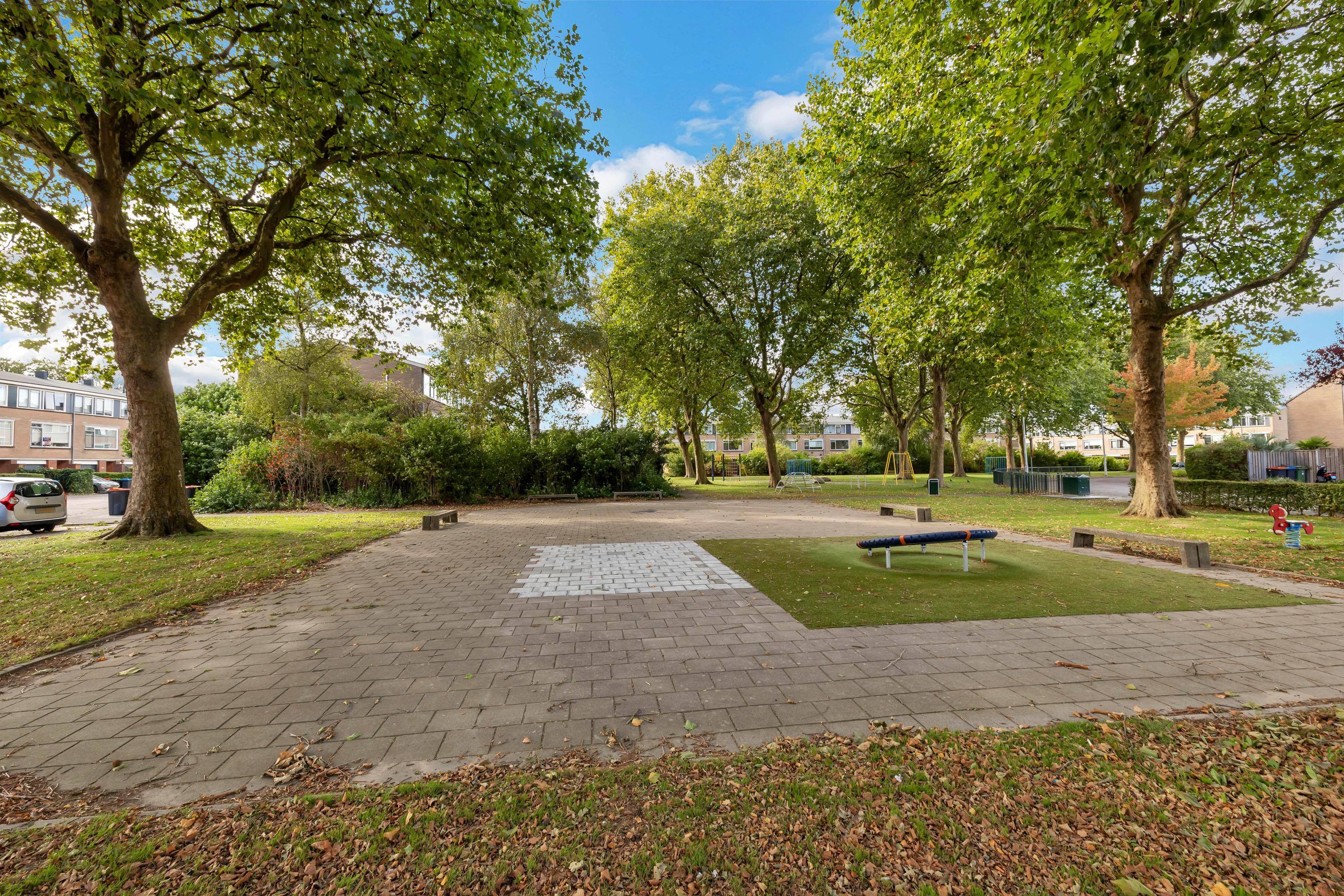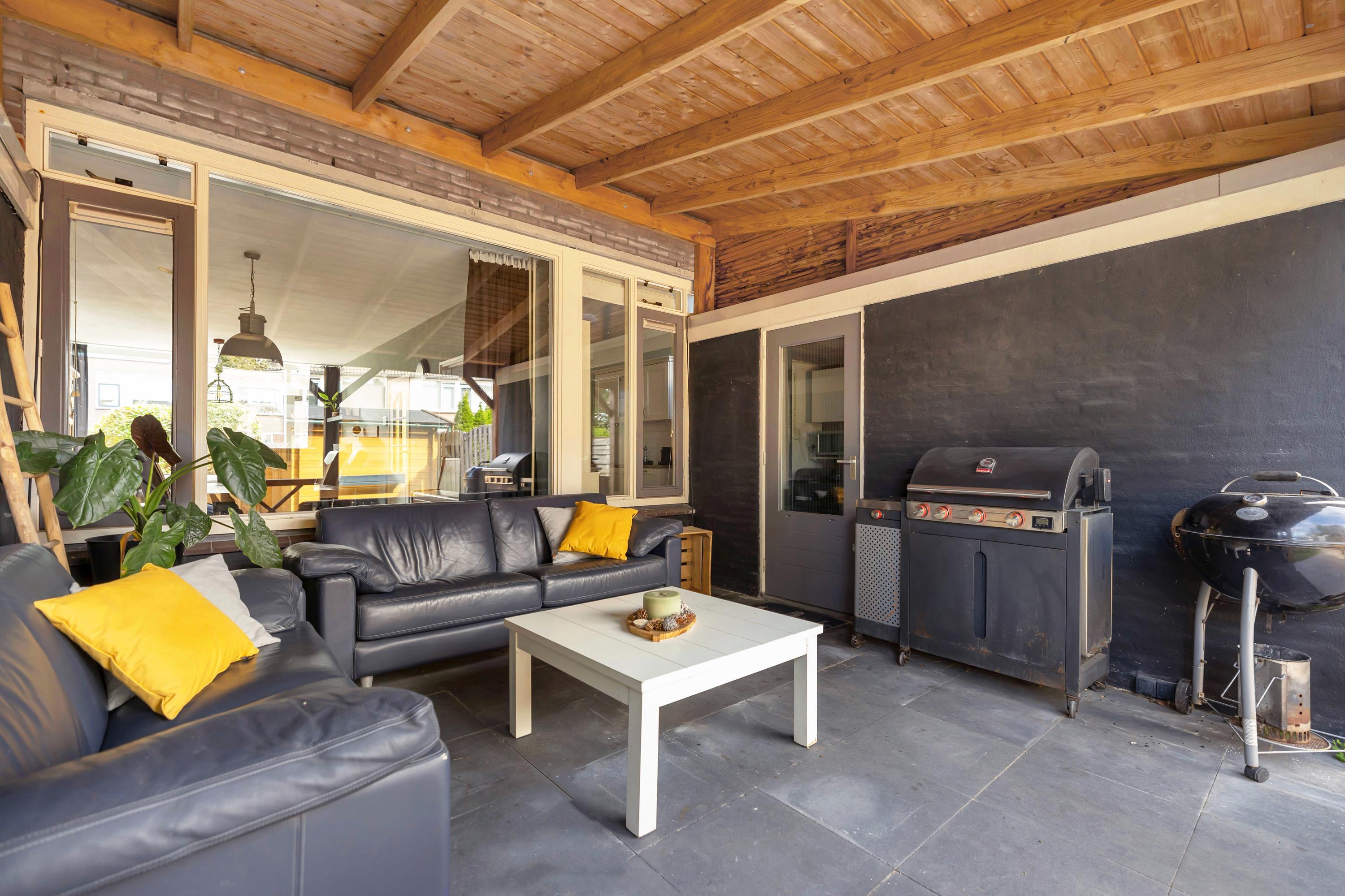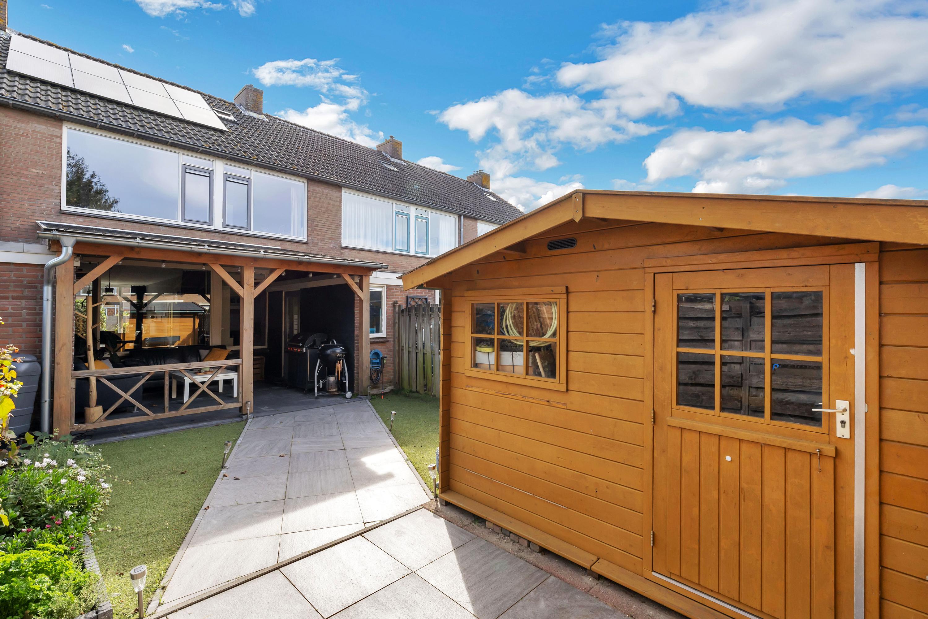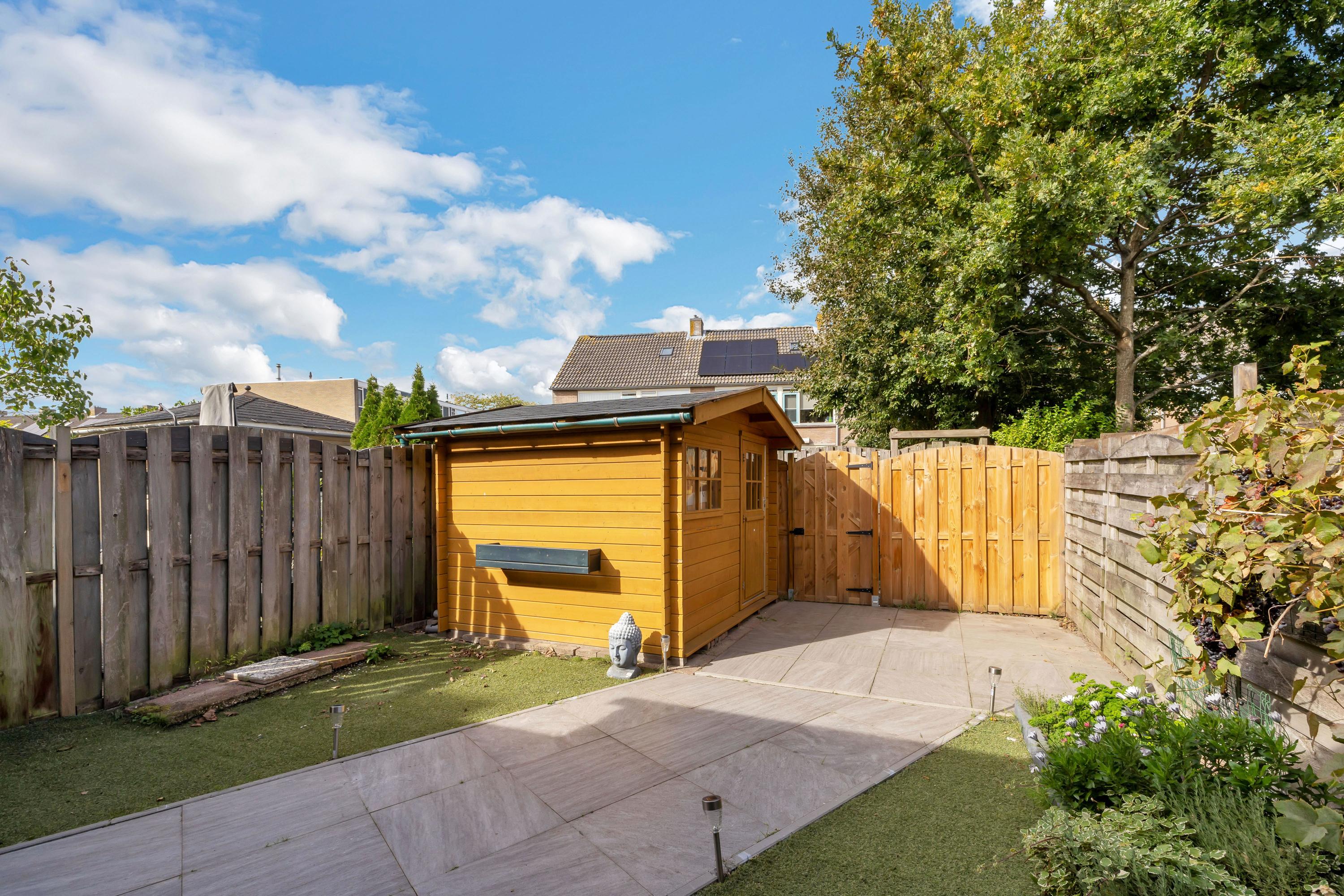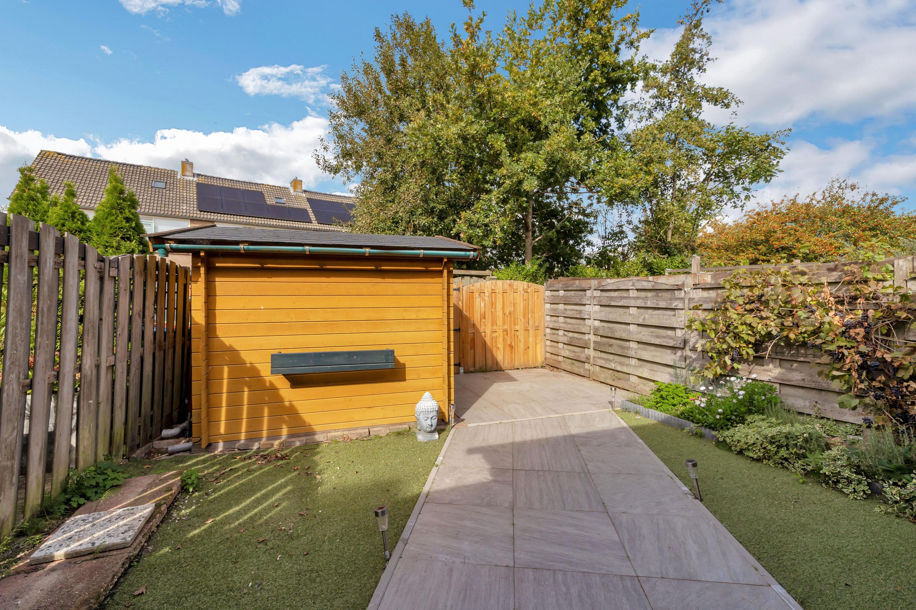 De ruime tuin beschikt over een zeer ruime terrasoverkapping, terras, kunstgras en houten vrijstaande berging. Via de poort is het achterpad bereikbaar.