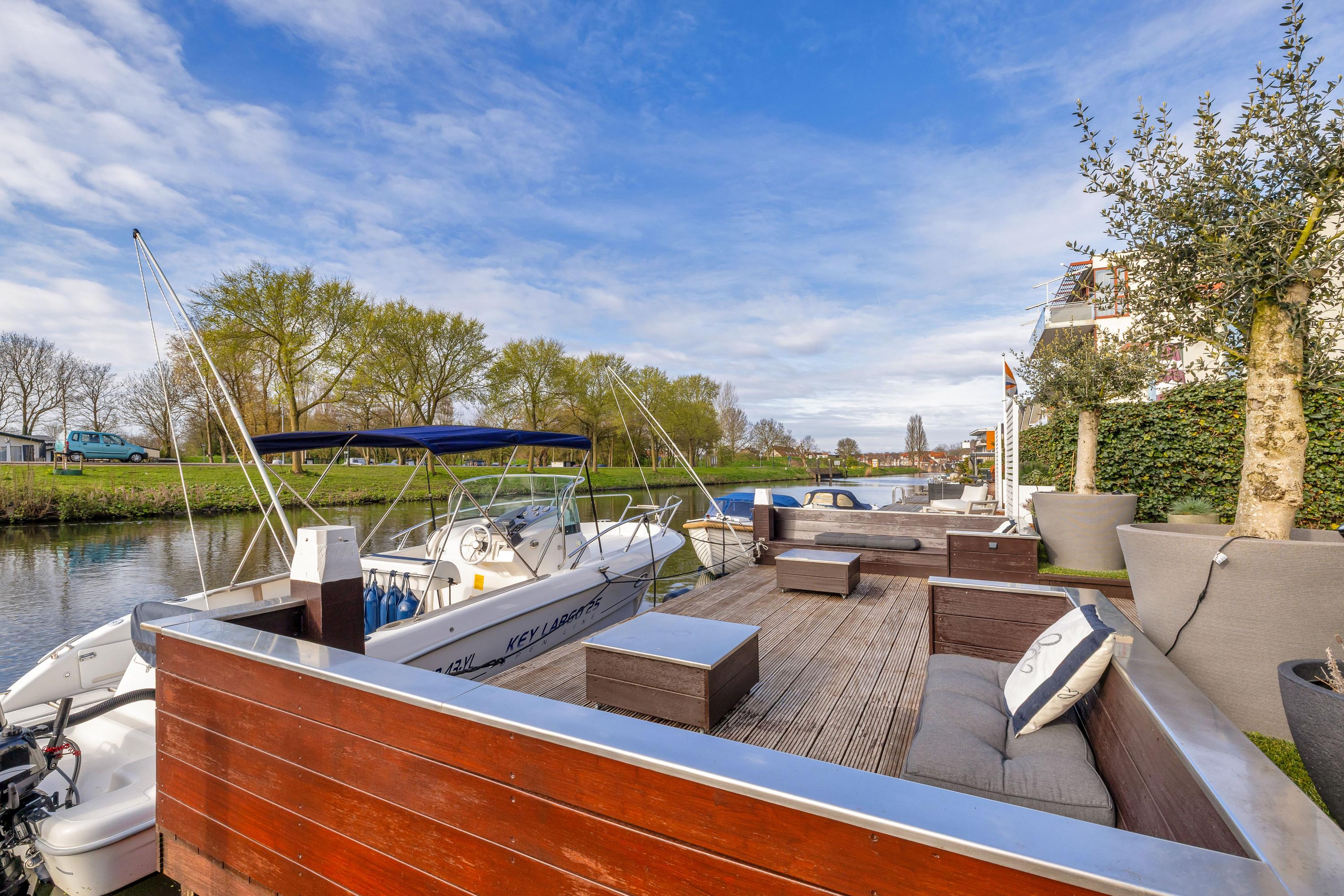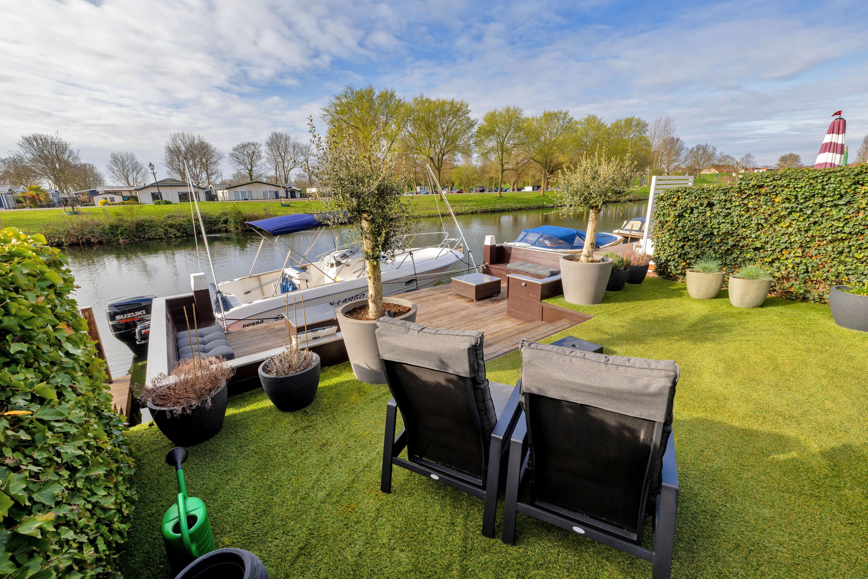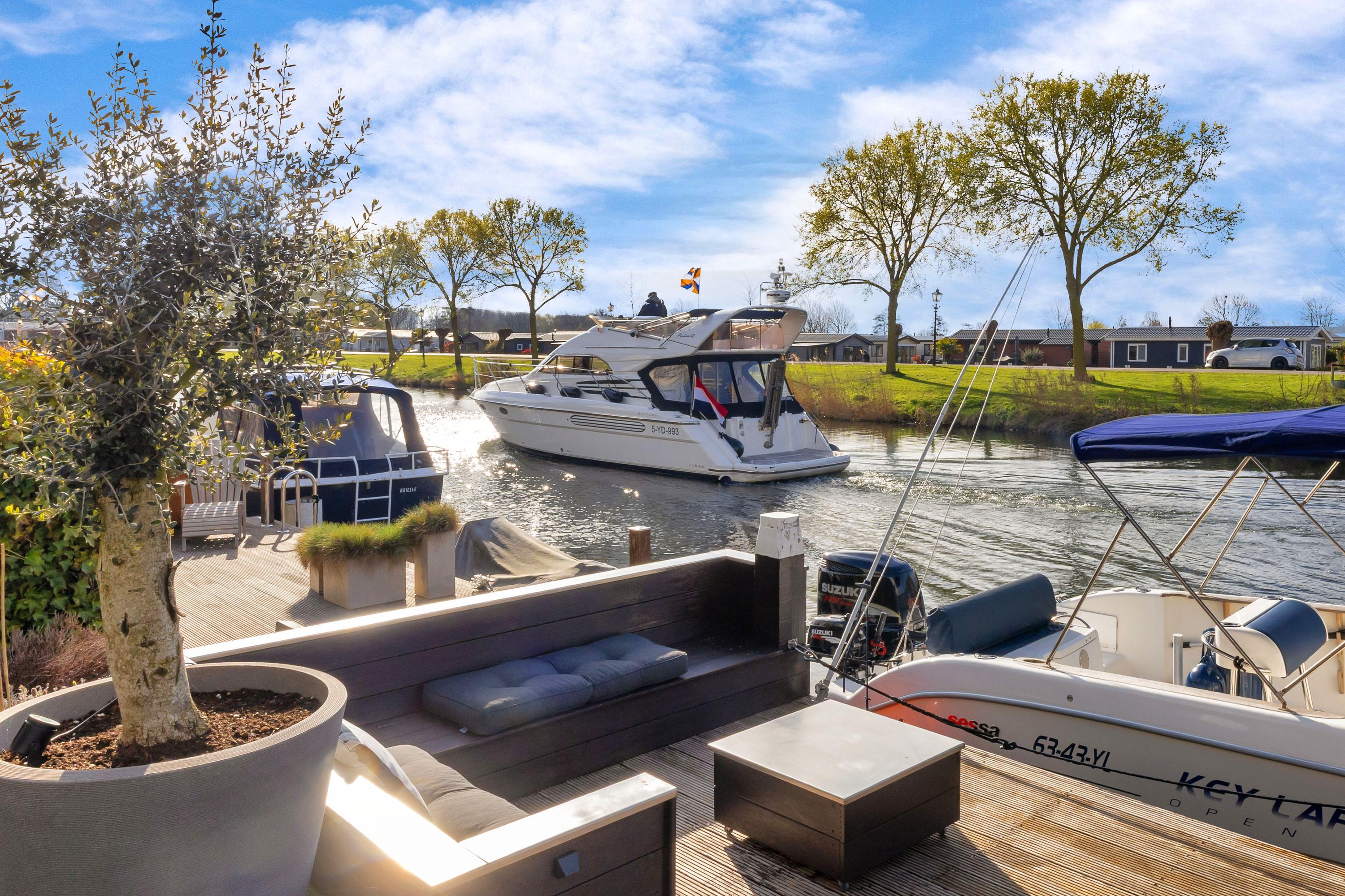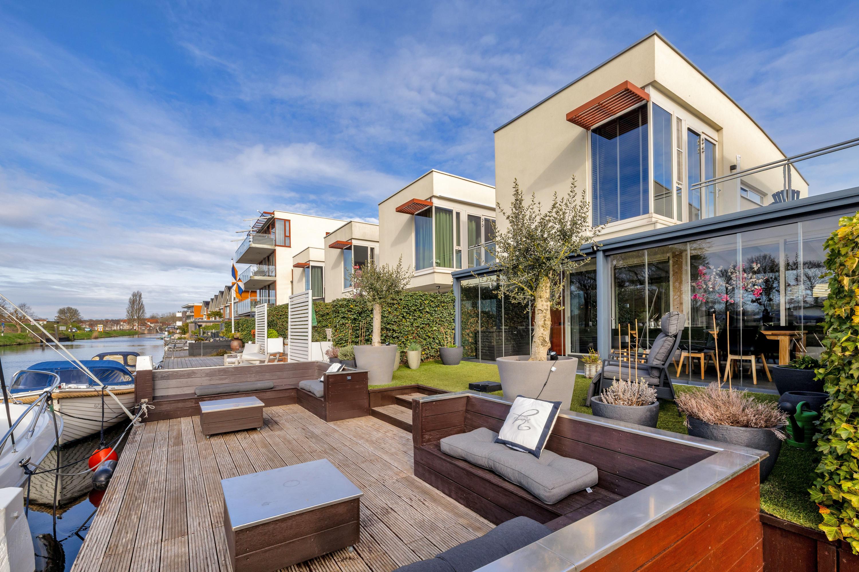 Aan de achterzijde bevindt zich een serre over de volledige breedte van de woning. Deze afsluitbare ruimte is voorzien van inbouwspots en kan worden verduisterd, waardoor je hier het hele jaar door comfortabel kunt zitten. Het aangrenzende zonneterras ligt op het zuiden, direct aan het water en beschikt over een eigen aanlegsteiger. Hier geniet je volop van de zon, het uitzicht en het buitenleven, met de mogelijkheid om zo het water op te varen. Het terras en de serre zijn uitgevoerd met een solide betonvloer onder de tegels.