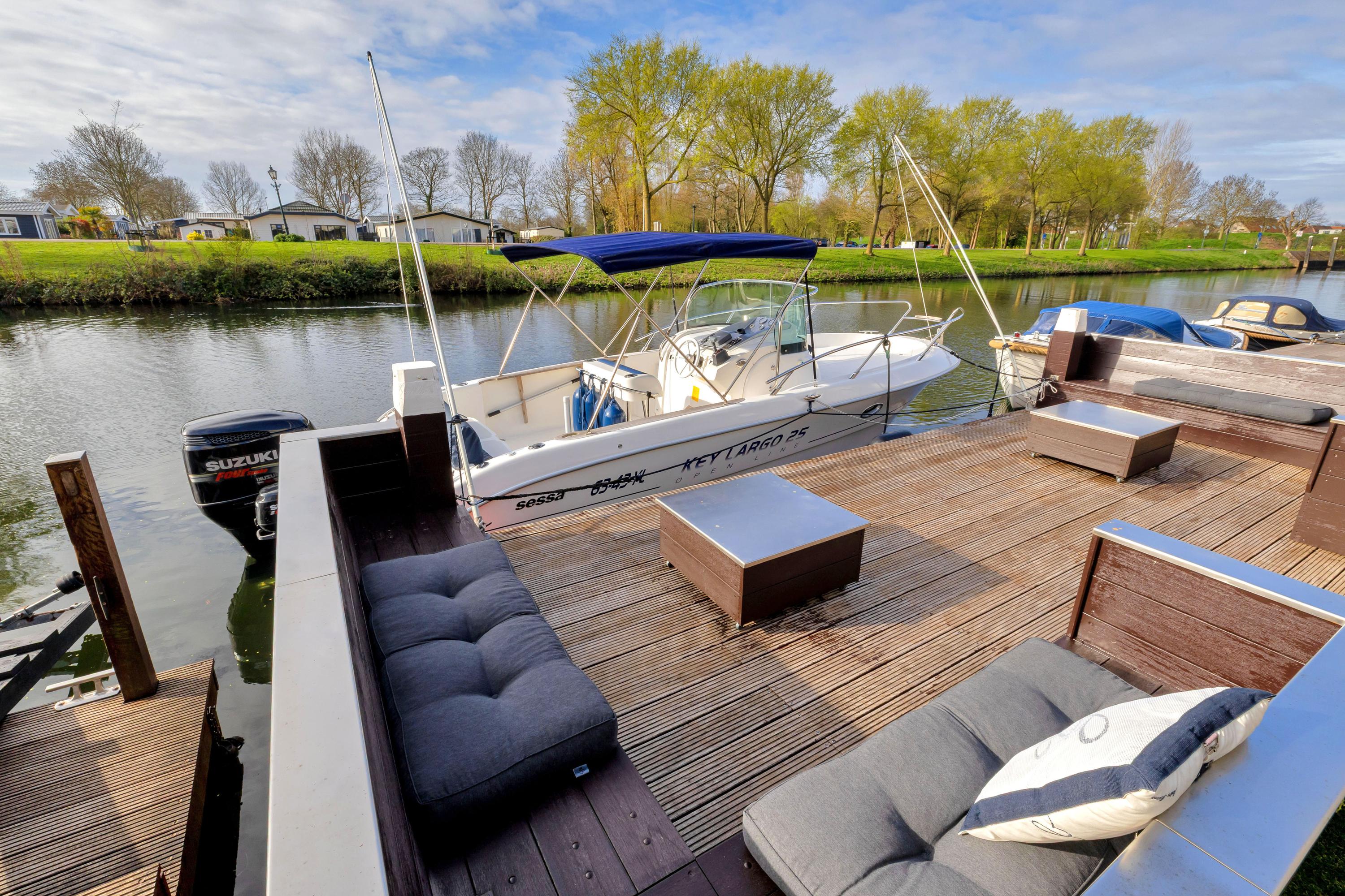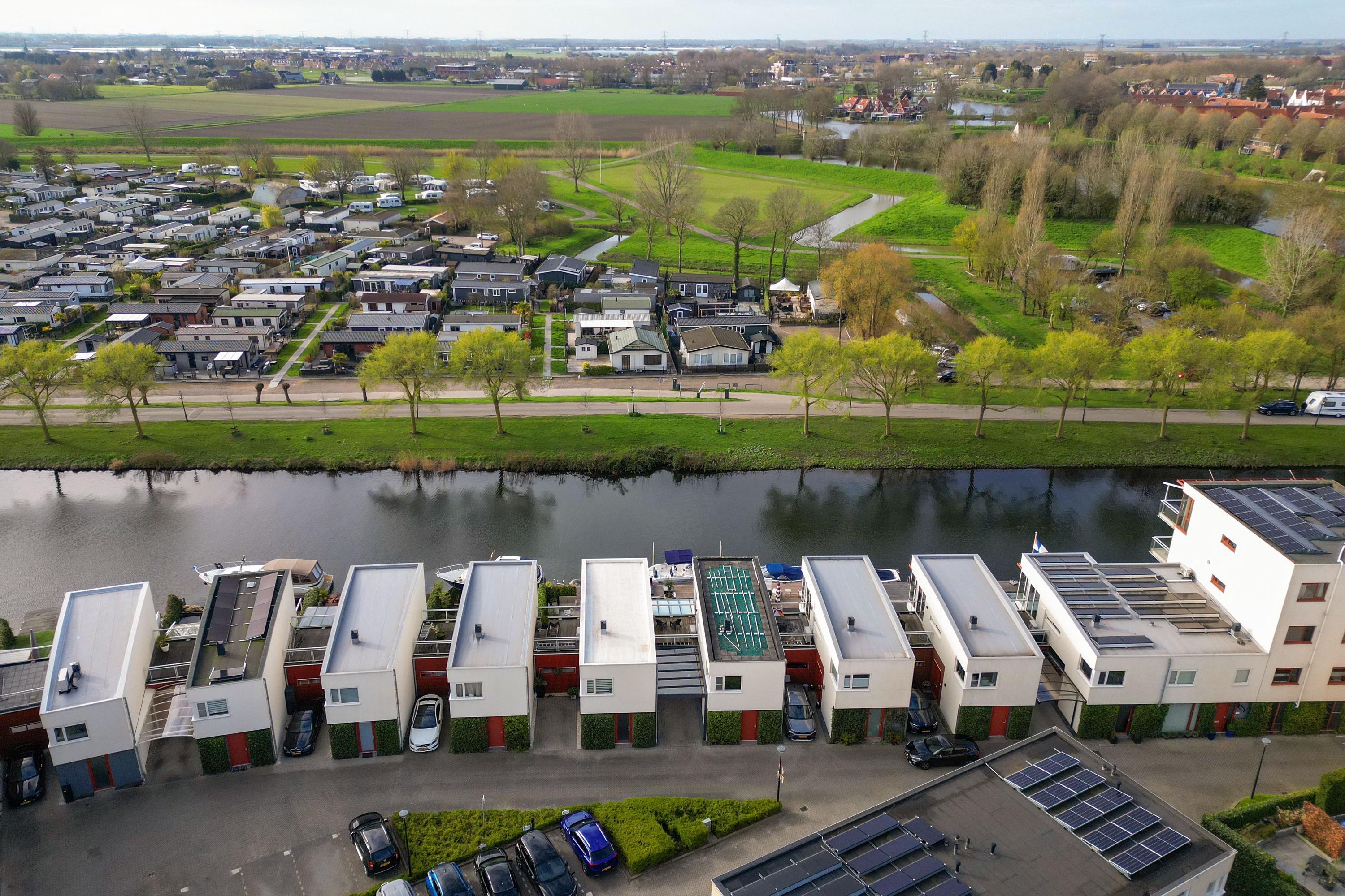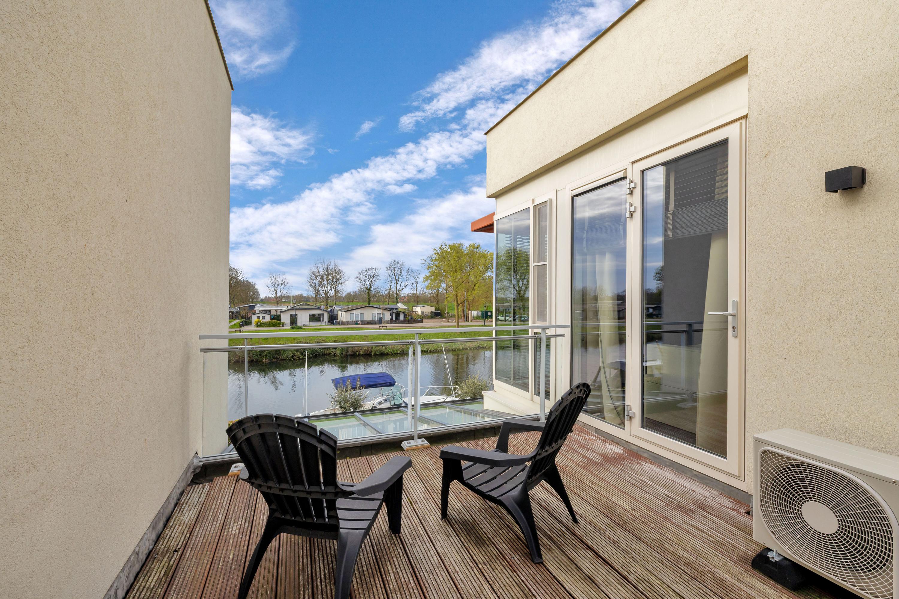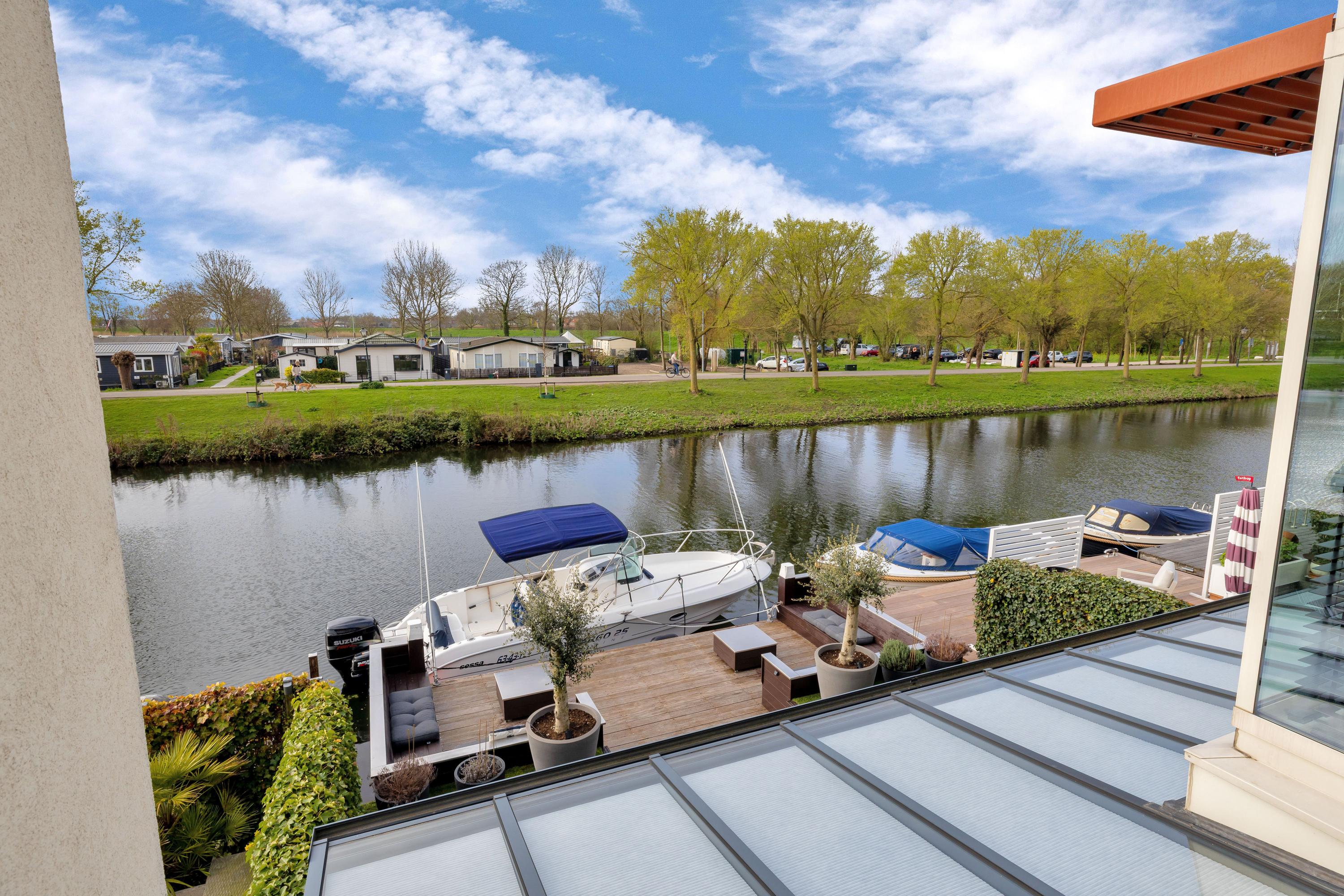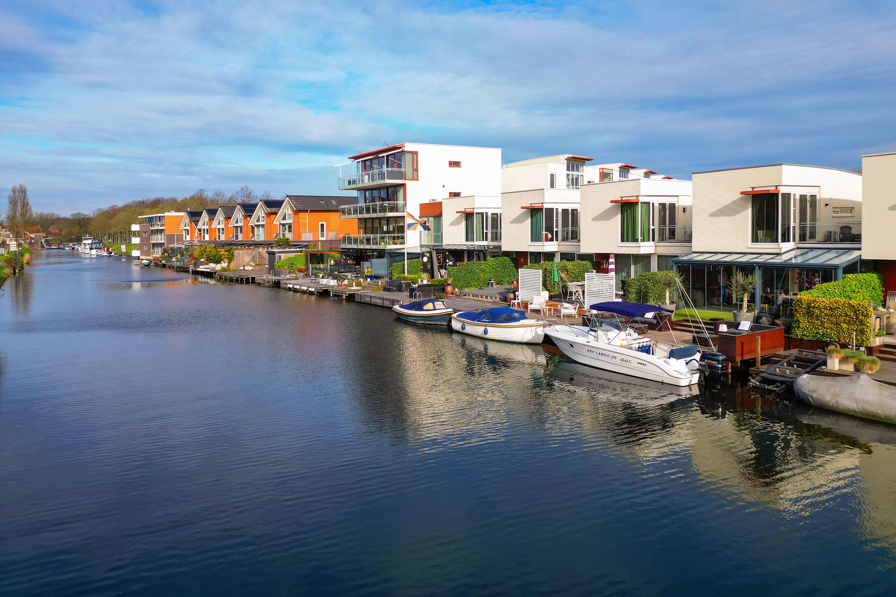 Aan de achterzijde bevindt zich een serre over de volledige breedte van de woning. Deze afsluitbare ruimte is voorzien van inbouwspots en kan worden verduisterd, waardoor je hier het hele jaar door comfortabel kunt zitten. Het aangrenzende zonneterras ligt op het zuiden, direct aan het water en beschikt over een eigen aanlegsteiger. Hier geniet je volop van de zon, het uitzicht en het buitenleven, met de mogelijkheid om zo het water op te varen. Het terras en de serre zijn uitgevoerd met een solide betonvloer onder de tegels.