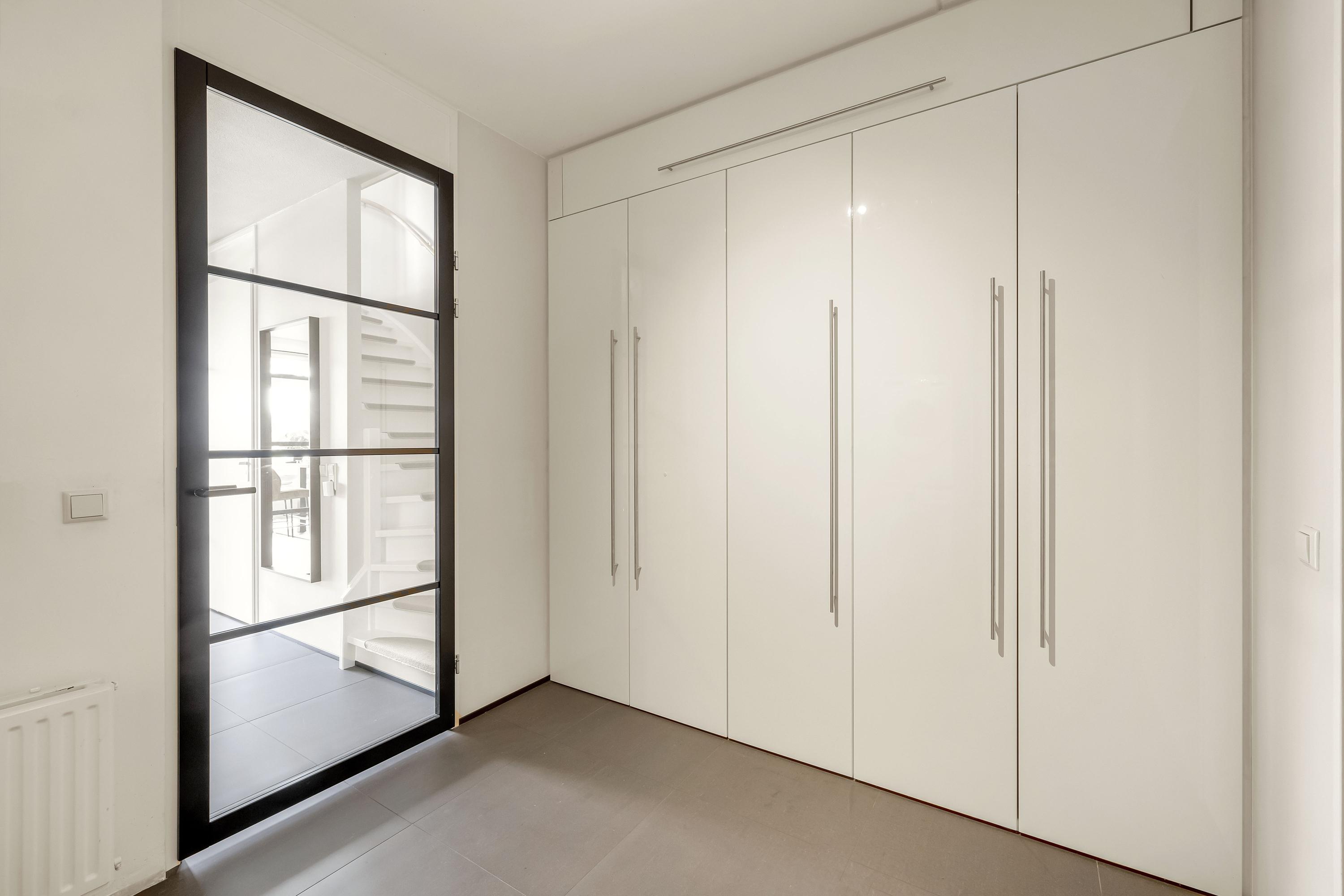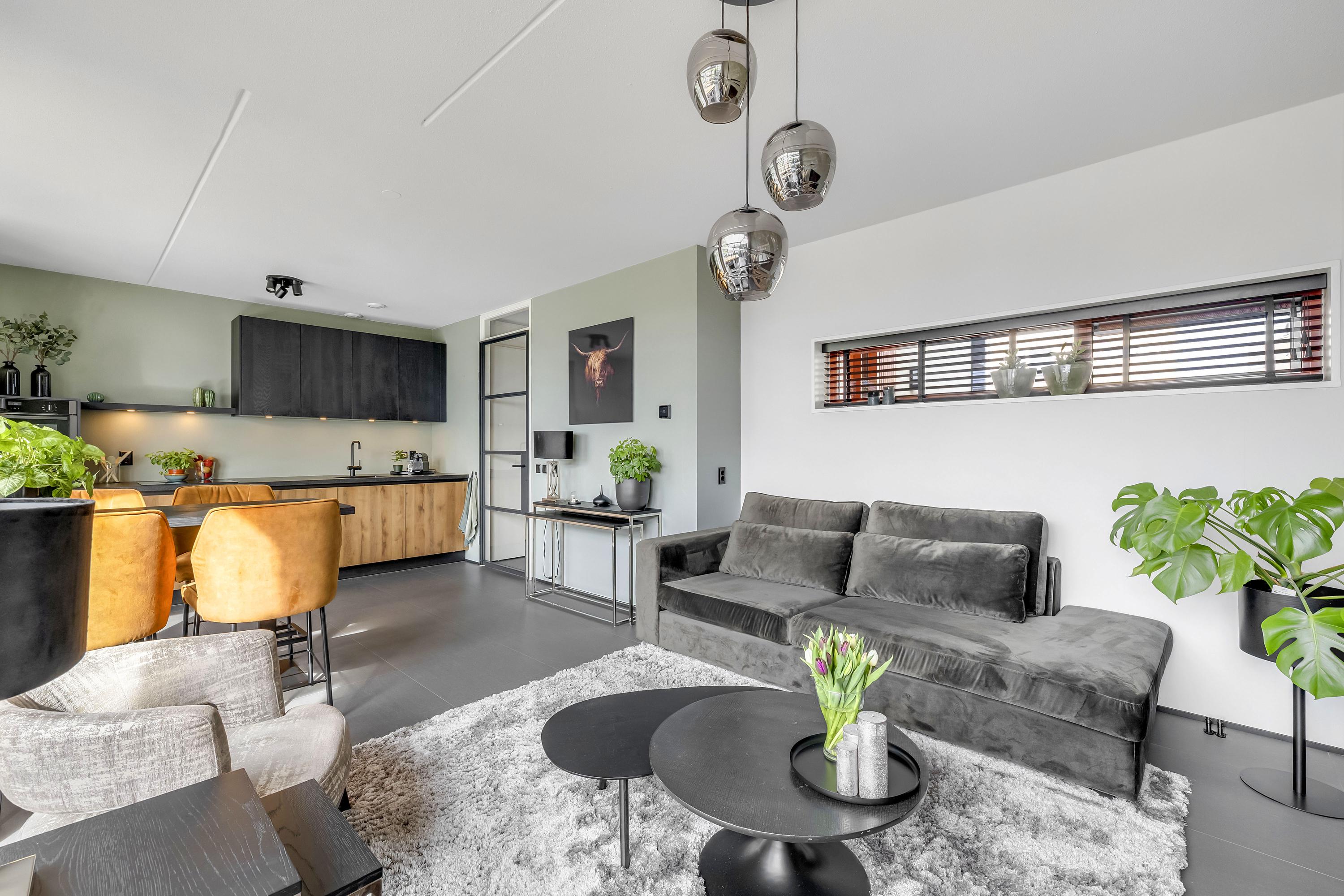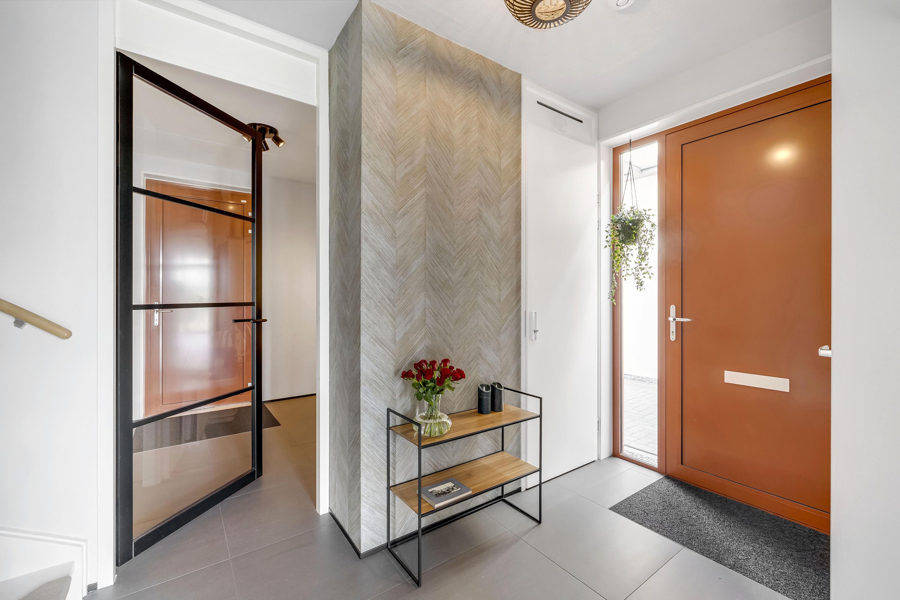Je komt de woning binnen via de ruime hal met meterkast, trapkast, modern toilet met hangend closet en fonteintje, toegang tot de inpandige berging/bijkeuken en de trap naar de 1e verdieping. Aan de achterzijde bevindt zich de lichte, op het water gerichte woonkamer, waar 2 grote schuifpuien zorgen voor een directe verbinding met de serre en het terras. Dankzij de grote raampartijen geniet je hier van veel lichtinval en een prachtig uitzicht.
