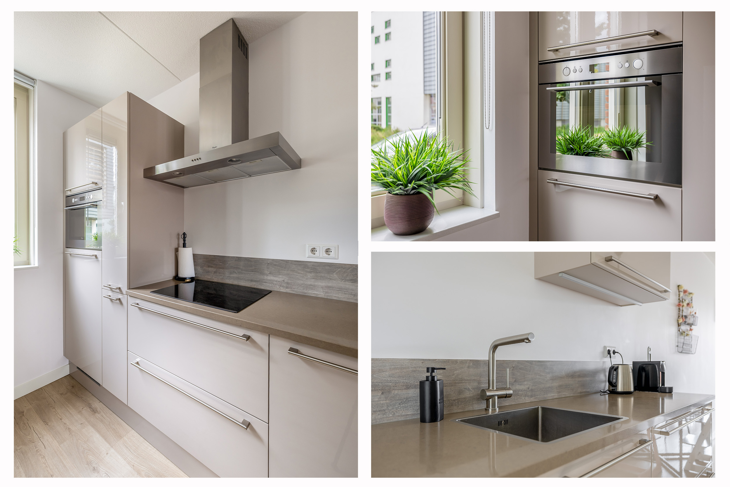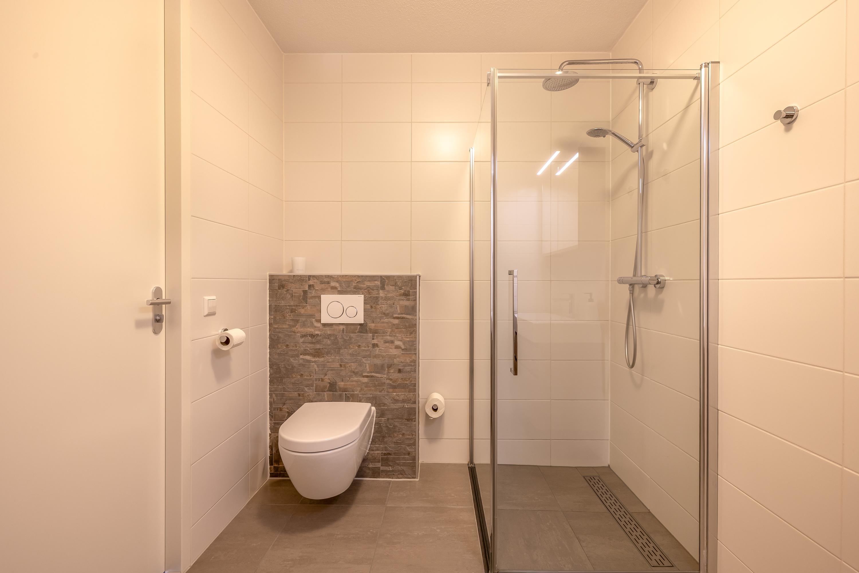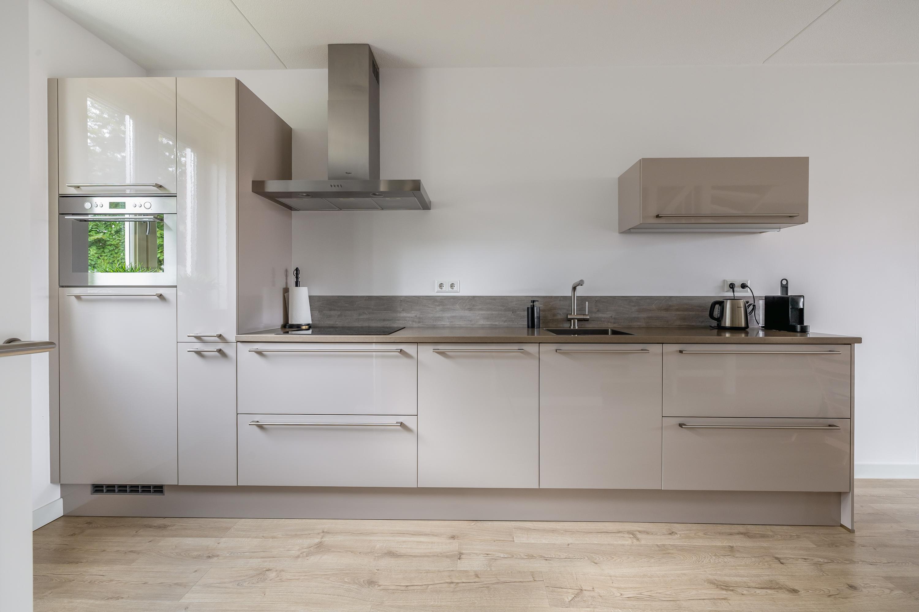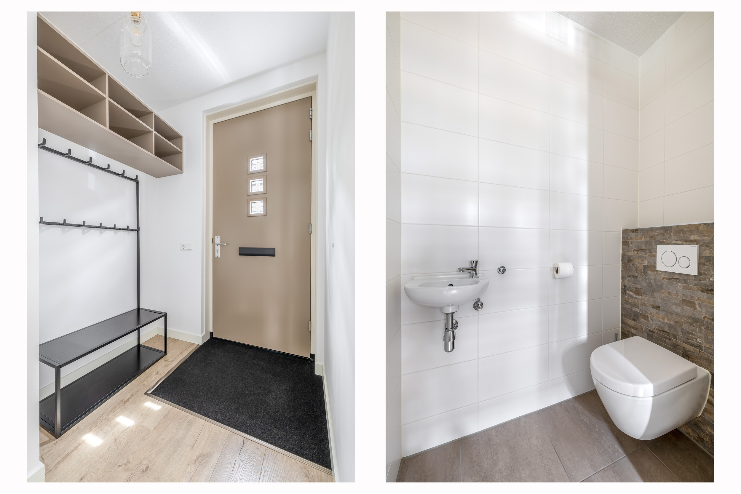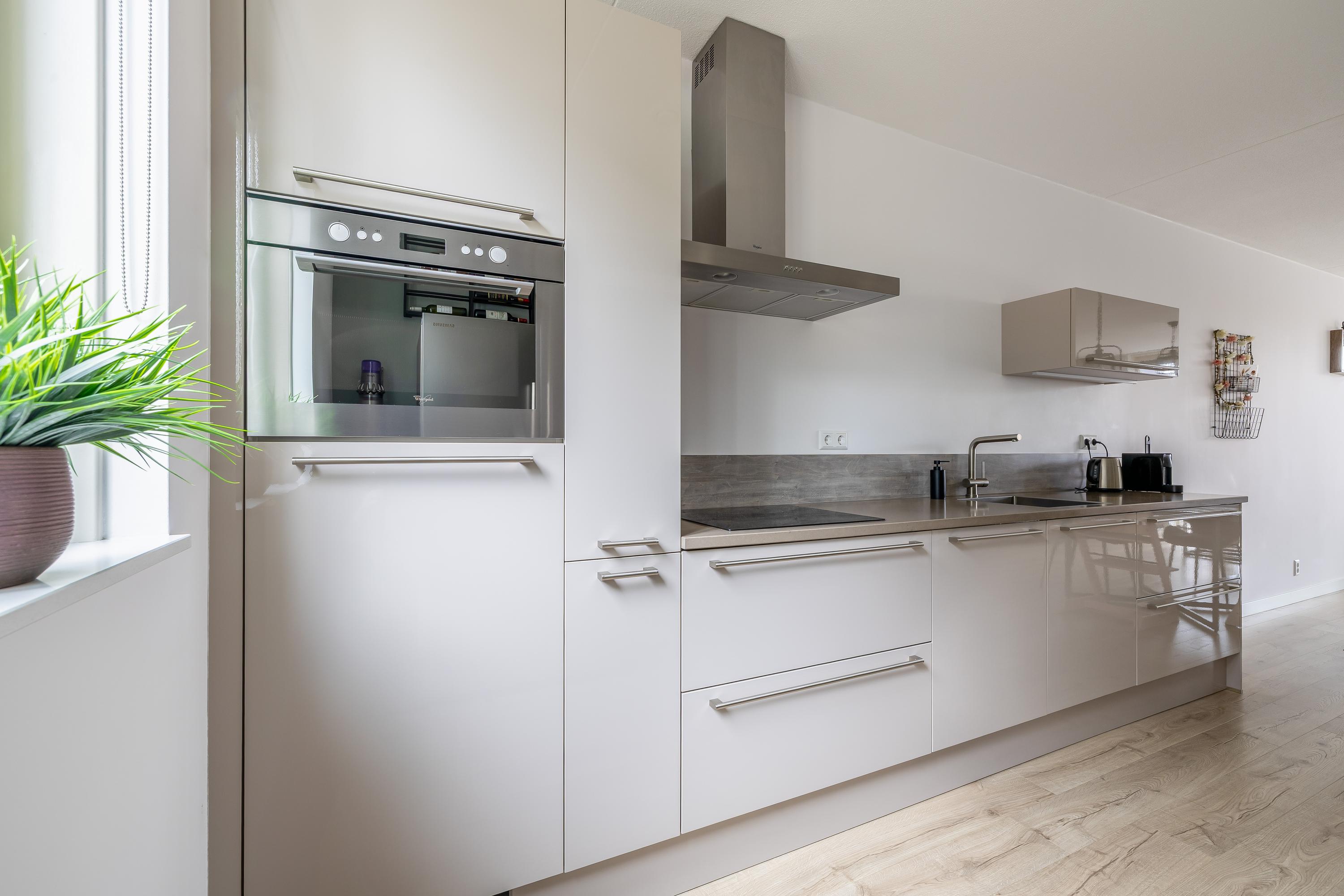 Via de hal, waar je de meterkast en een modern toilet met hangend closet en fonteintje vindt, stap je de uitgebouwde woonkamer binnen. Deze ruimte voelt direct licht en ruim aan, dankzij de grote raampartijen, het extra zijraam en de openslaande deuren naar de tuin. De wanden zijn strak gestuct en de laminaatvloer met vloerverwarming zorgt voor een warme en comfortabele basis. Aan de voorzijde ligt de open keuken, ingericht met inbouwapparatuur zoals een inductiekookplaat, afzuigkap, combi-magnetron, vaatwasser en een losse koel-/vriescombinatie.