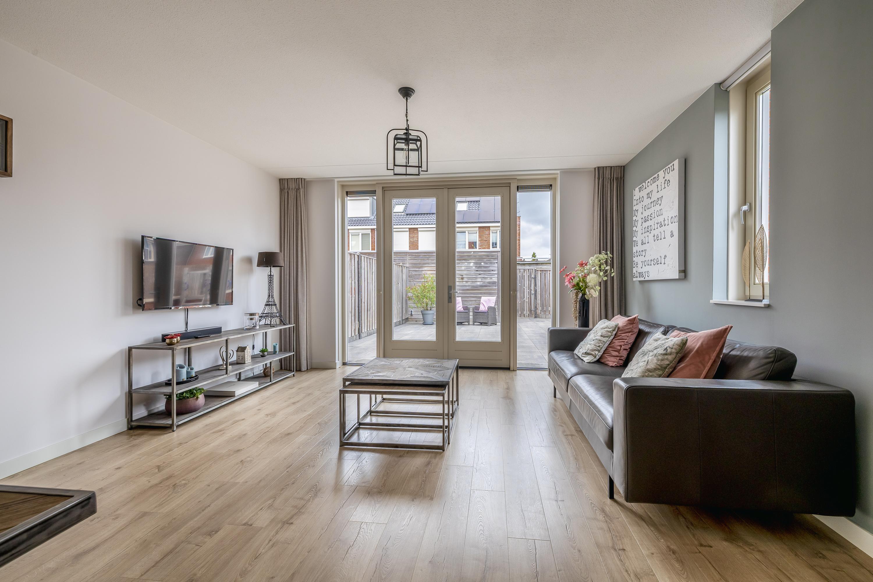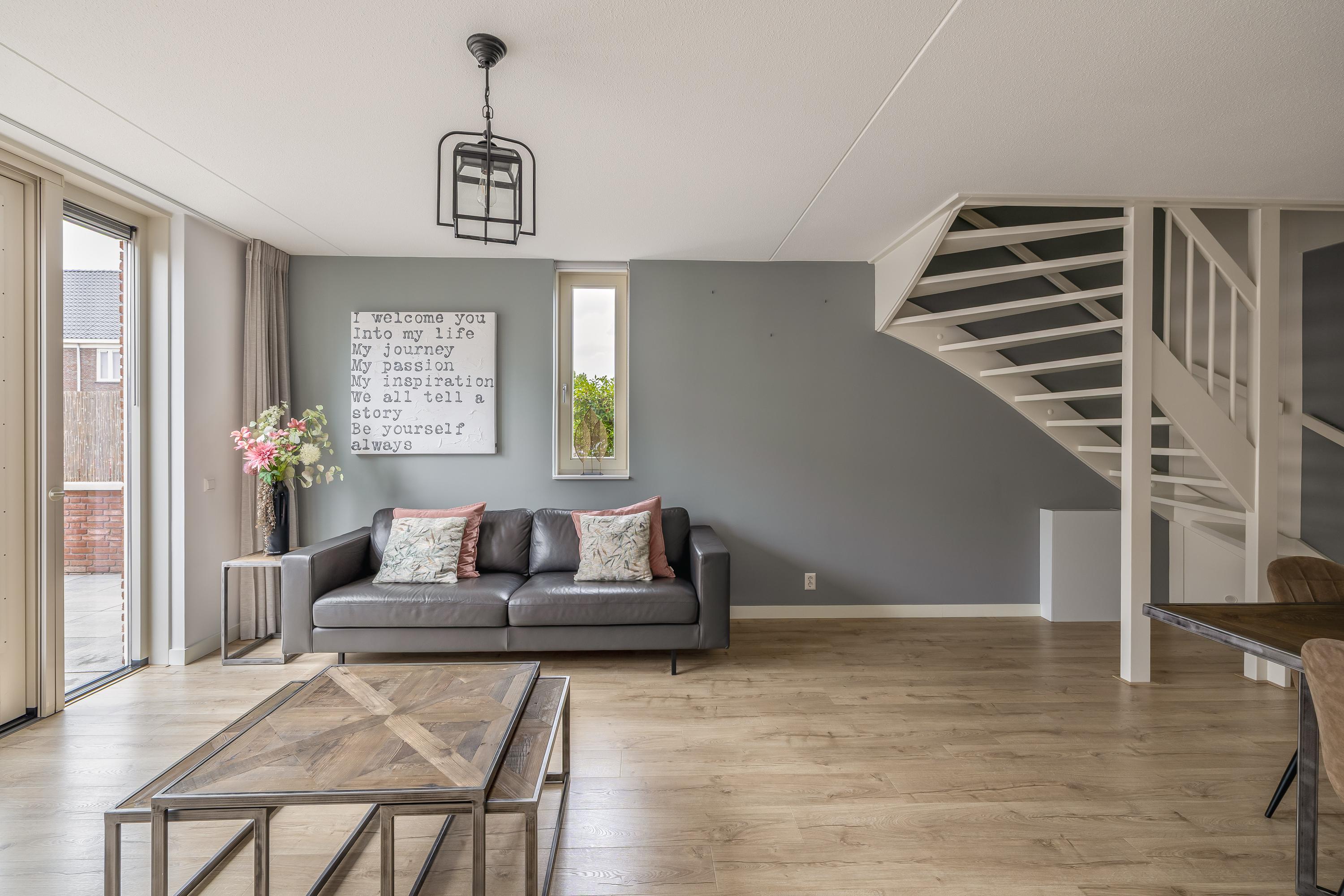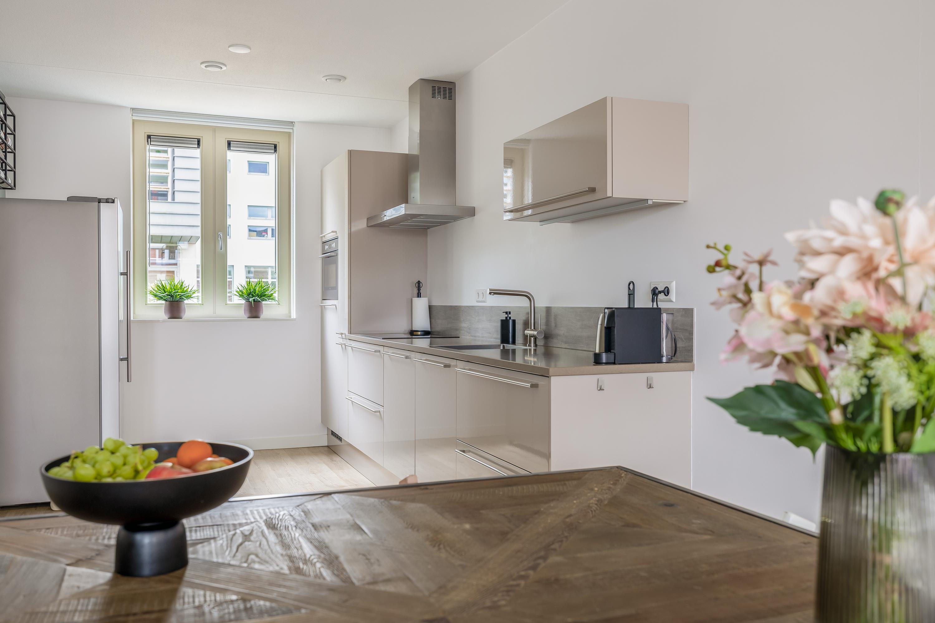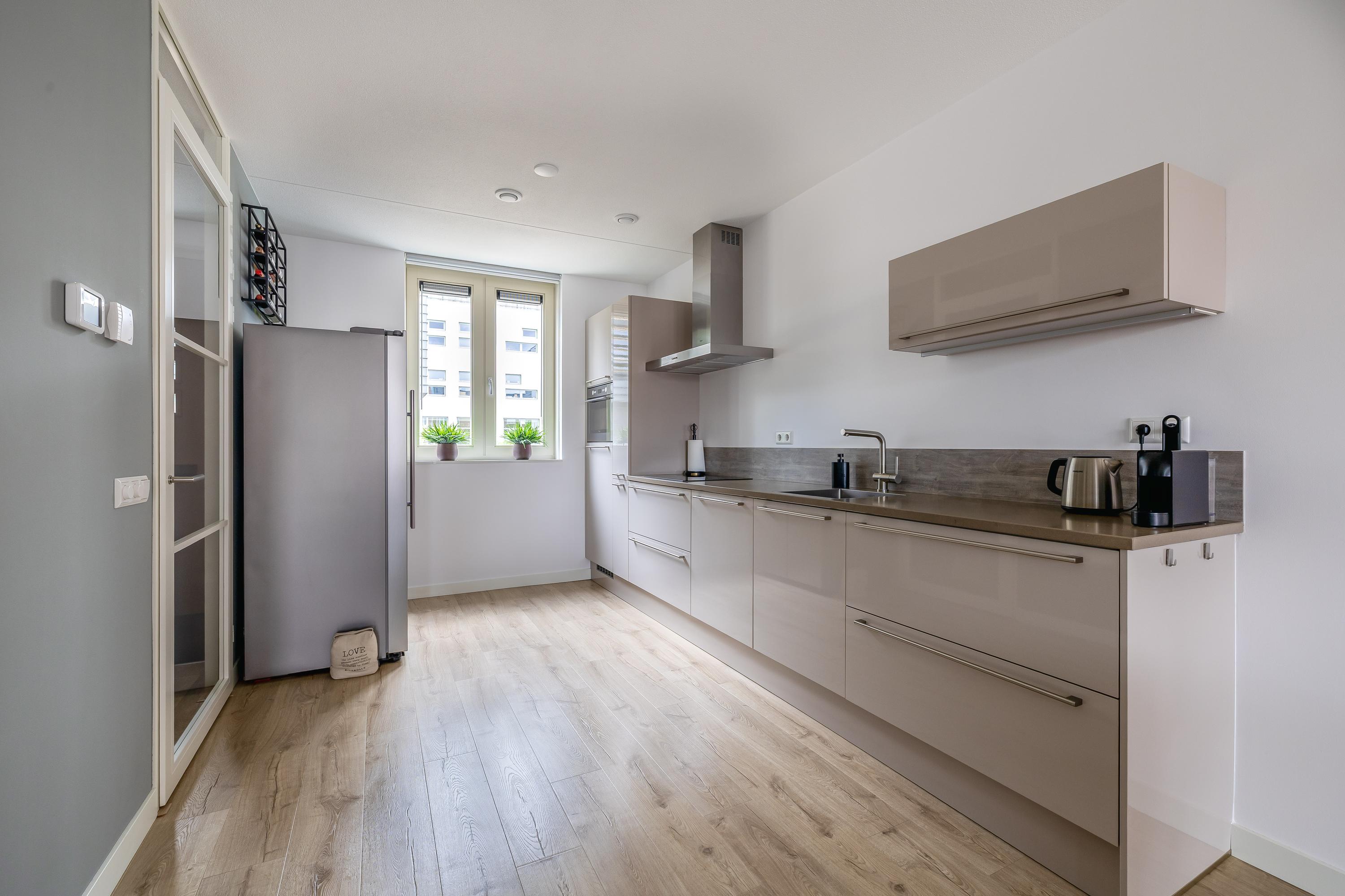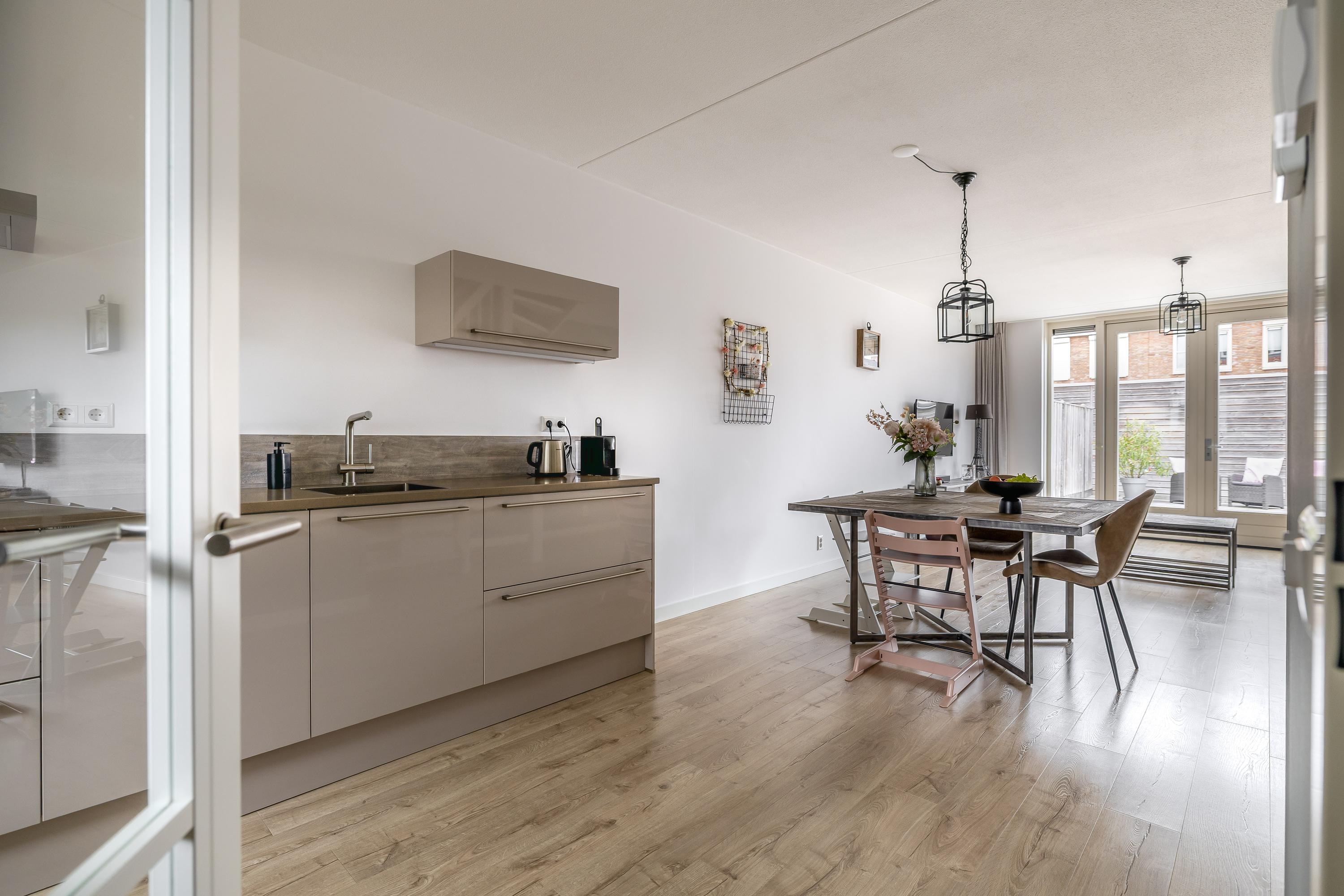 Via de hal, waar je de meterkast en een modern toilet met hangend closet en fonteintje vindt, stap je de uitgebouwde woonkamer binnen. Deze ruimte voelt direct licht en ruim aan, dankzij de grote raampartijen, het extra zijraam en de openslaande deuren naar de tuin. De wanden zijn strak gestuct en de laminaatvloer met vloerverwarming zorgt voor een warme en comfortabele basis. Aan de voorzijde ligt de open keuken, ingericht met inbouwapparatuur zoals een inductiekookplaat, afzuigkap, combi-magnetron, vaatwasser en een losse koel-/vriescombinatie.