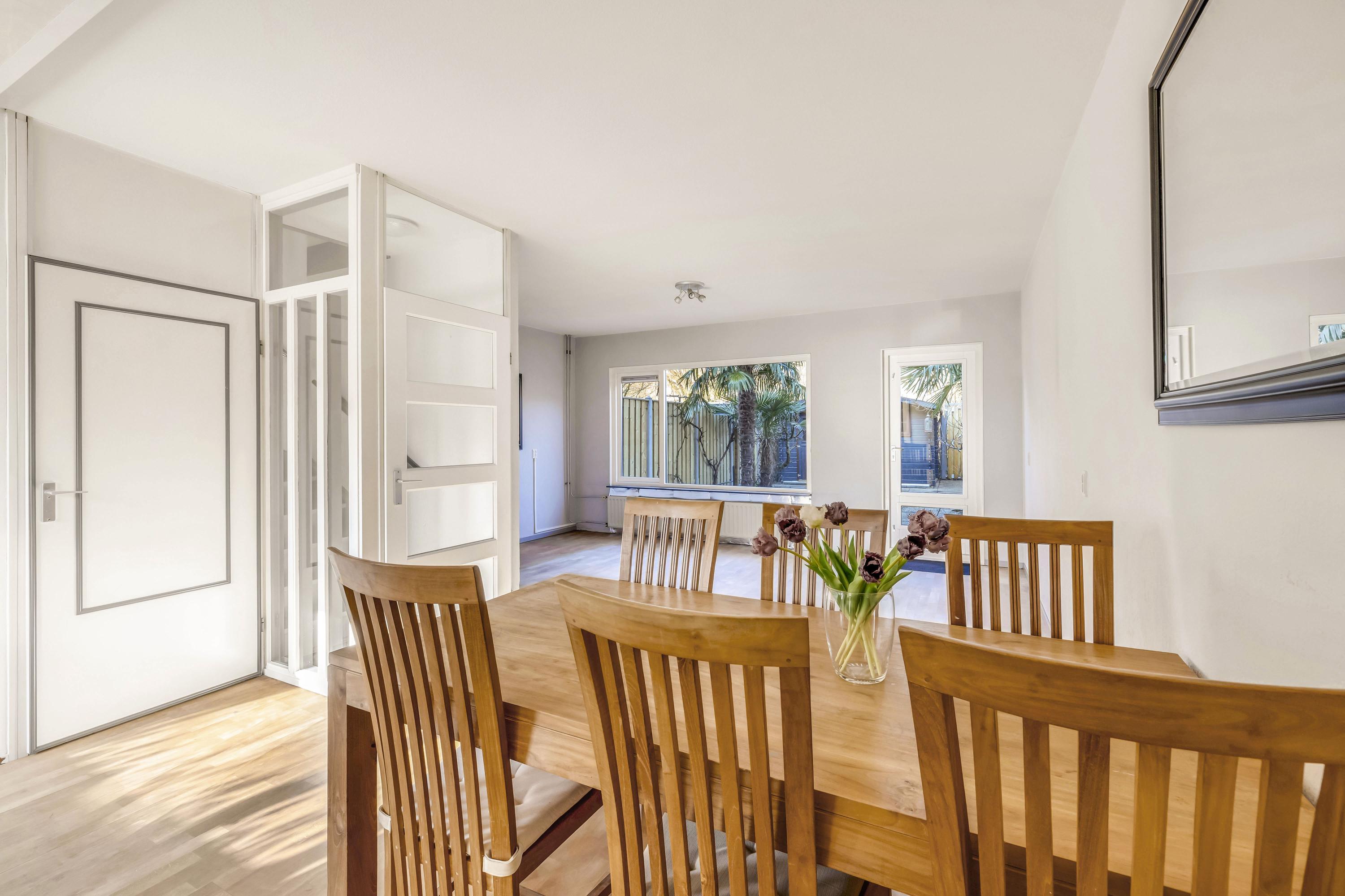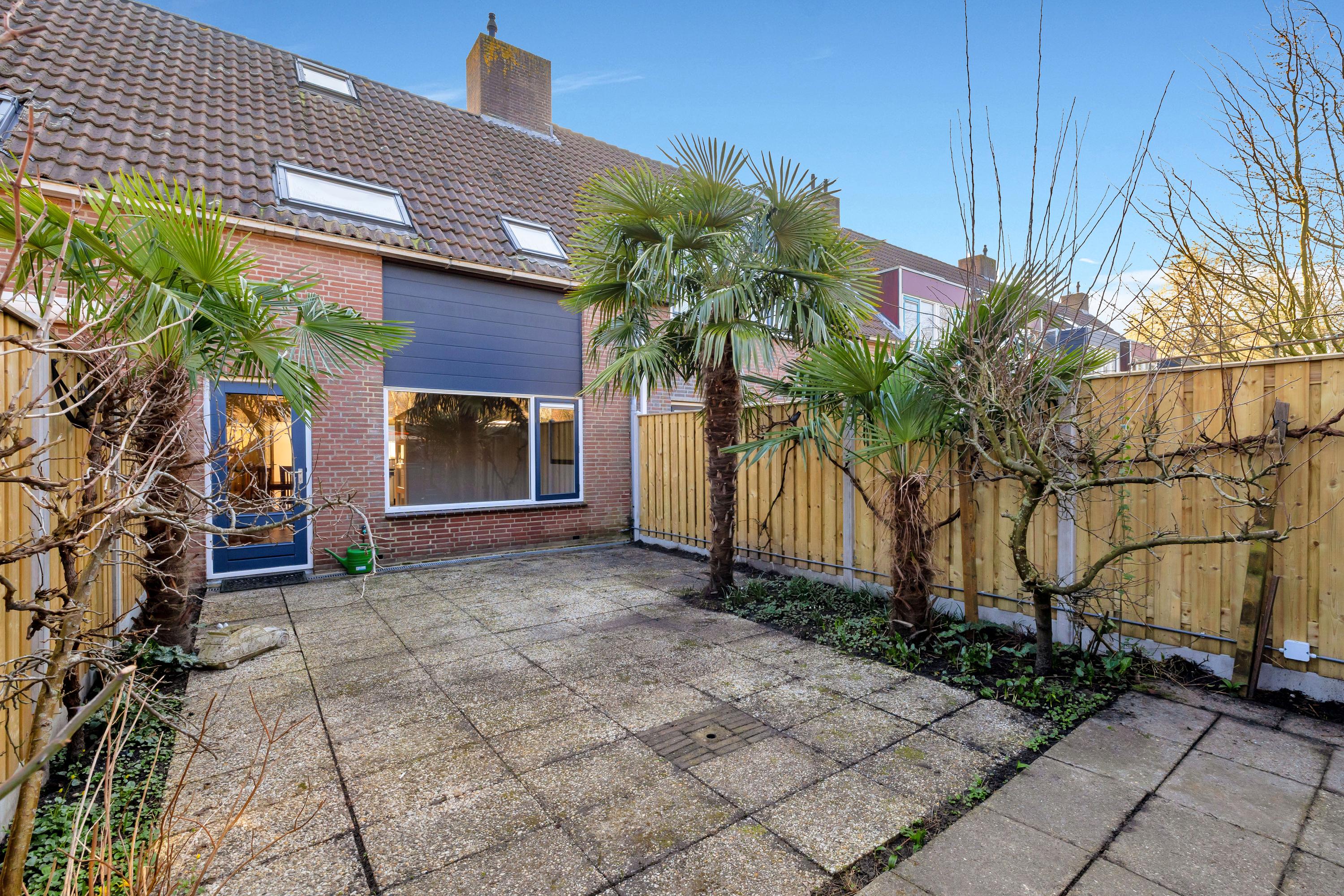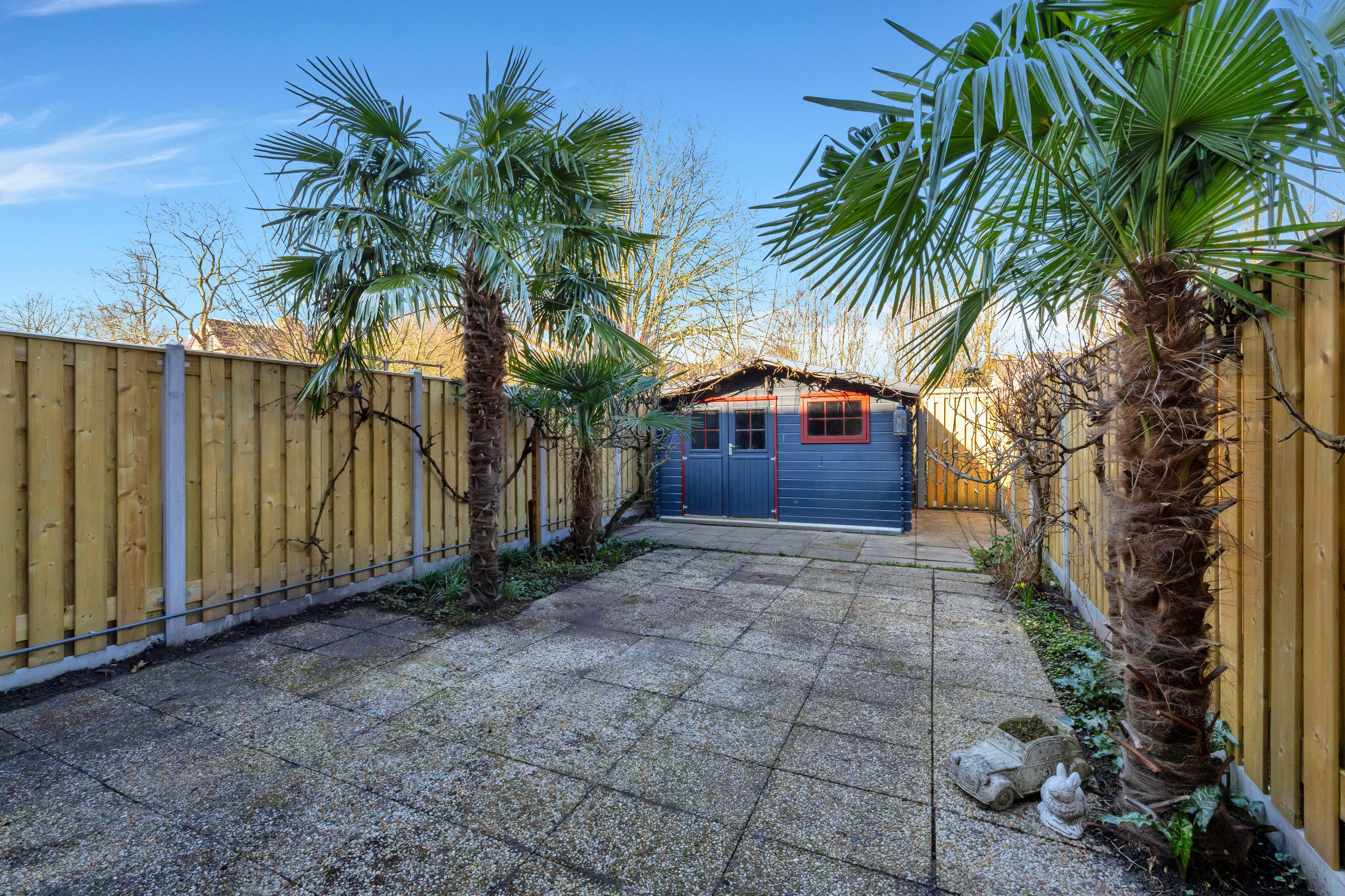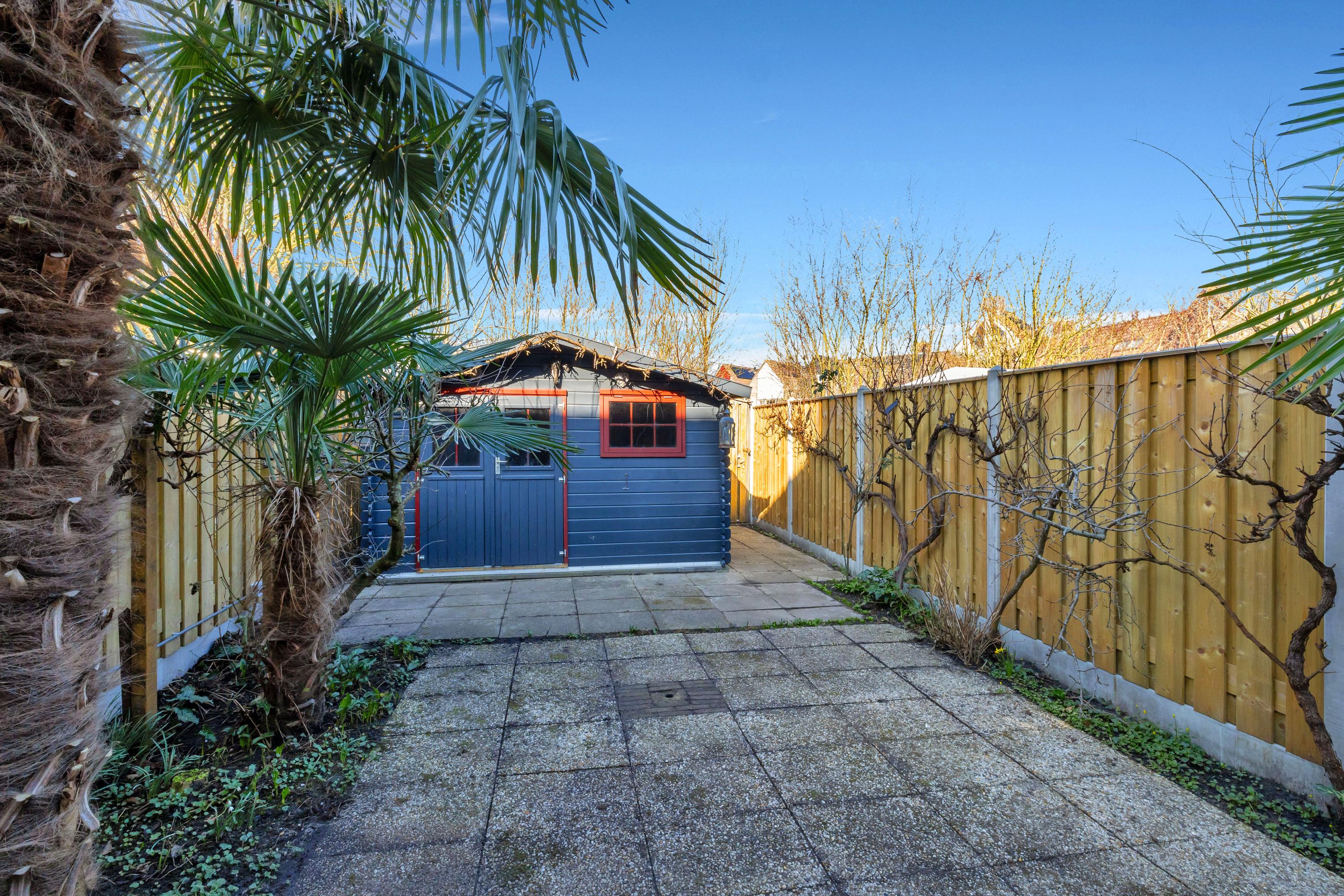 De fijne achtertuin heeft een ruim terras en via de poort is het plantsoen bereikbaar (geen officiële achterom). De schuttingen zijn vrij recent geheel vervangen. In de tuin is een grote houten tuinberging.