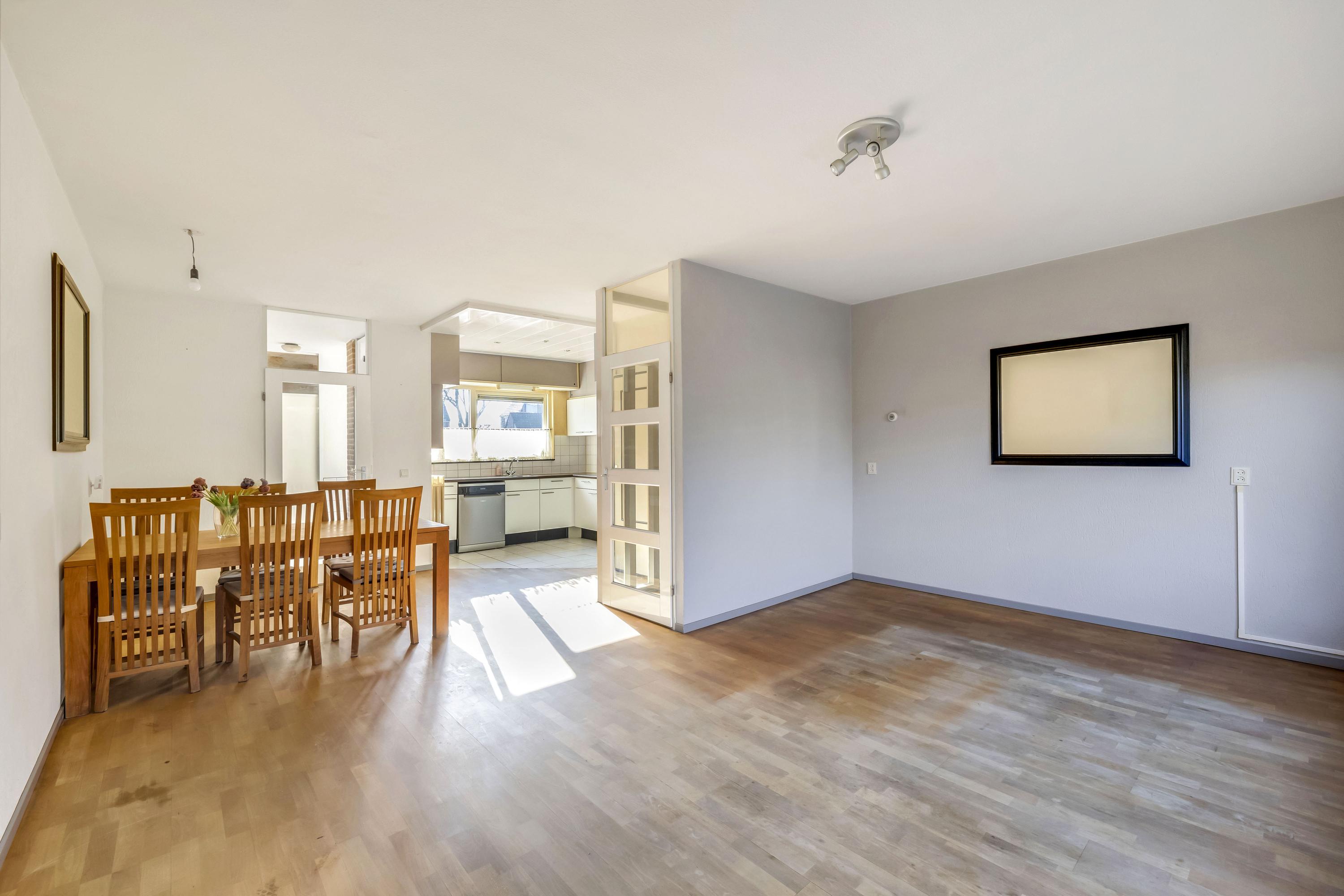 De lichte woonkamer met parketvloer heeft een deur naar de tuin. Via de tussenhal met trapopgang is de verdieping bereikbaar.