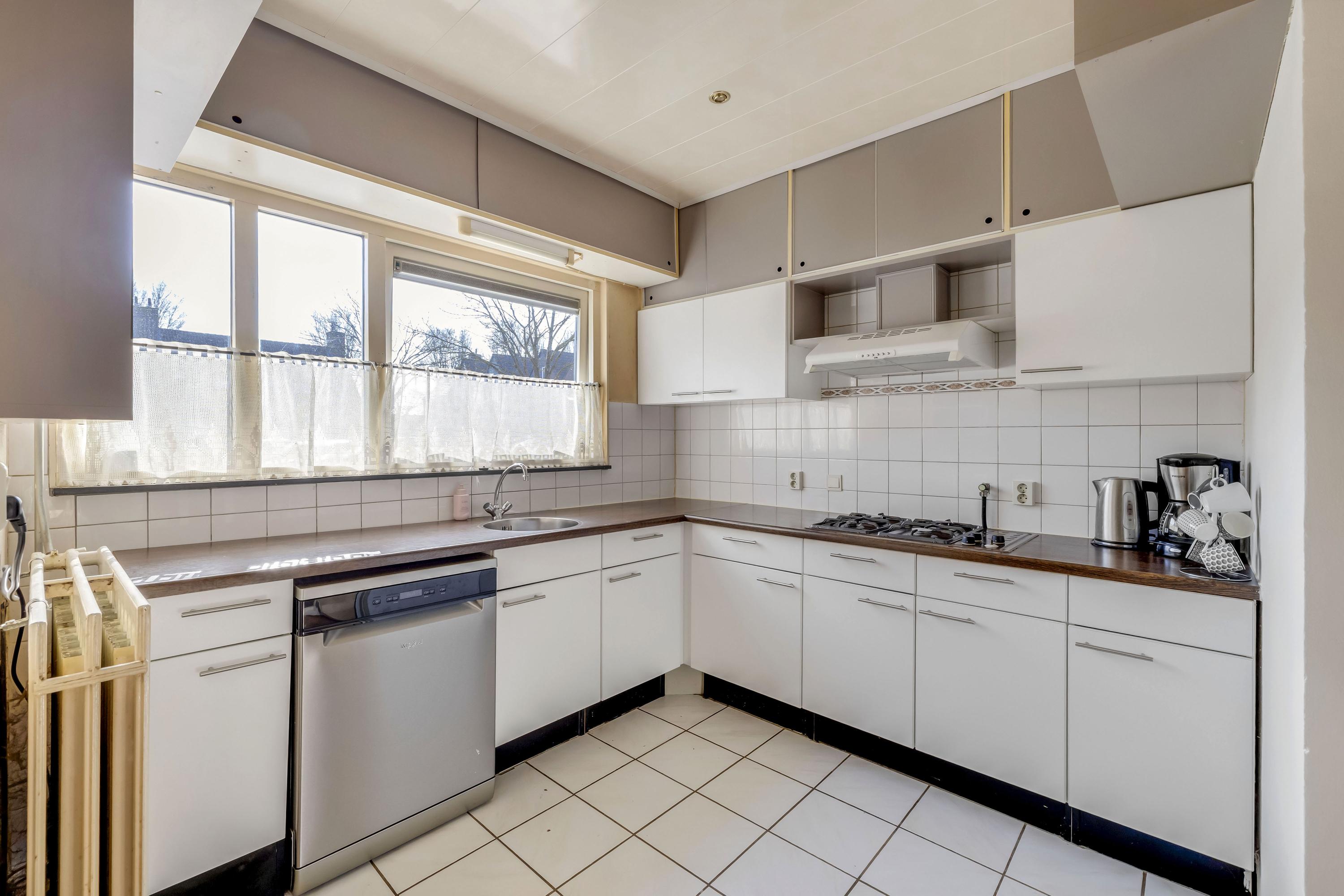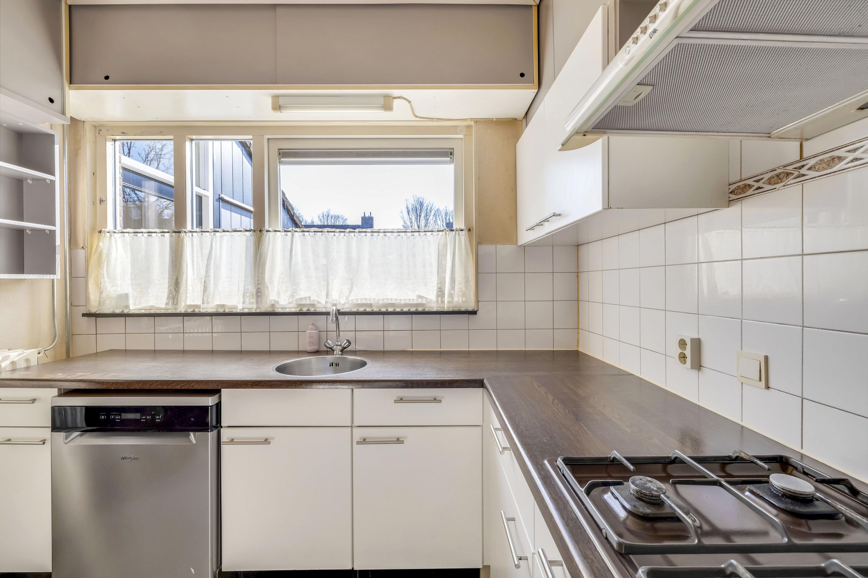 De open keuken in hoekopstelling bevindt zich aan de voorzijde van de woning. Deze eenvoudige opstelling is v.v. een vaatwasser, spoelunit, gaskookplaat en afzuigkap. In de naastgelegen trapkast is voldoende opbergruimte voor voorraad.