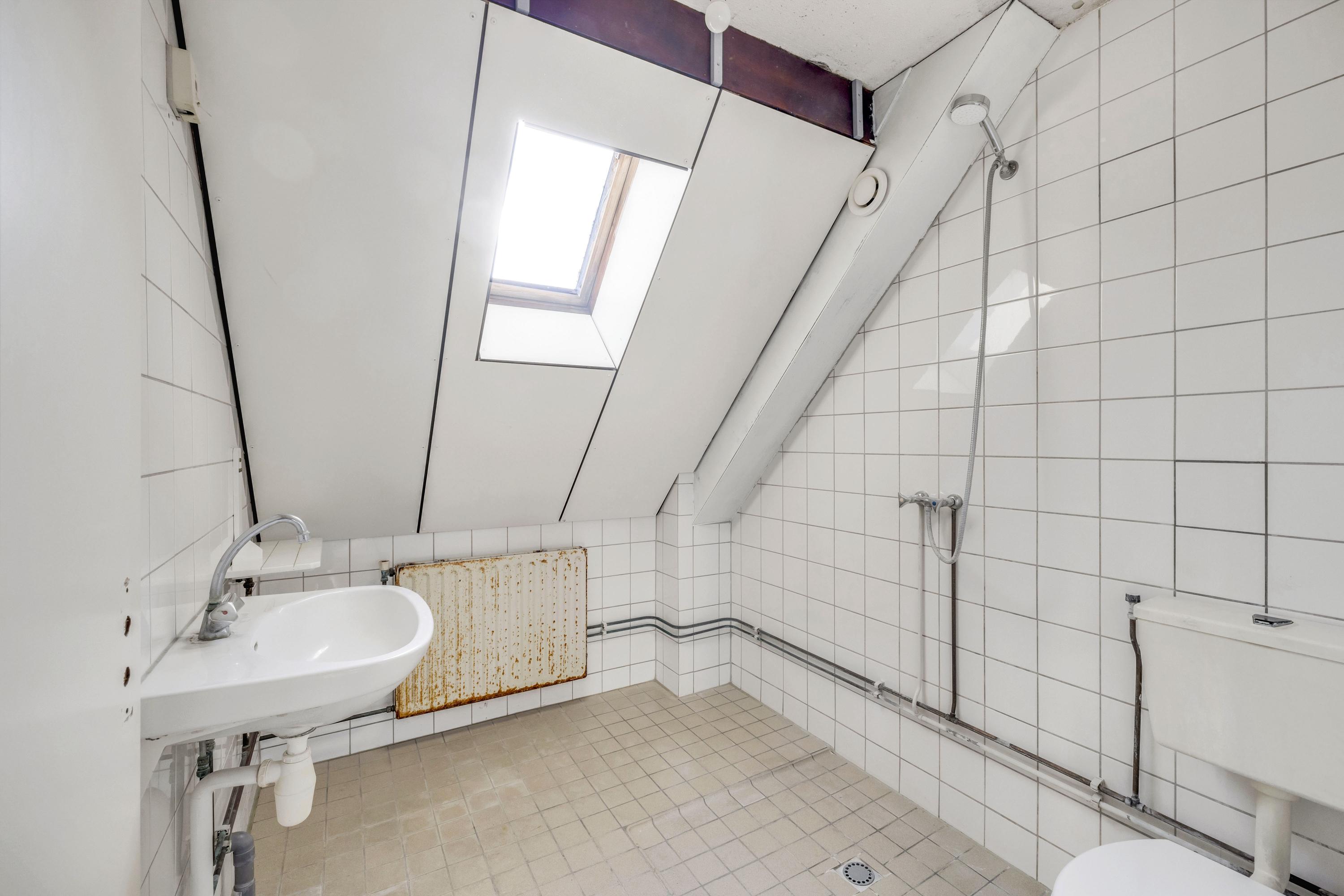 De eenvoudige badkamer beschikt over een 2e toilet, douche, wastafel en dakraam. Hier is ook een wasmachineaansluiting.