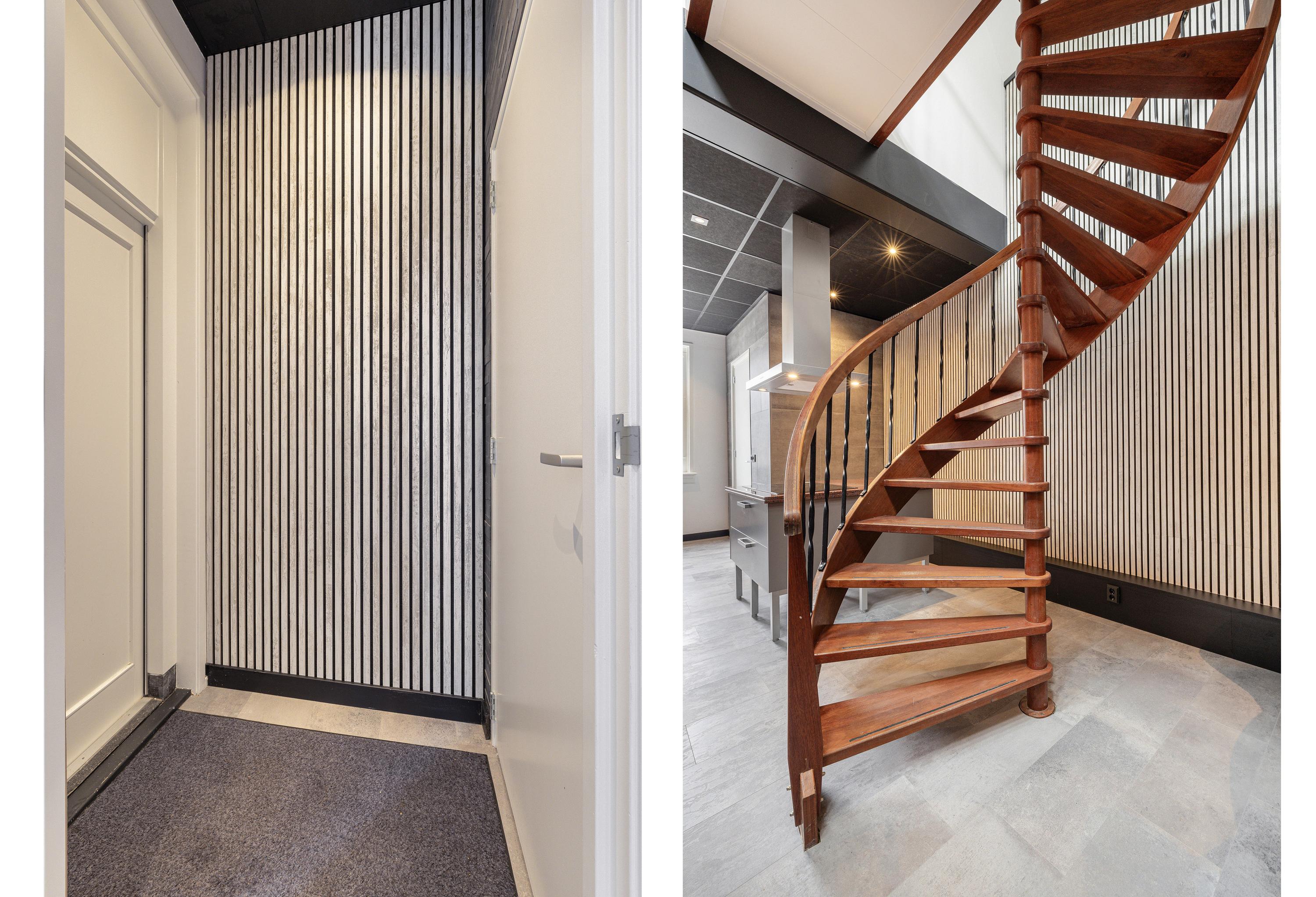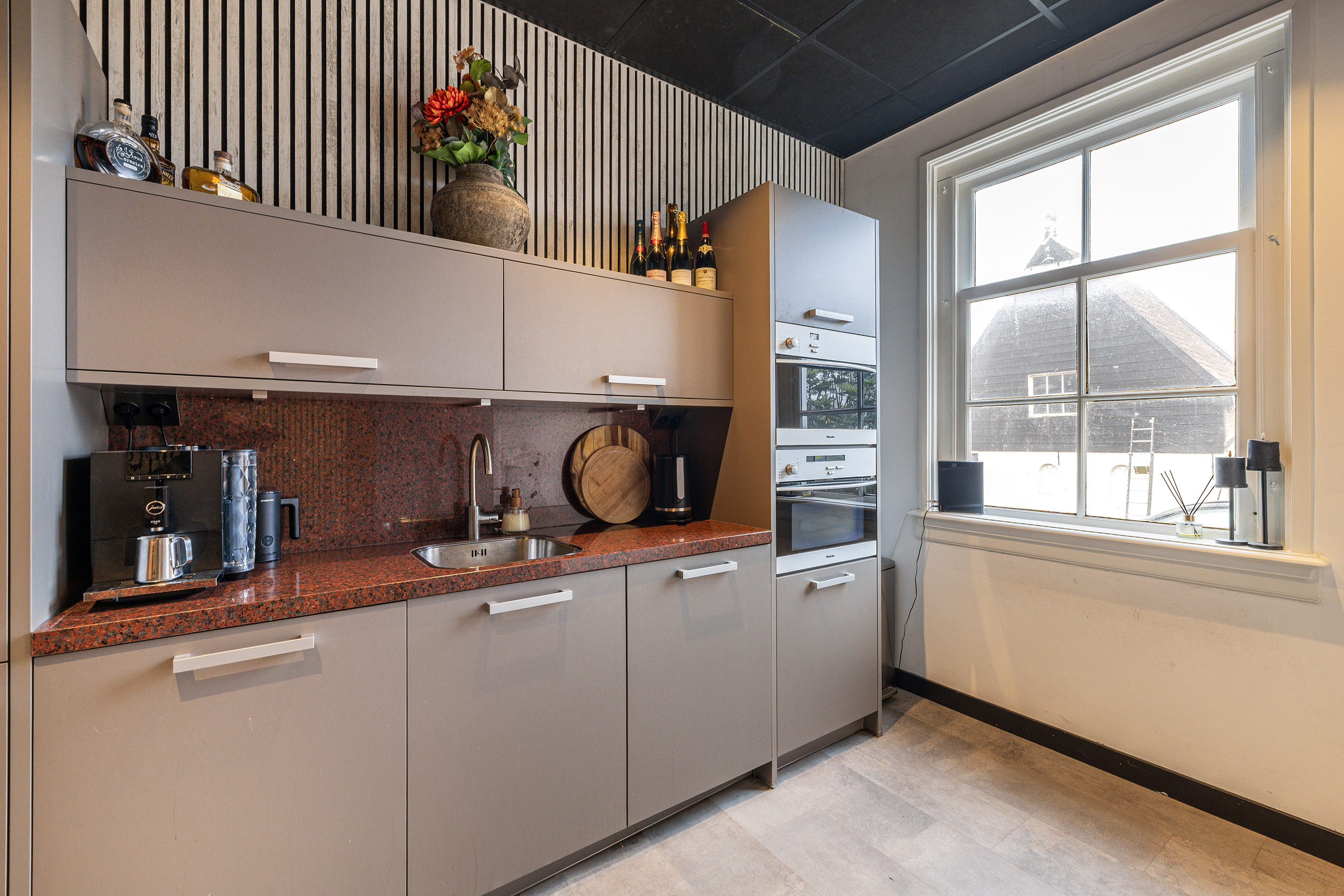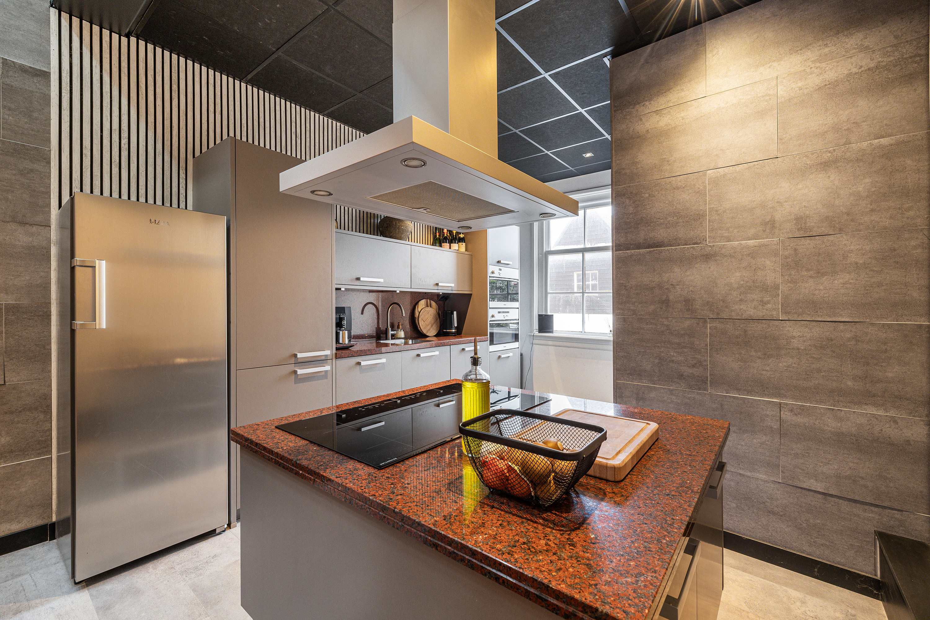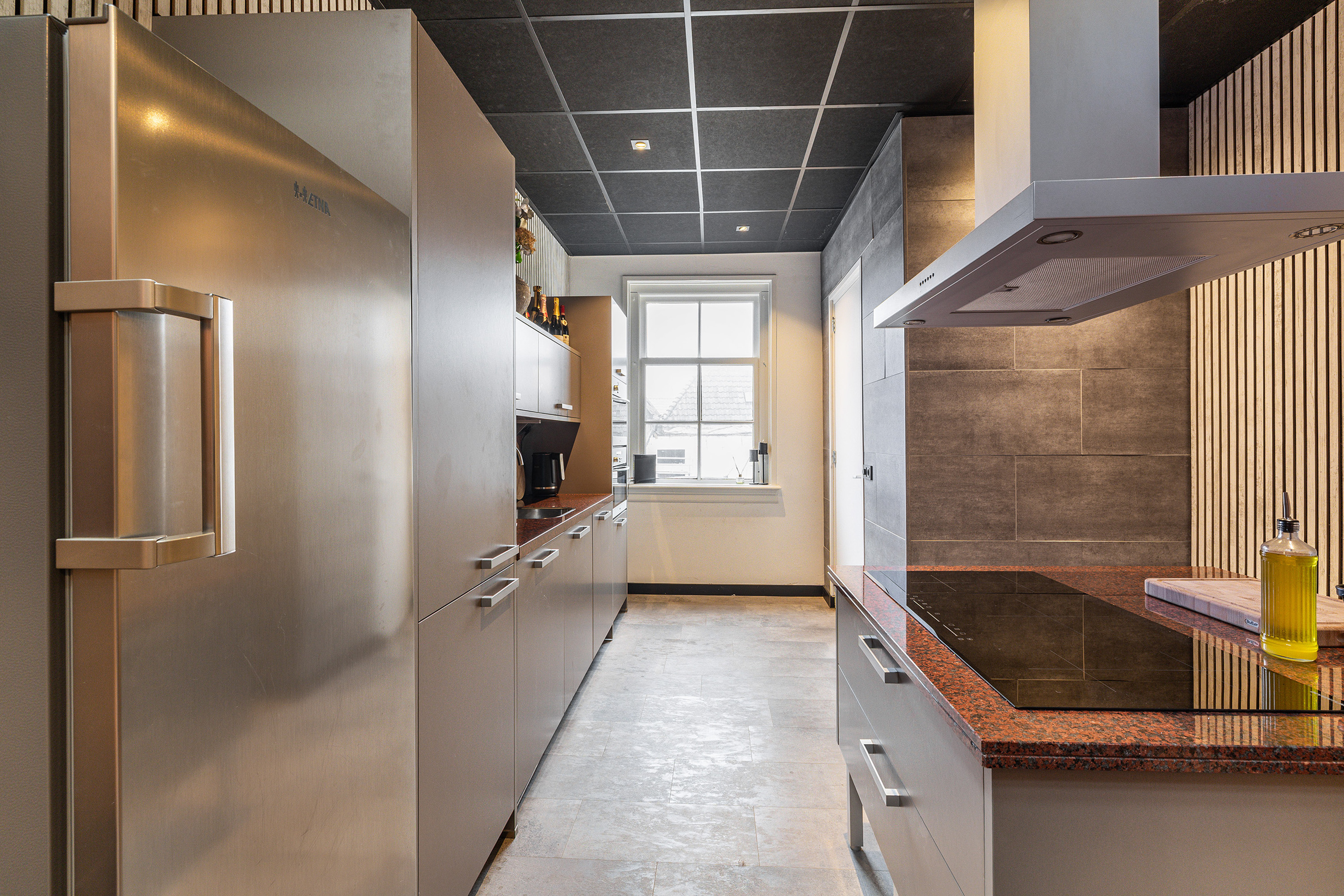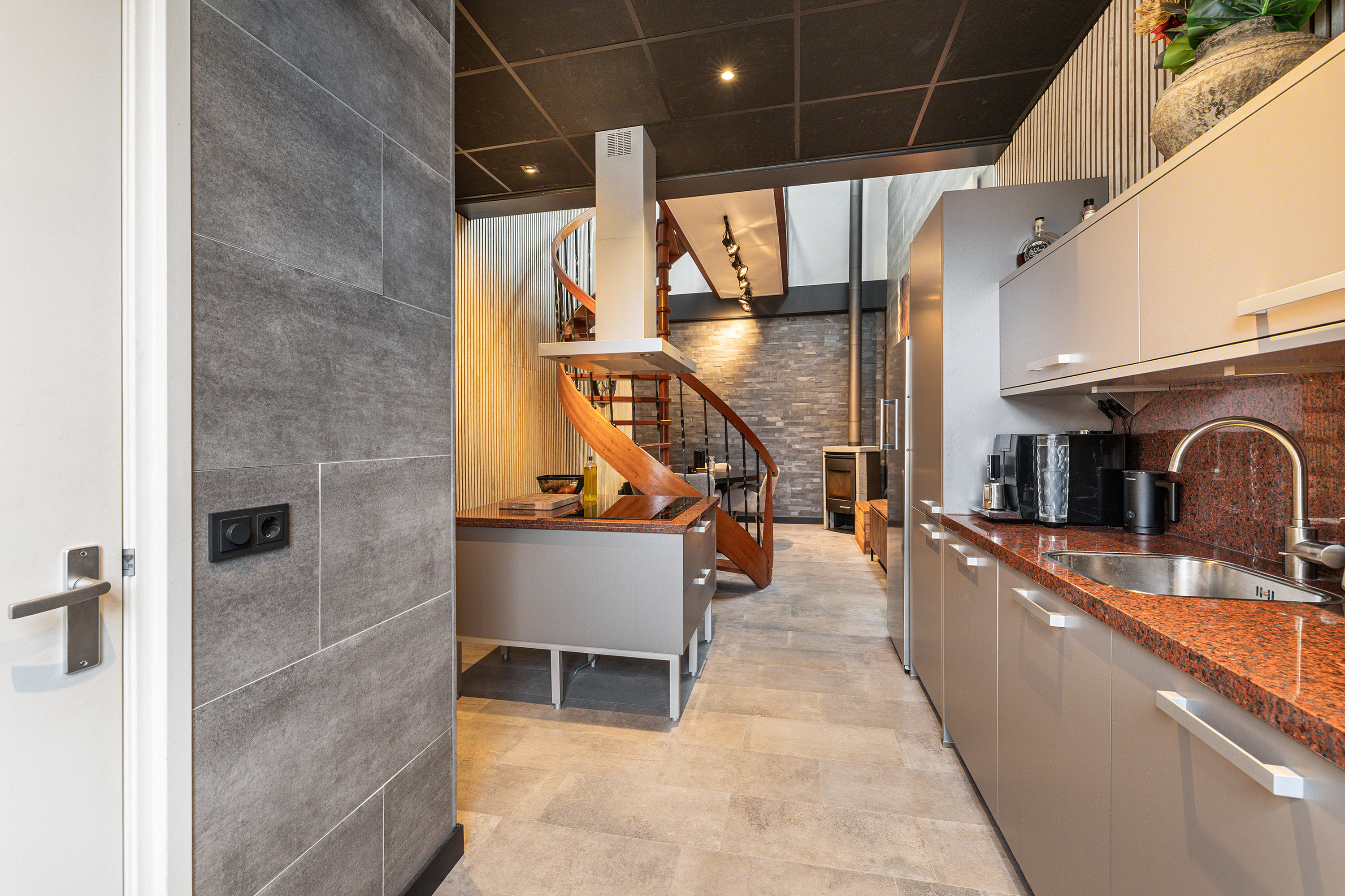 De hal/entree is voorzien van een vaste kast met meterkast en de opstelling van de elektrische boiler 80L (Ariston, 2024). Vanuit de entree kom je in de royale woonkeuken (2024), deze bestaat uit een wandopstelling en een kookeiland. De keuken is voorzien van hoogwaardige inbouwapparatuur, waaronder een inductiekookplaat, close-in boiler (10L), afzuigkap, vaatwasser, koelkast, combi-oven en stoomoven. De woonkeuken heeft veel lichtinval door de vide en dakramen, daarnaast is hier een eethoek met een sfeervolle houtkachel en een elektrisch verwarmingspaneel. Via de spiltrap bereik je de eerste verdieping. De vloer is afgewerkt met een nette pvc vloer.