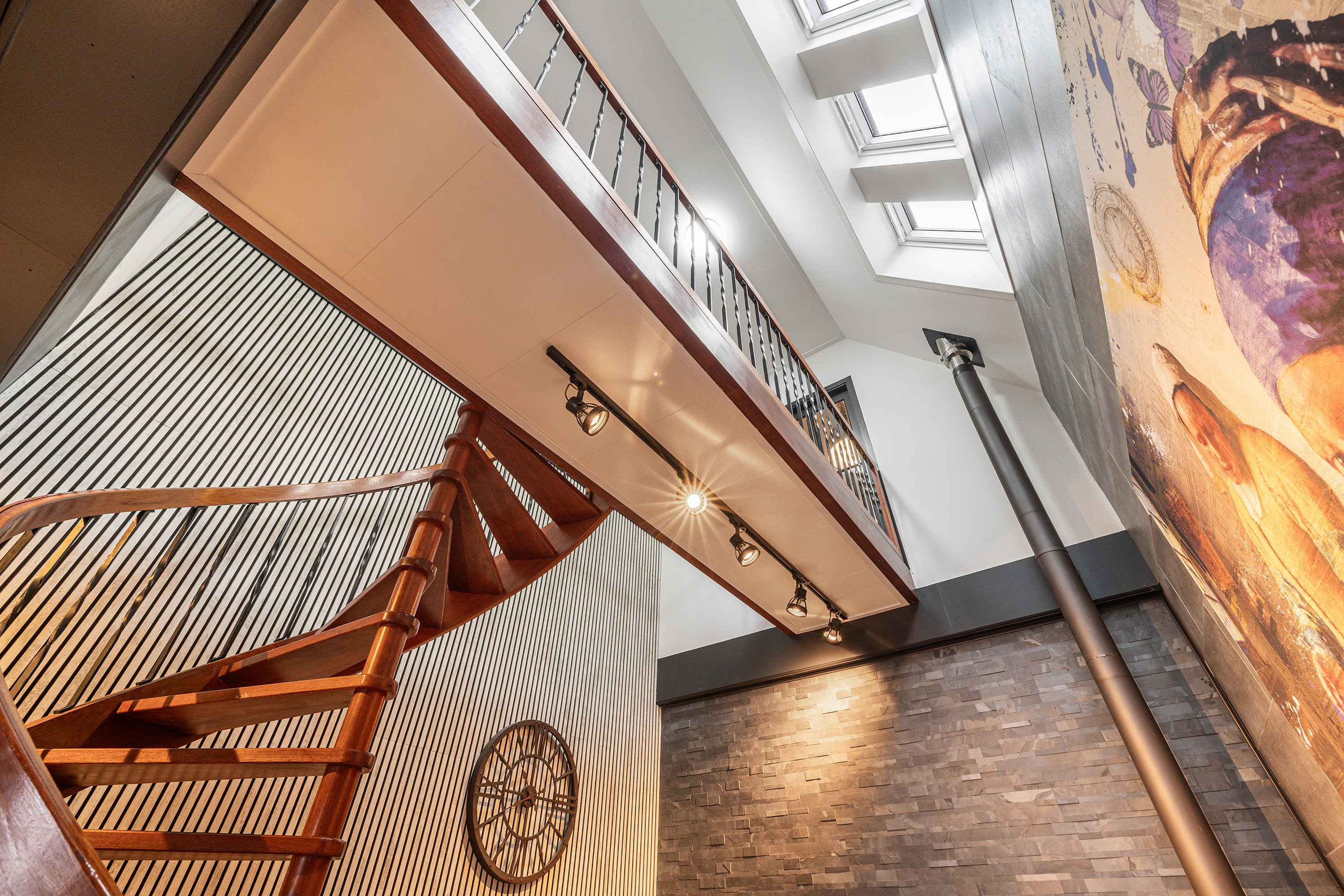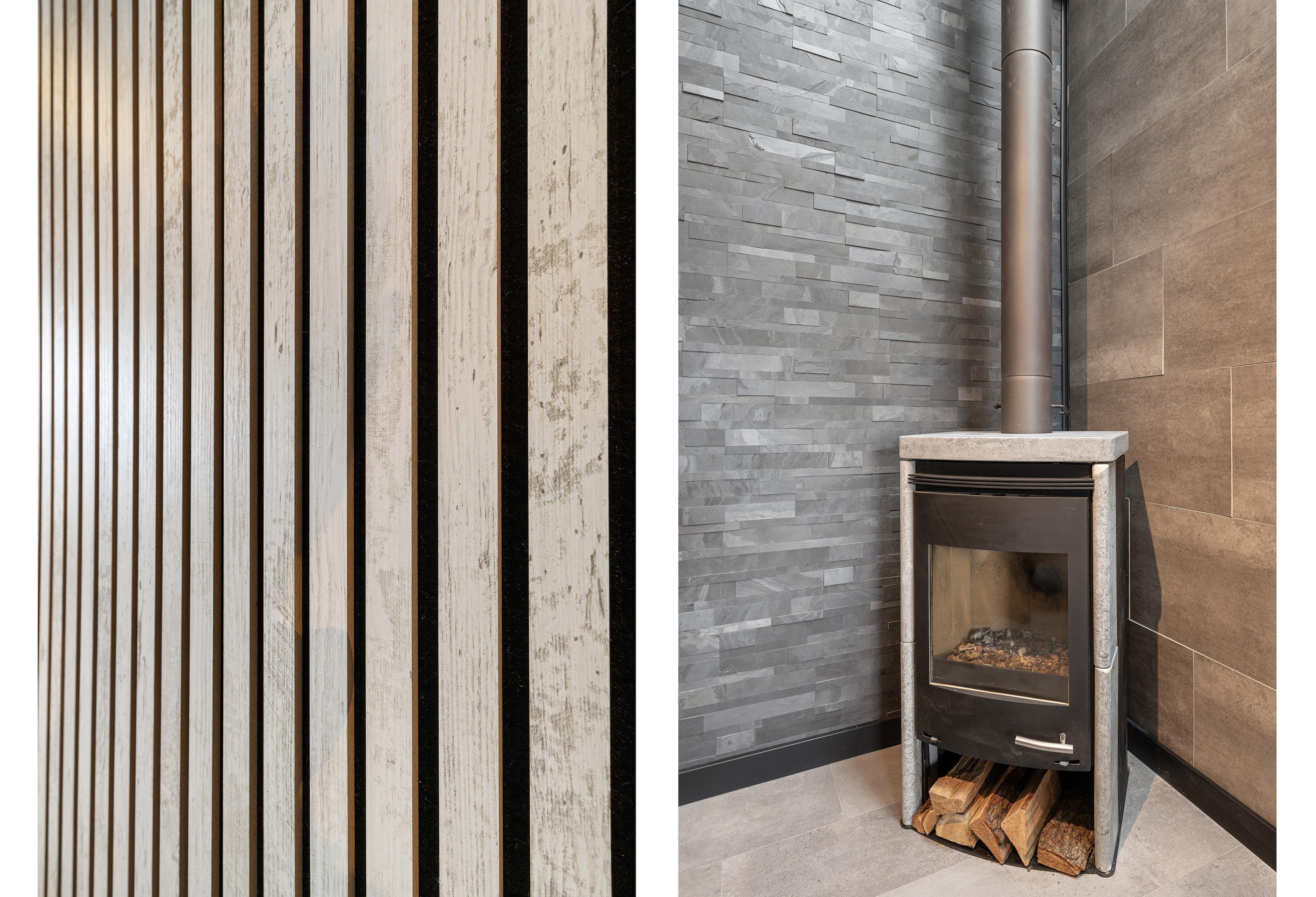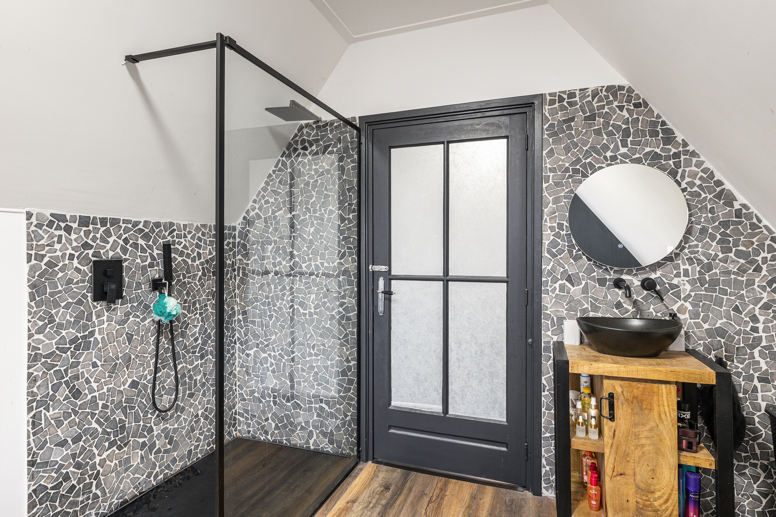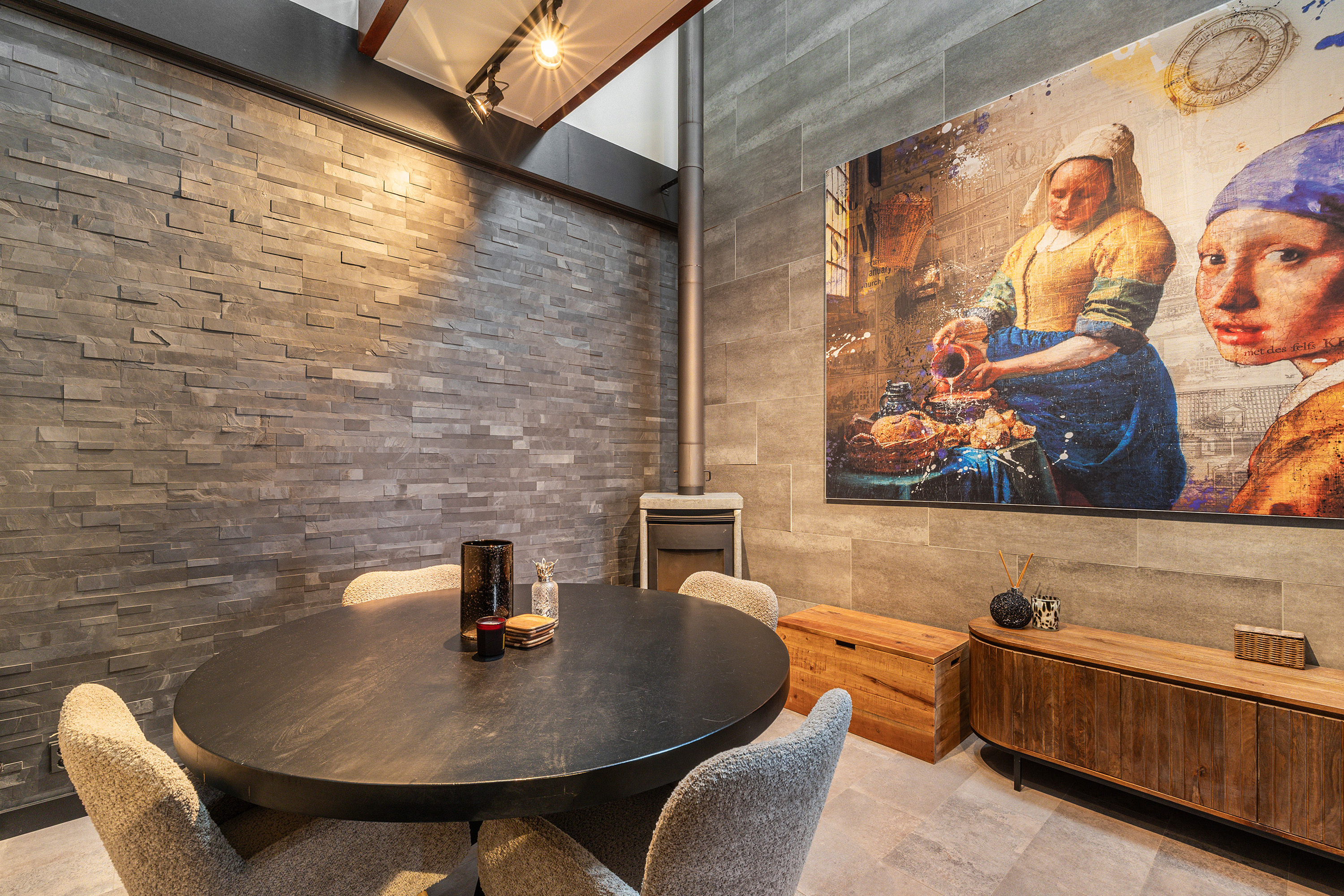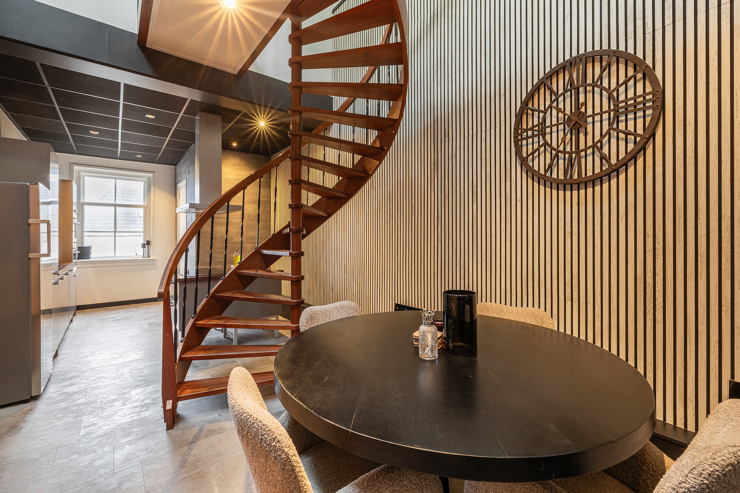 De hal/entree is voorzien van een vaste kast met meterkast en de opstelling van de elektrische boiler 80L (Ariston, 2024). Vanuit de entree kom je in de royale woonkeuken (2024), deze bestaat uit een wandopstelling en een kookeiland. De keuken is voorzien van hoogwaardige inbouwapparatuur, waaronder een inductiekookplaat, close-in boiler (10L), afzuigkap, vaatwasser, koelkast, combi-oven en stoomoven. De woonkeuken heeft veel lichtinval door de vide en dakramen, daarnaast is hier een eethoek met een sfeervolle houtkachel en een elektrisch verwarmingspaneel. Via de spiltrap bereik je de eerste verdieping. De vloer is afgewerkt met een nette pvc vloer.