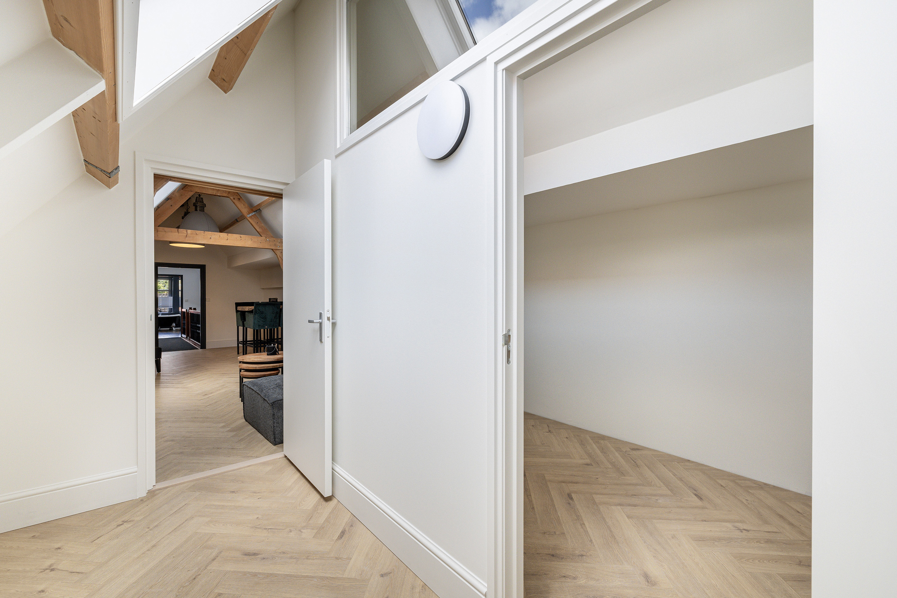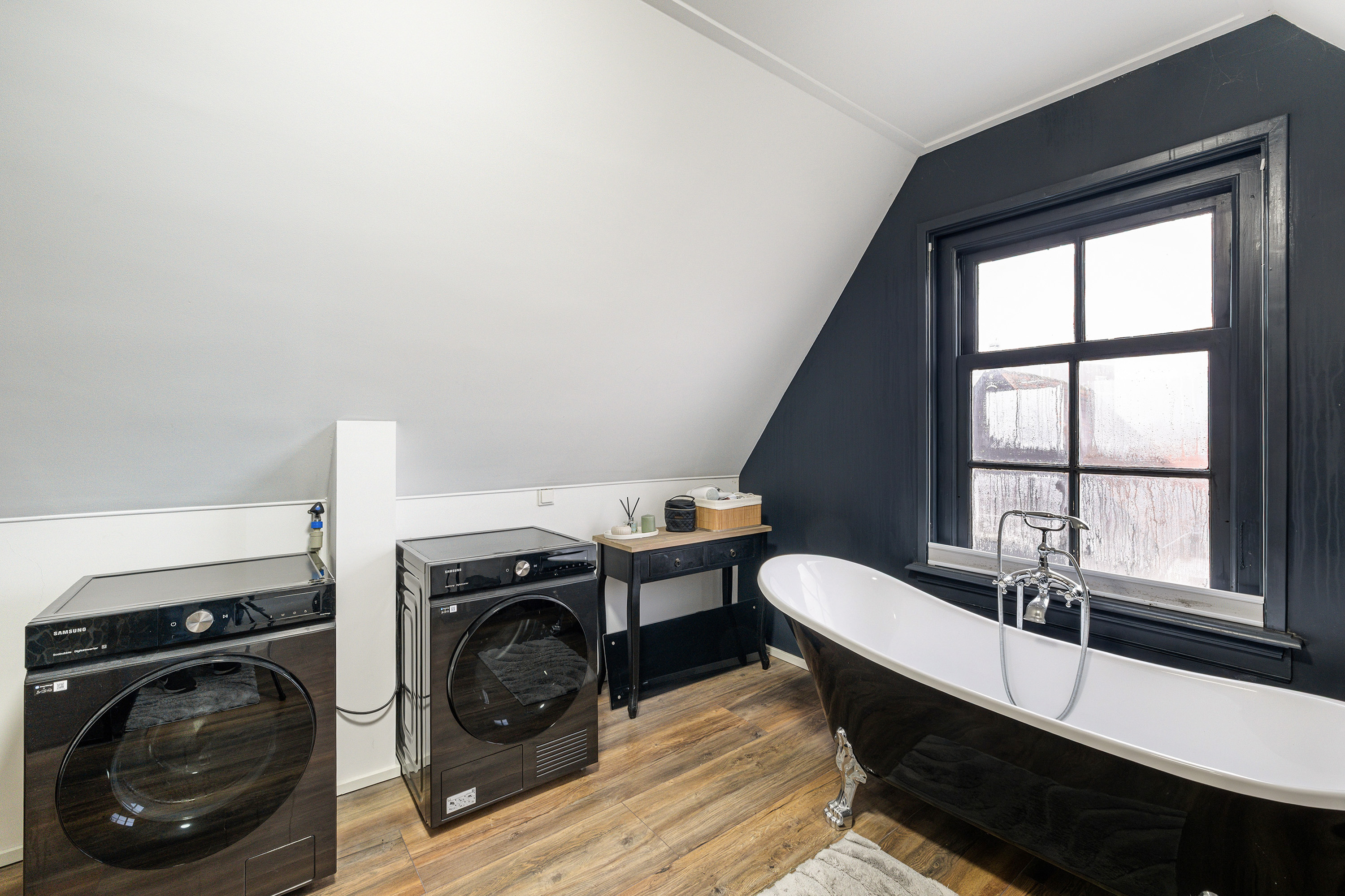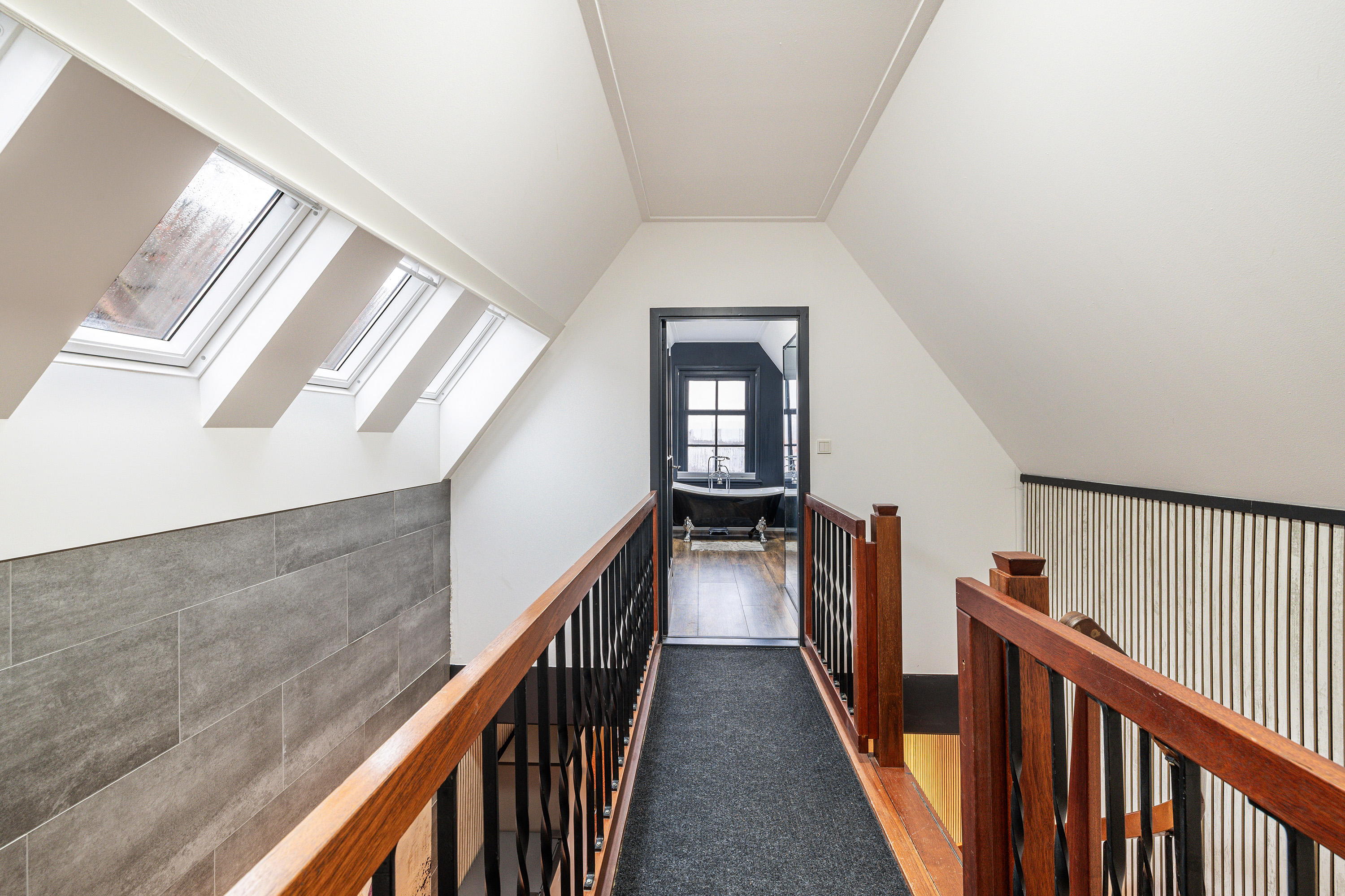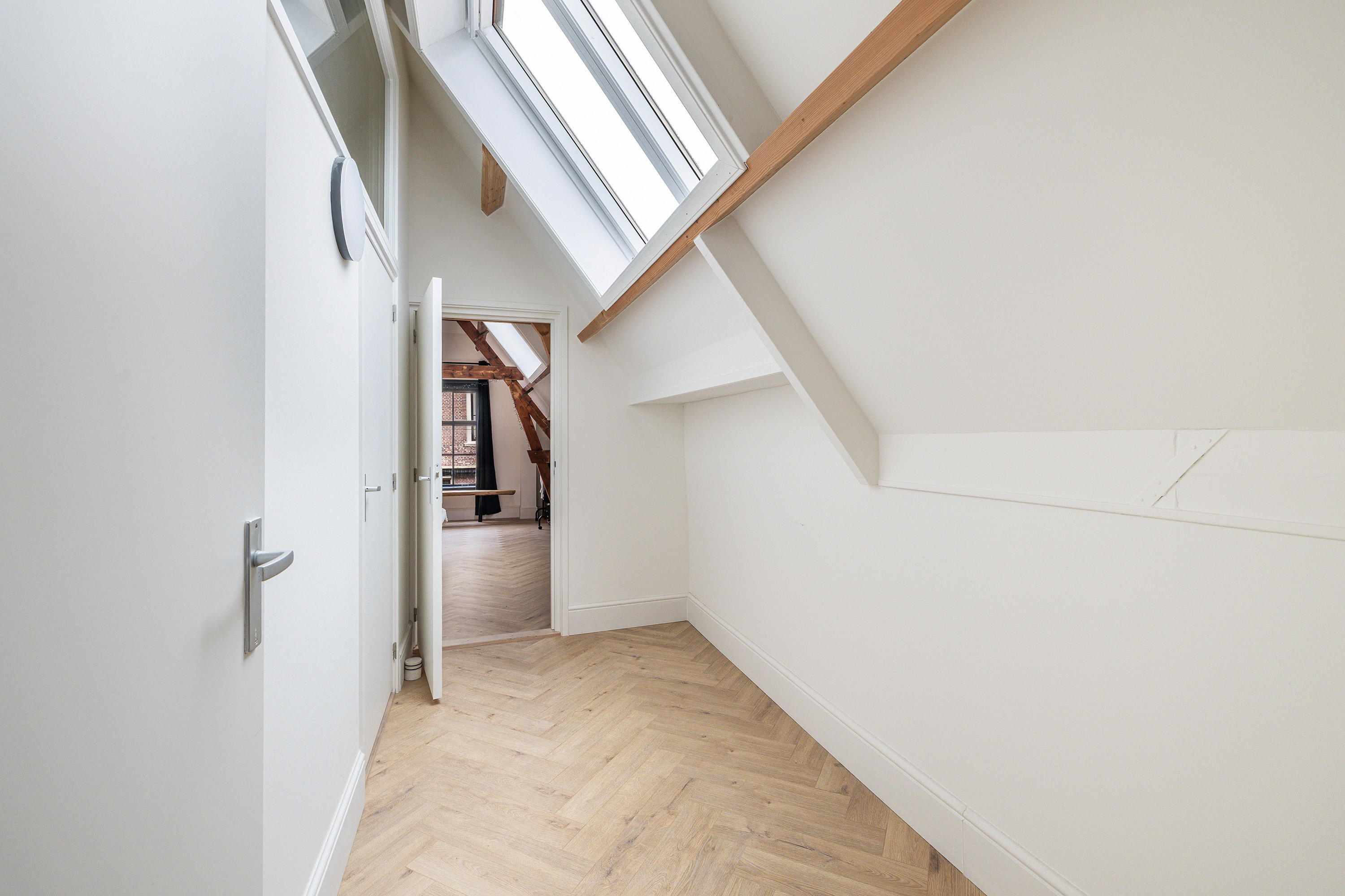 Vanaf de overloop met vide ervaar je direct het extra ruimtelijke gevoel en fijne lichtinval. Je loopt door naar de ruime woonkamer, waar de visgraat laminaat vloer, hoge plinten en zichtbare balken samen met de dakramen zorgen voor een sfeervol en licht geheel. Verder is de woonkamer voorzien van airconditioning. Vanuit de woonkamer bereik je via een gang met dakramen de 2 slaapkamers. Aan de achterzijde bevindt zich de royale hoofdslaapkamer, gelegen aan de Nobelstraat en voorzien van dakramen, een kopgevelraam en airconditioning. De tweede slaapkamer is veelzijdig te gebruiken. Aan de voorzijde bereik je via de overloop de ruime badkamer. De badkamer is compleet uitgevoerd met een inloopdouche, een ligbad met uitzicht naar buiten, een wastafelmeubel, toilet en wasmachine- en drogeraansluitingen. De badkamer is te verwarmen middels een elektrisch verwarmingspaneel.
