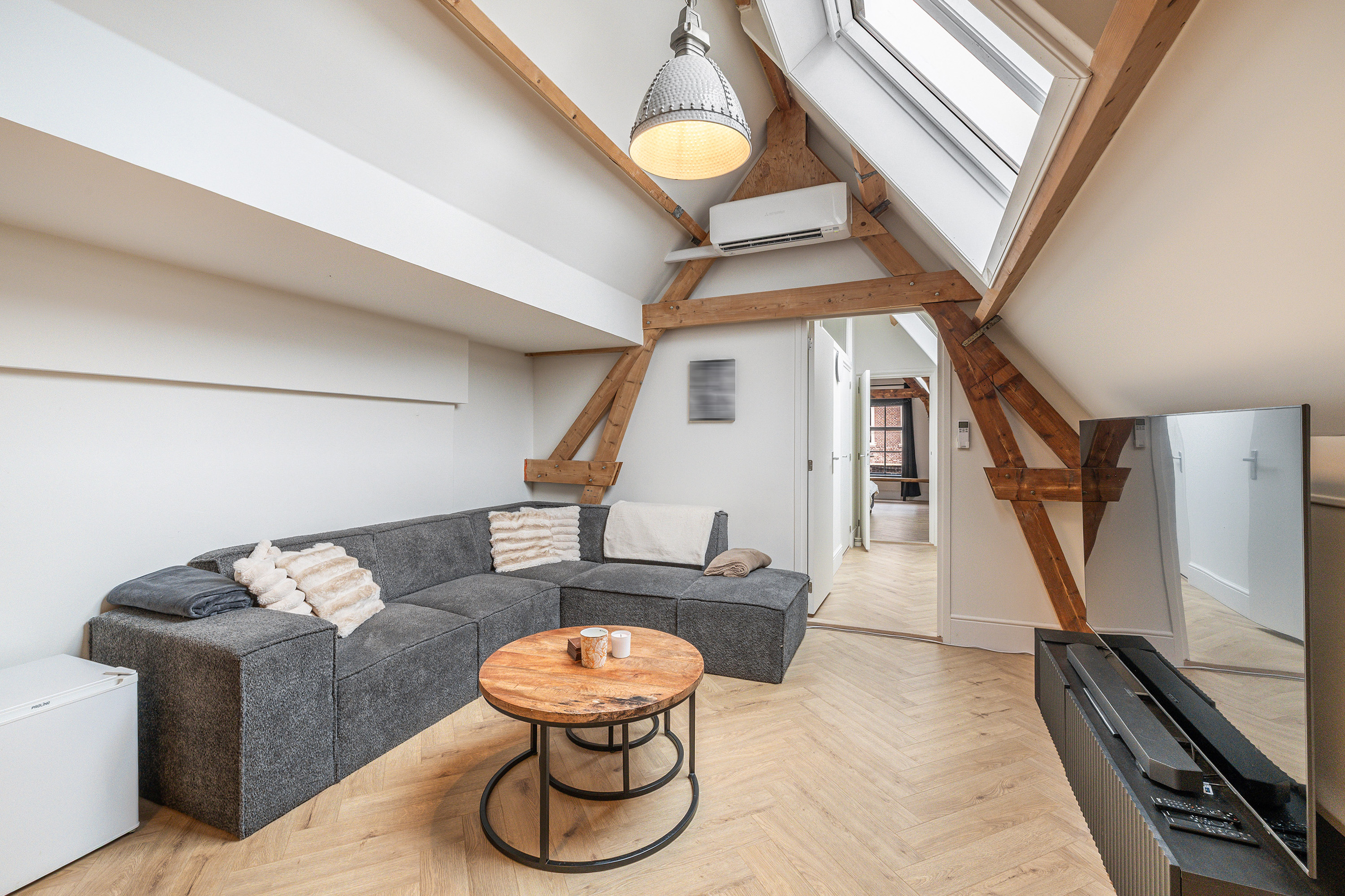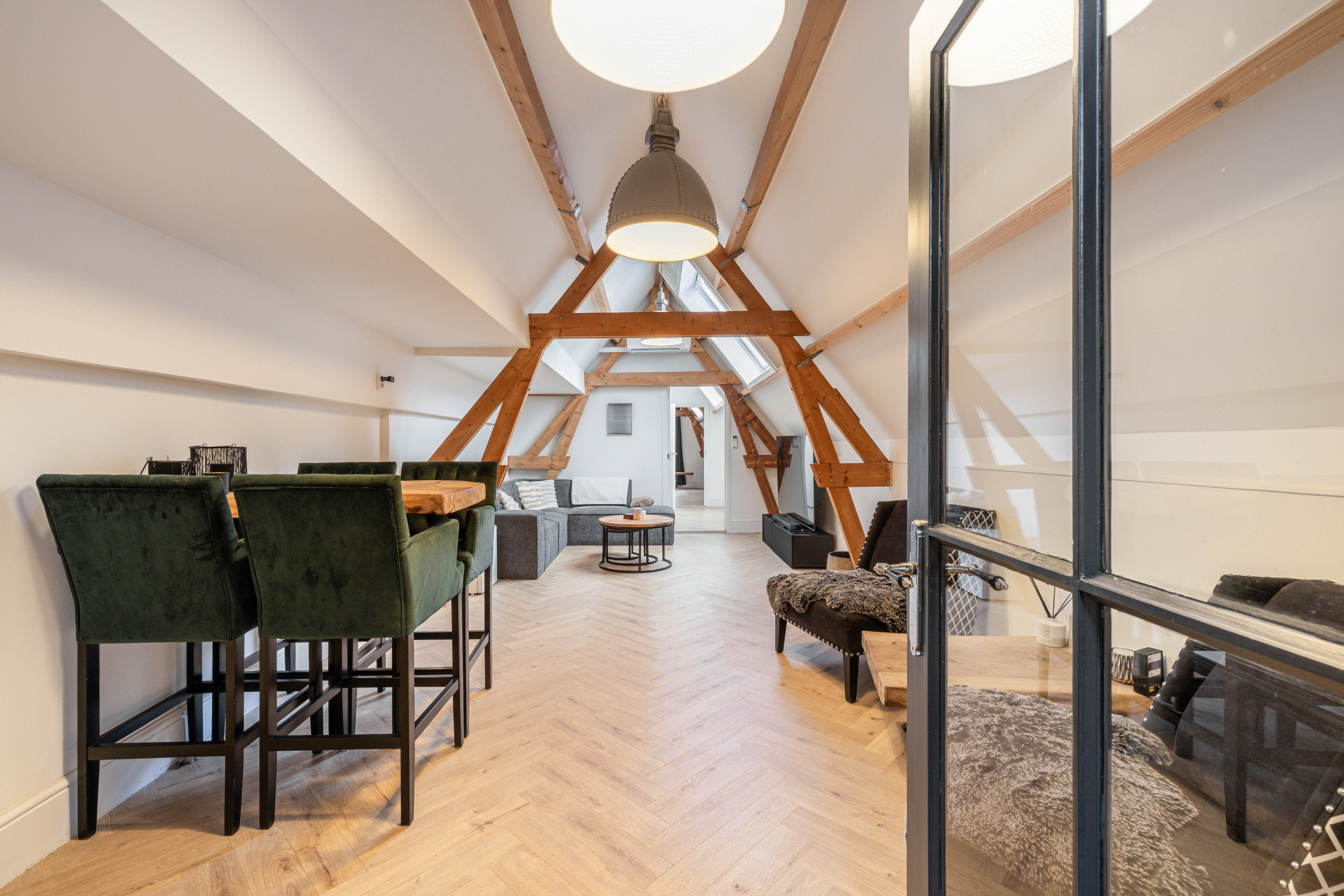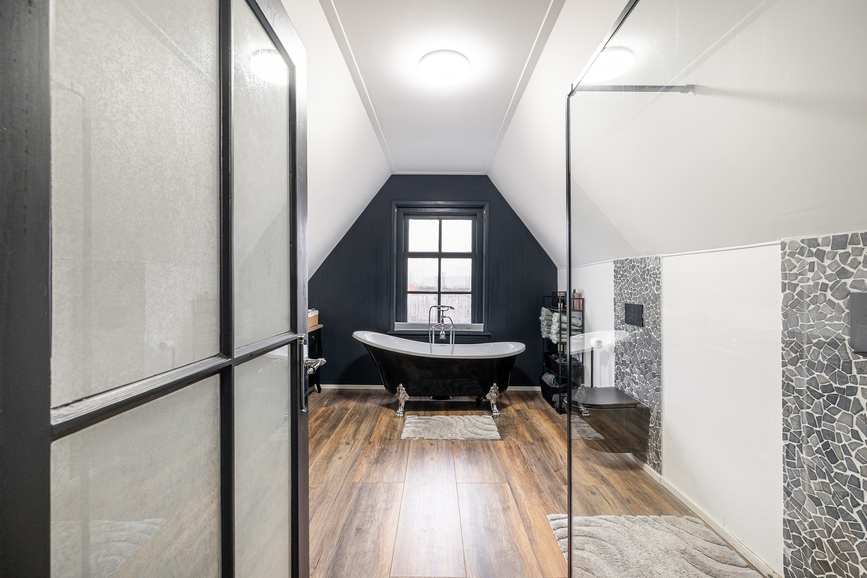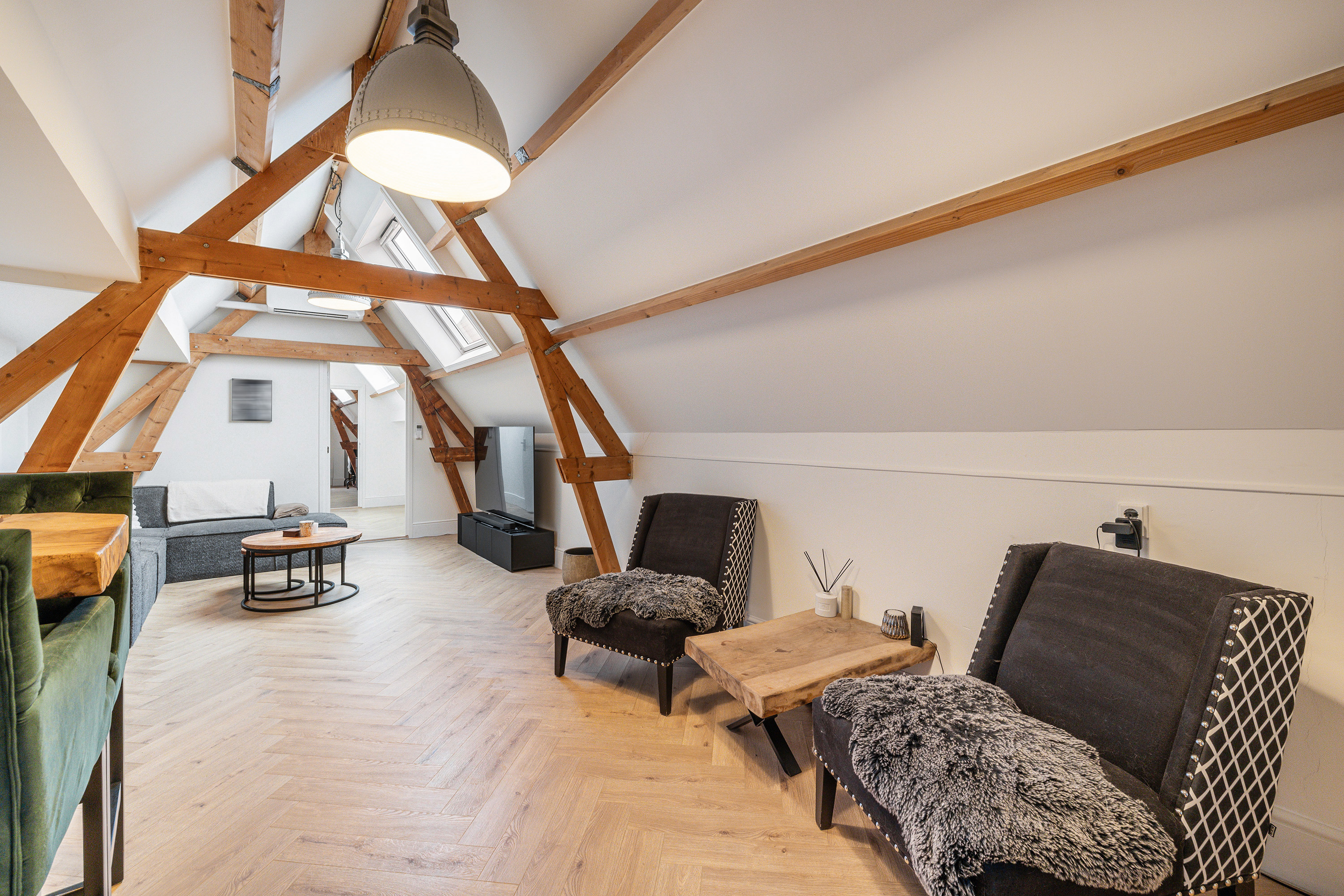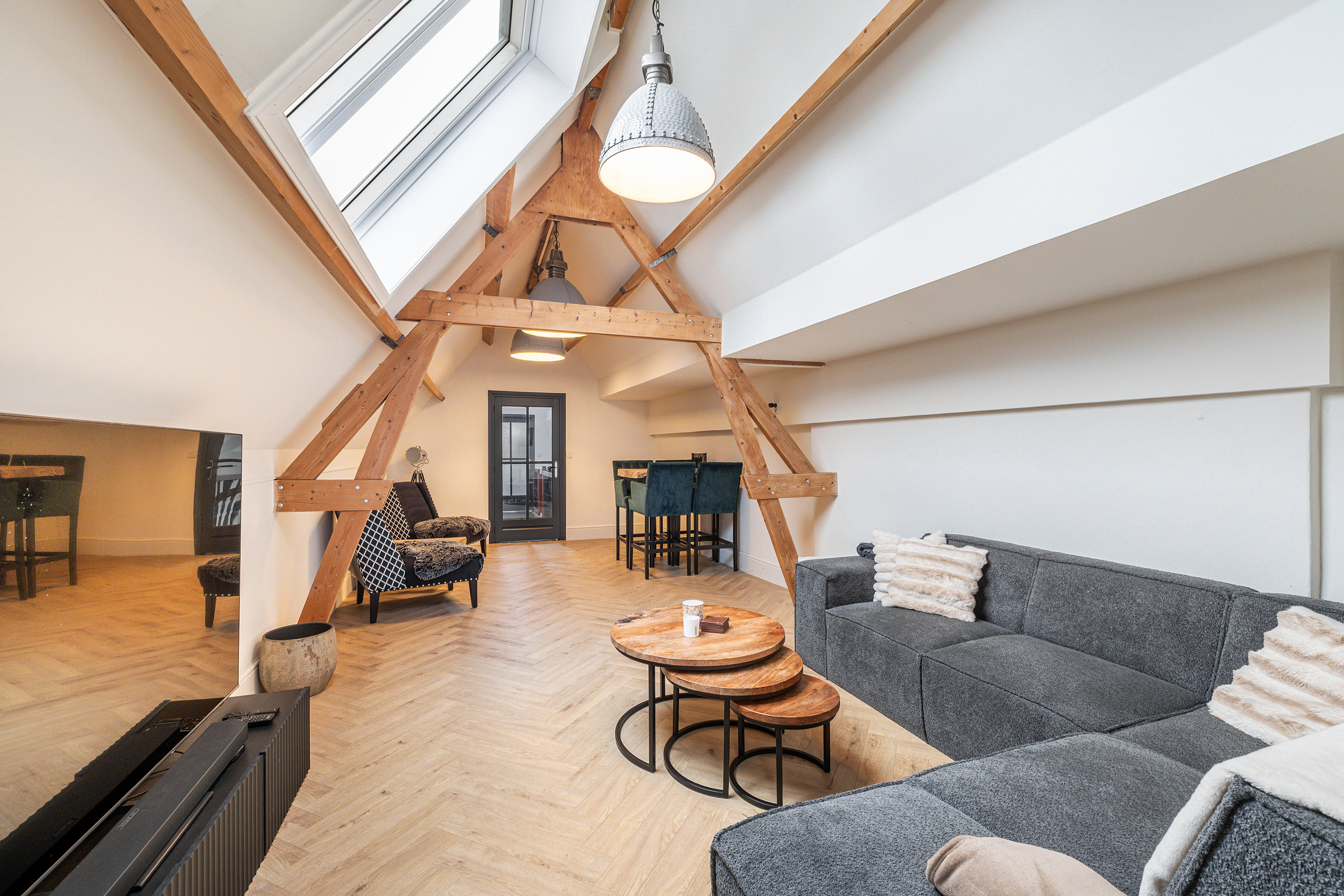 Vanaf de overloop met vide ervaar je direct het extra ruimtelijke gevoel en fijne lichtinval. Je loopt door naar de ruime woonkamer, waar de visgraat laminaat vloer, hoge plinten en zichtbare balken samen met de dakramen zorgen voor een sfeervol en licht geheel. Verder is de woonkamer voorzien van airconditioning. Vanuit de woonkamer bereik je via een gang met dakramen de 2 slaapkamers. Aan de achterzijde bevindt zich de royale hoofdslaapkamer, gelegen aan de Nobelstraat en voorzien van dakramen, een kopgevelraam en airconditioning. De tweede slaapkamer is veelzijdig te gebruiken. Aan de voorzijde bereik je via de overloop de ruime badkamer. De badkamer is compleet uitgevoerd met een inloopdouche, een ligbad met uitzicht naar buiten, een wastafelmeubel, toilet en wasmachine- en drogeraansluitingen. De badkamer is te verwarmen middels een elektrisch verwarmingspaneel.