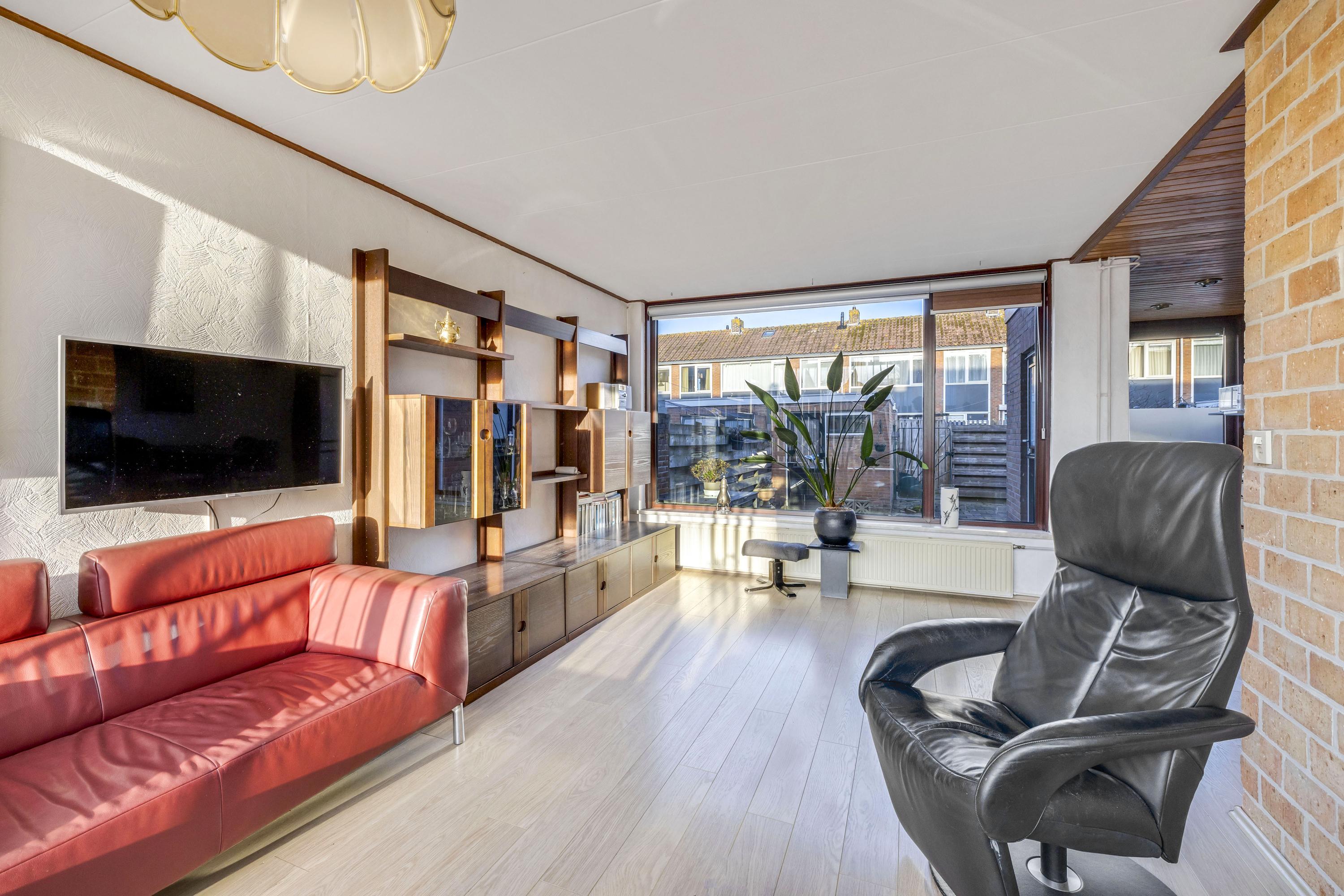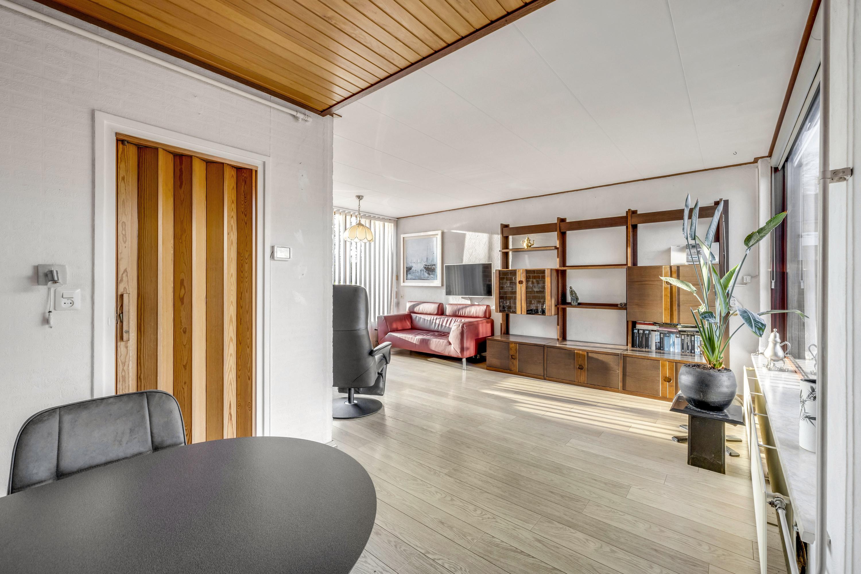 De doorzonwoonkamer is door de grote raampartijen heerlijk zonnig en licht. De vloer is v.v. laminaat.