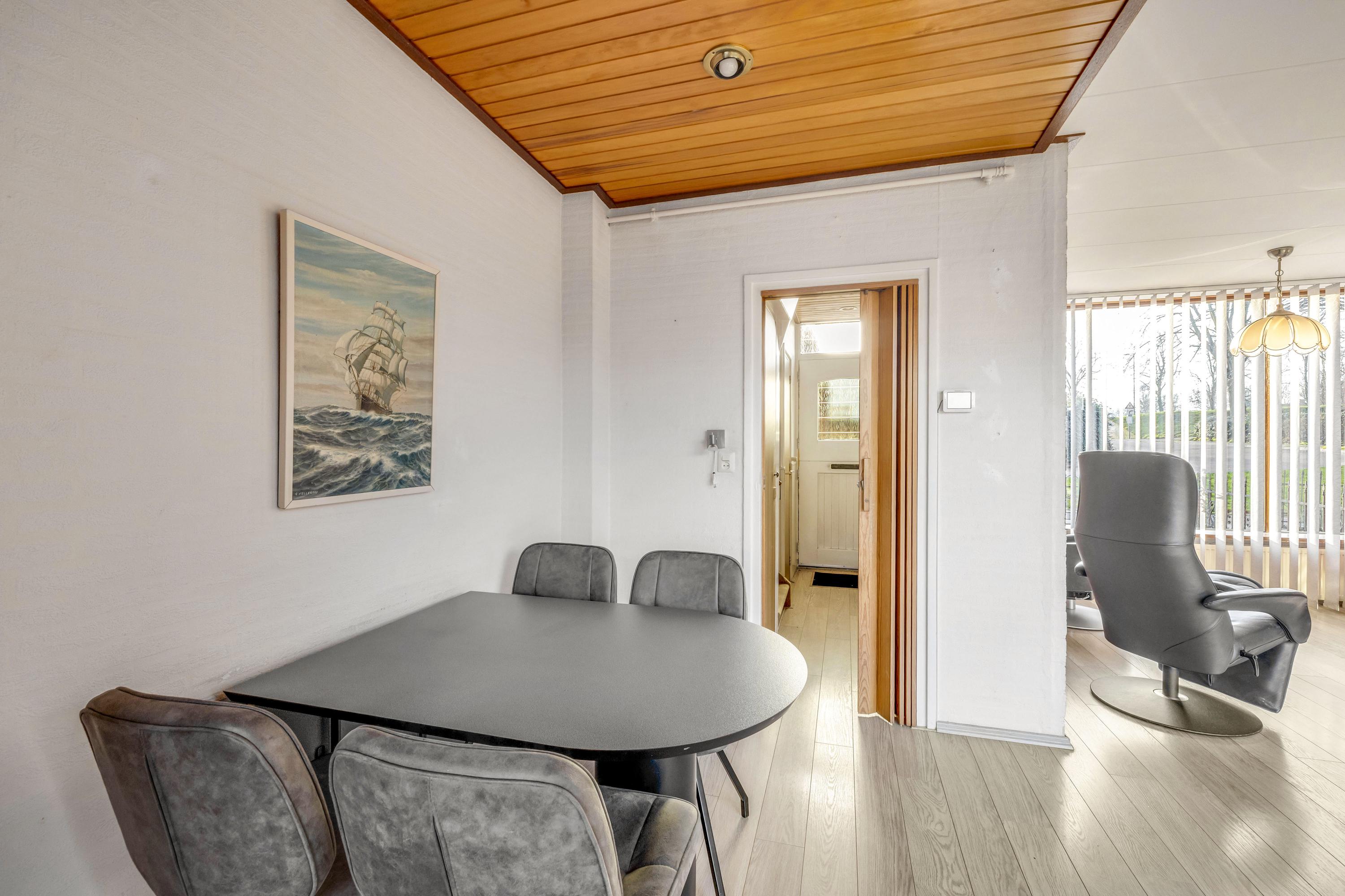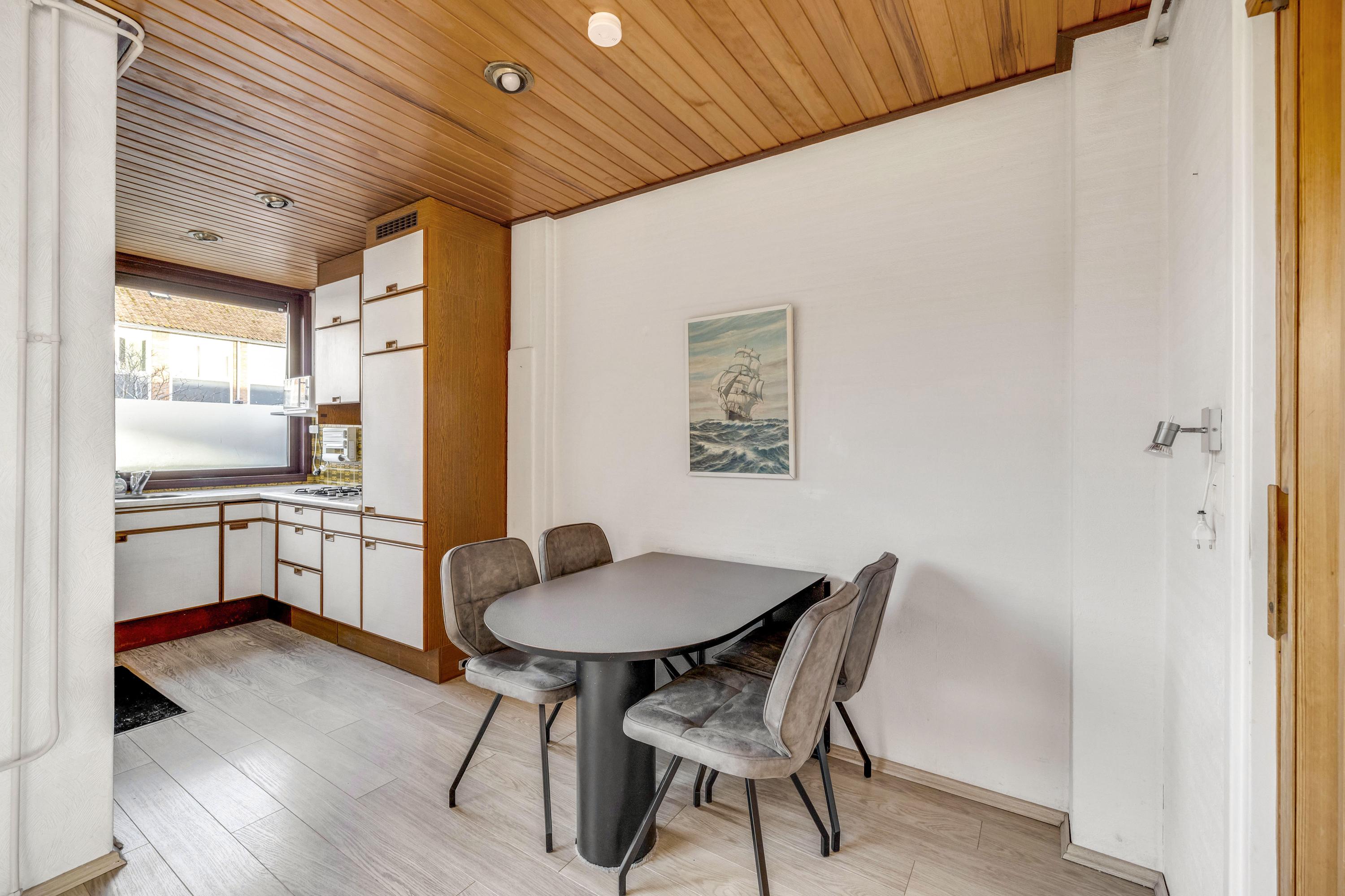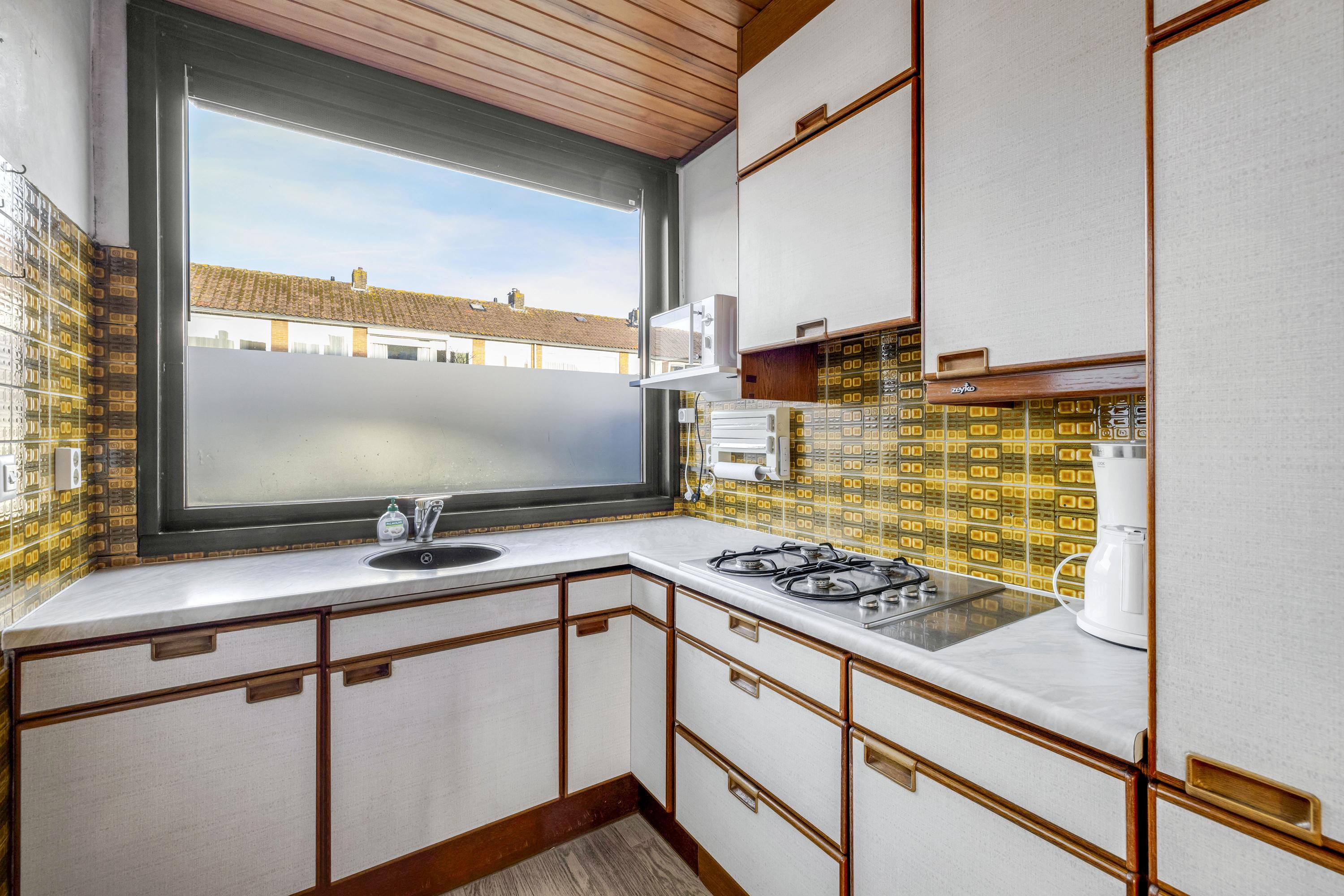 De open keuken is geplaatst in de uitbouw. De hoekopstelling bevindt zich aan de achterzijde van de woning en is v.v. spoelunit, gaskookplaat, afzuigkap, koelkast en vriezer Via de achterdeur is de tuin bereikbaar.