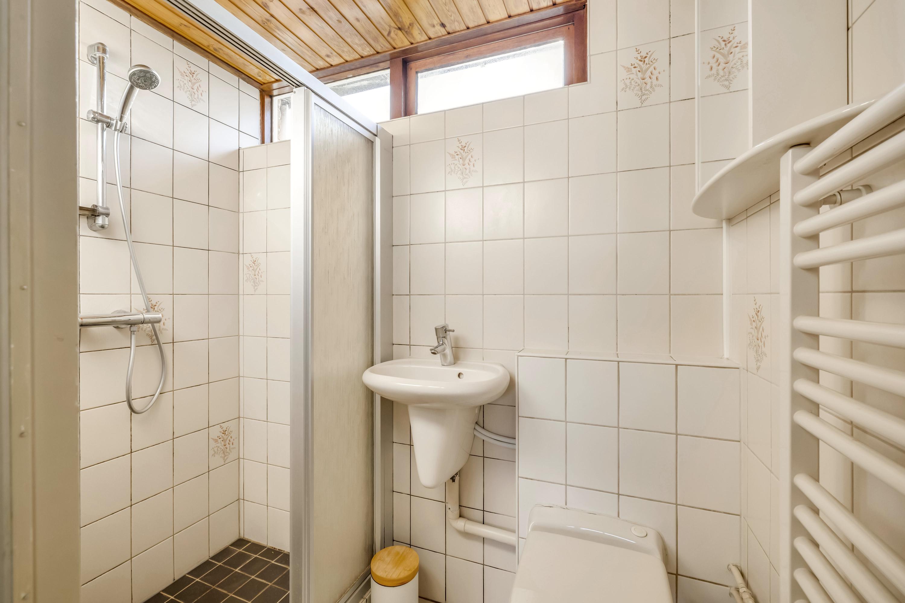 De eenvoudige badkamer is gelegen aan de voorzijde van woning en beschikt over een douchecabine, wastafel, toilet (sanibroyeur) en daglicht.
