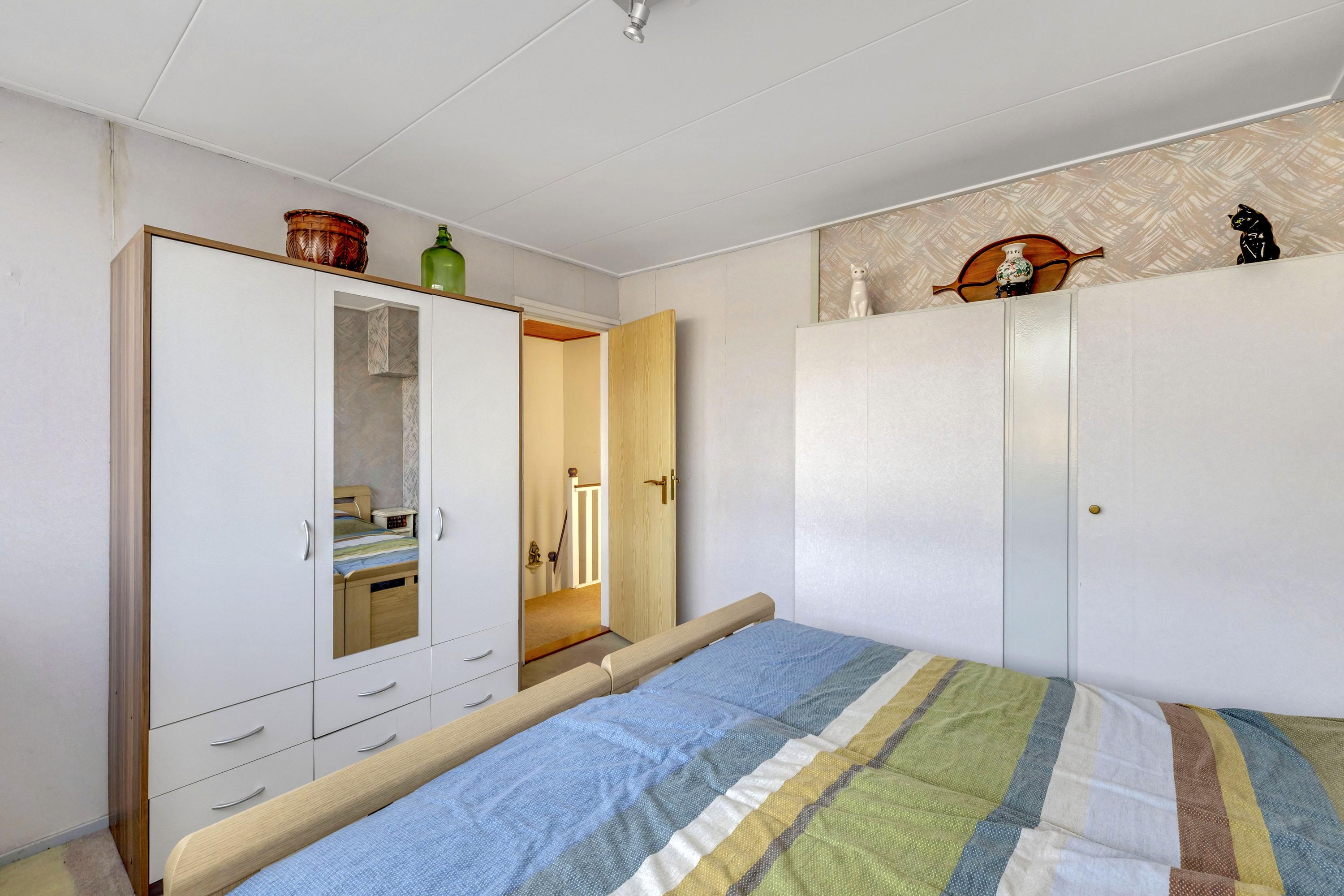 Deze slaapkamer is gelegen aan de achterzijde van de woning en is voorzien van tapijt en kasten.