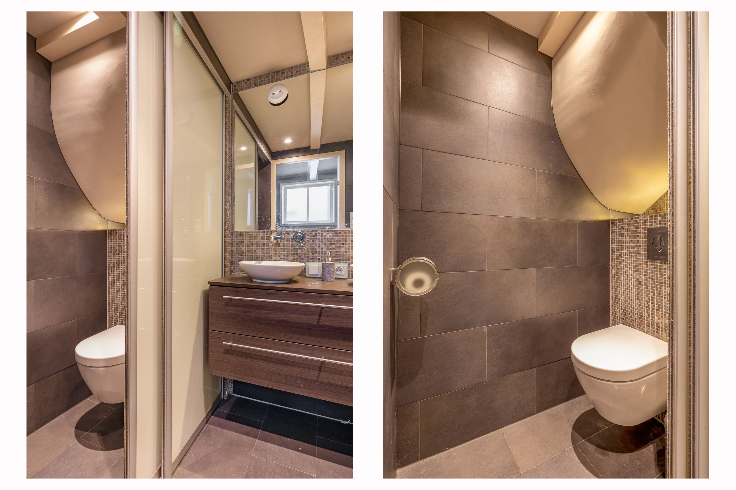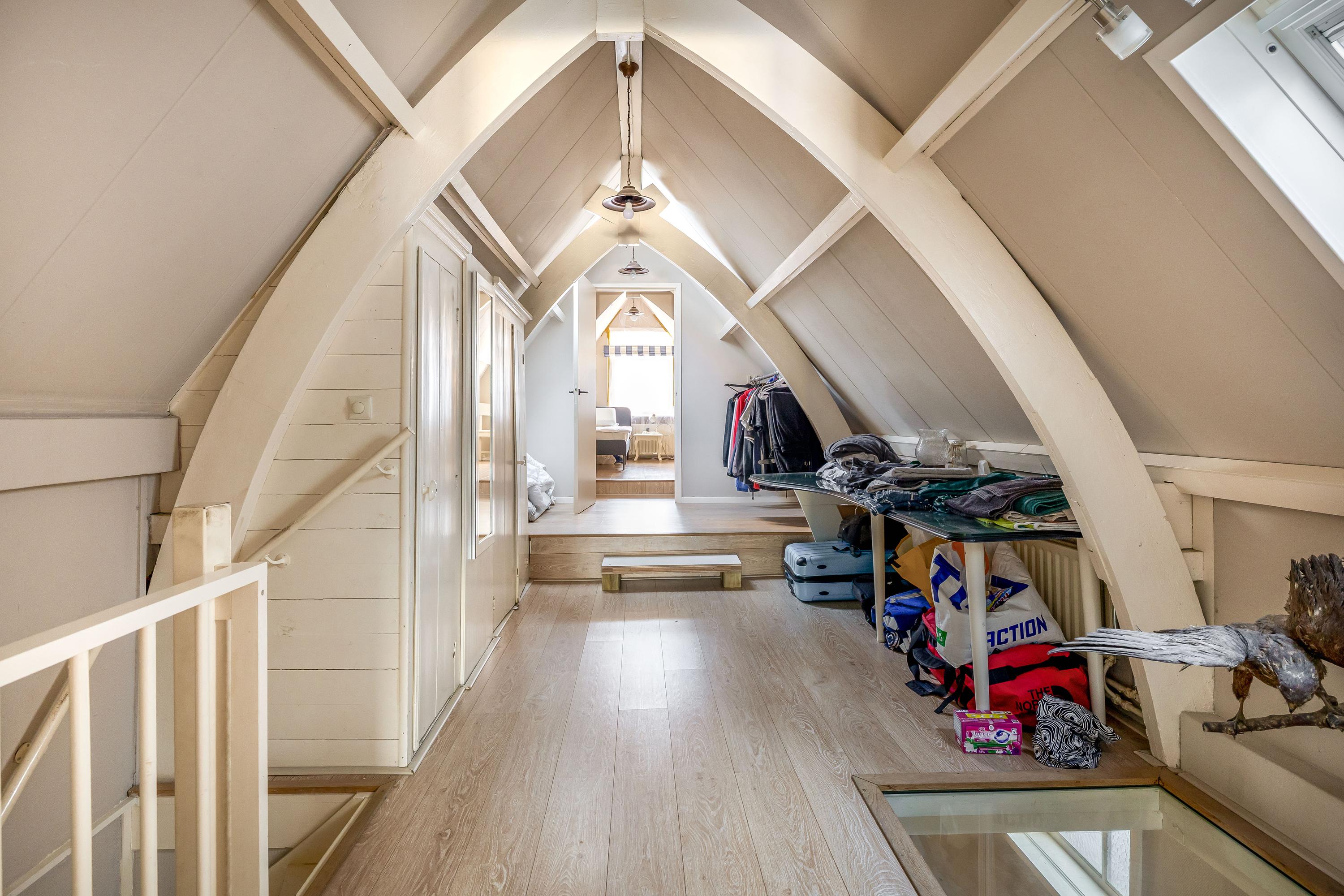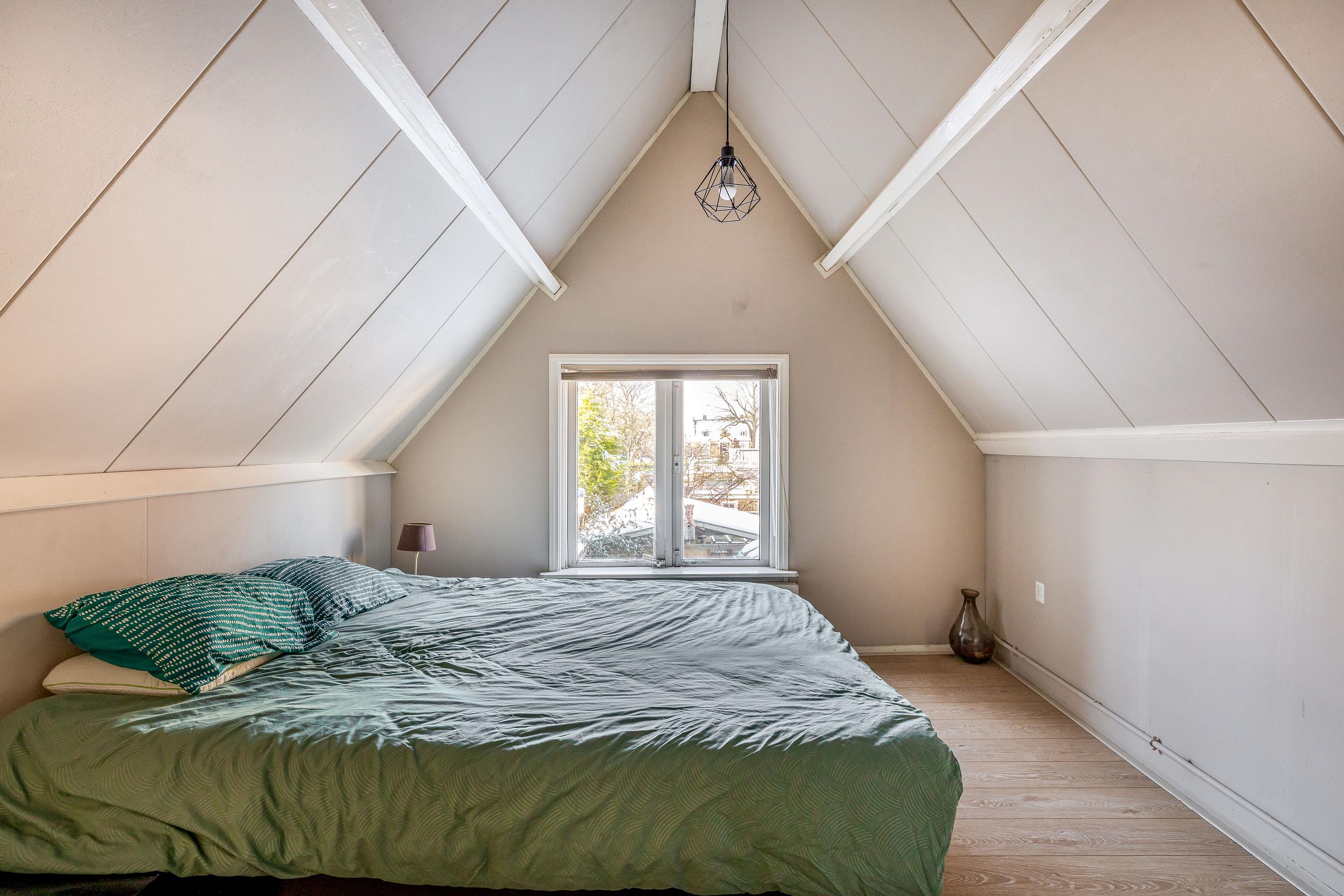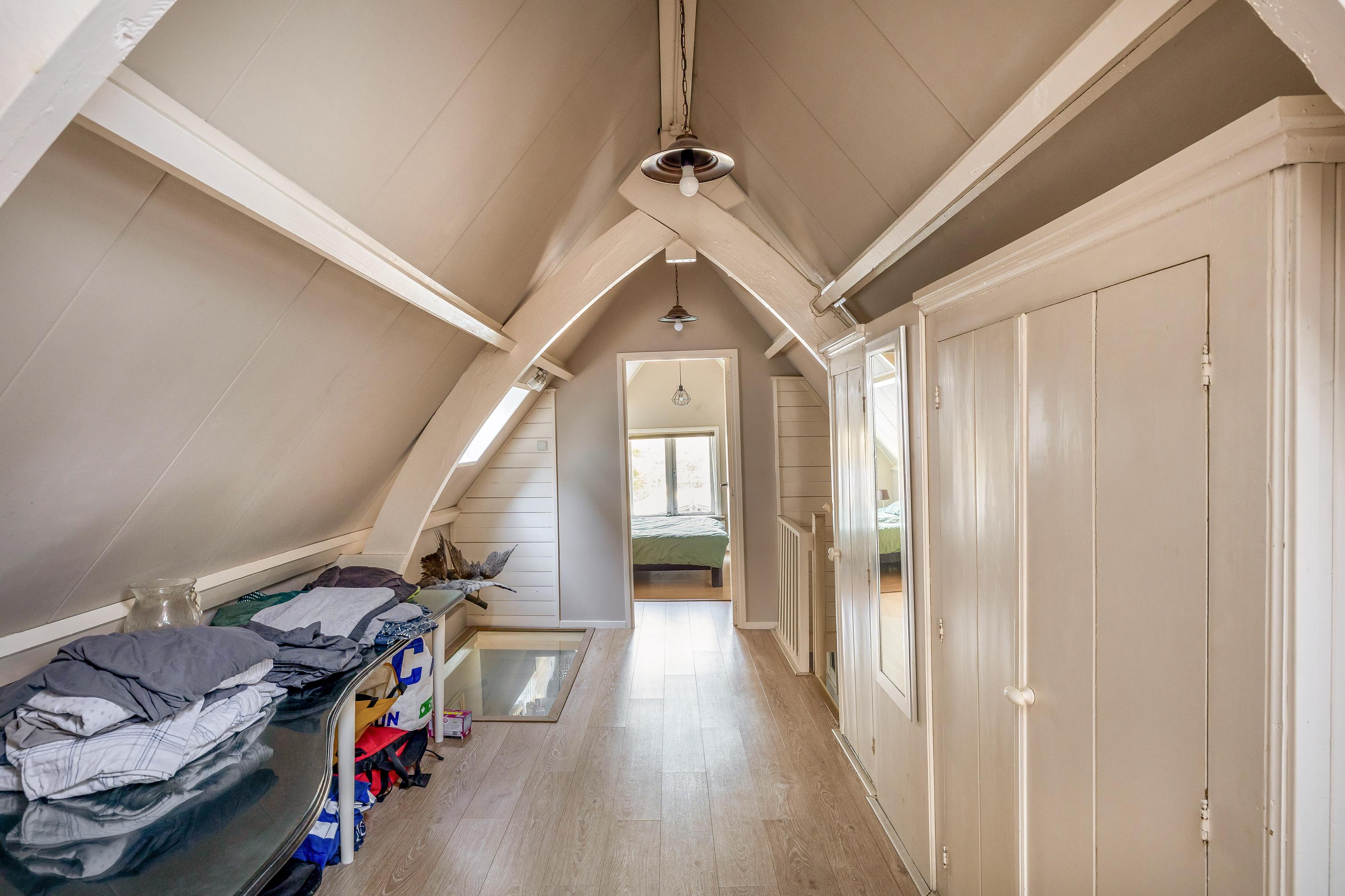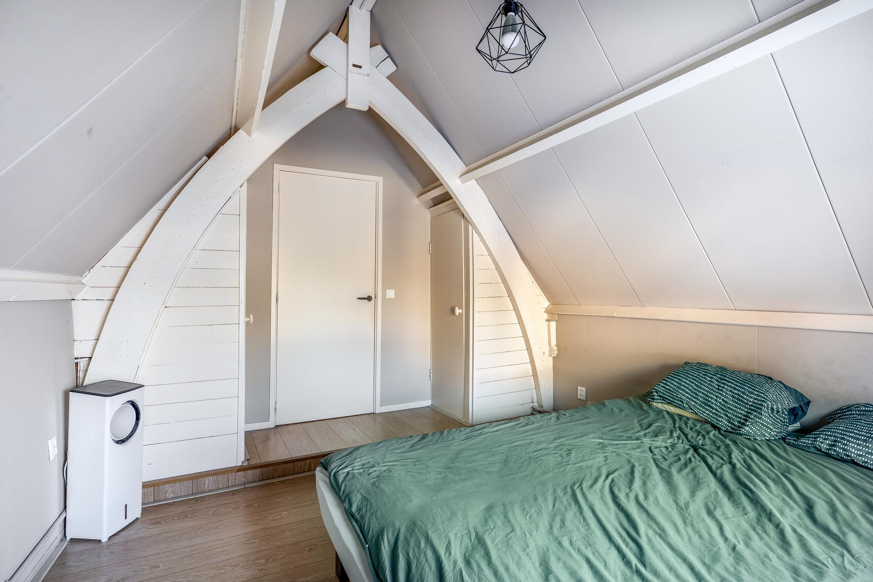 Via de trap kom je op de ruime overloop die ingericht is als werkplek met drie dakramen en vaste kasten, waardoor er veel licht en praktische bergruimte is. Aan de voorzijde bevindt zich de 1e slaapkamer, een bijzondere ruimte door de fraaie kapconstructie met het gebogen spant in het zicht, afgewerkt met een laminaatvloer. Aan de achterzijde ligt tweede slaapkamer, deze is eveneens voorzien van een laminaatvloer en aangenaam licht door het raam in de gevel.