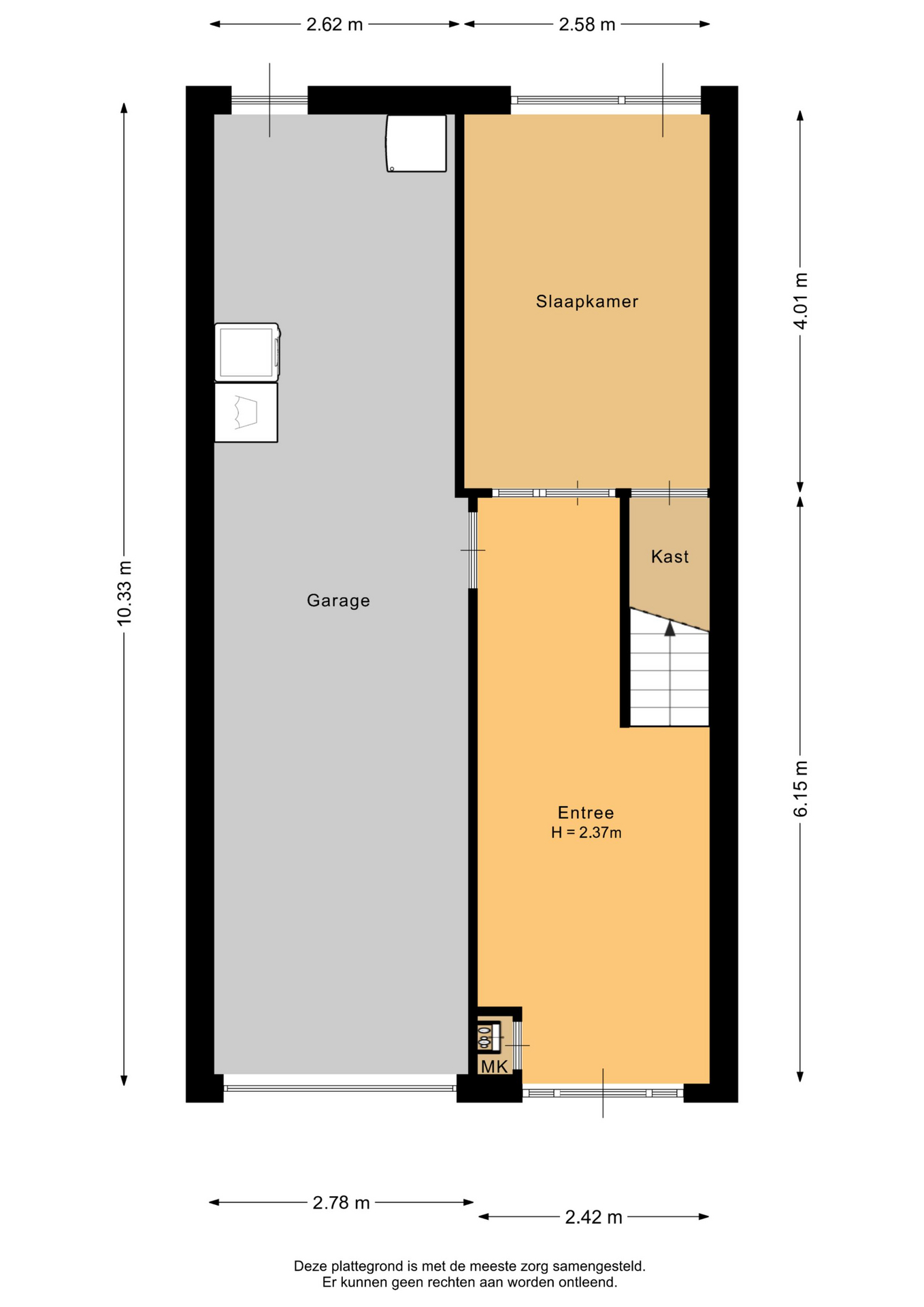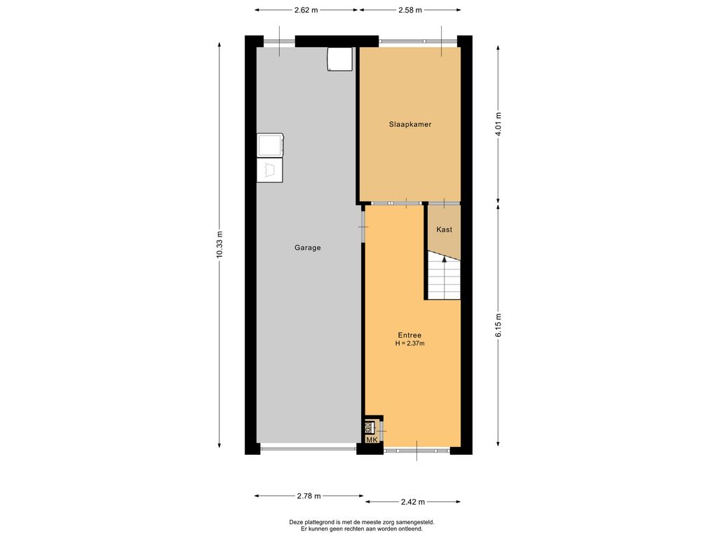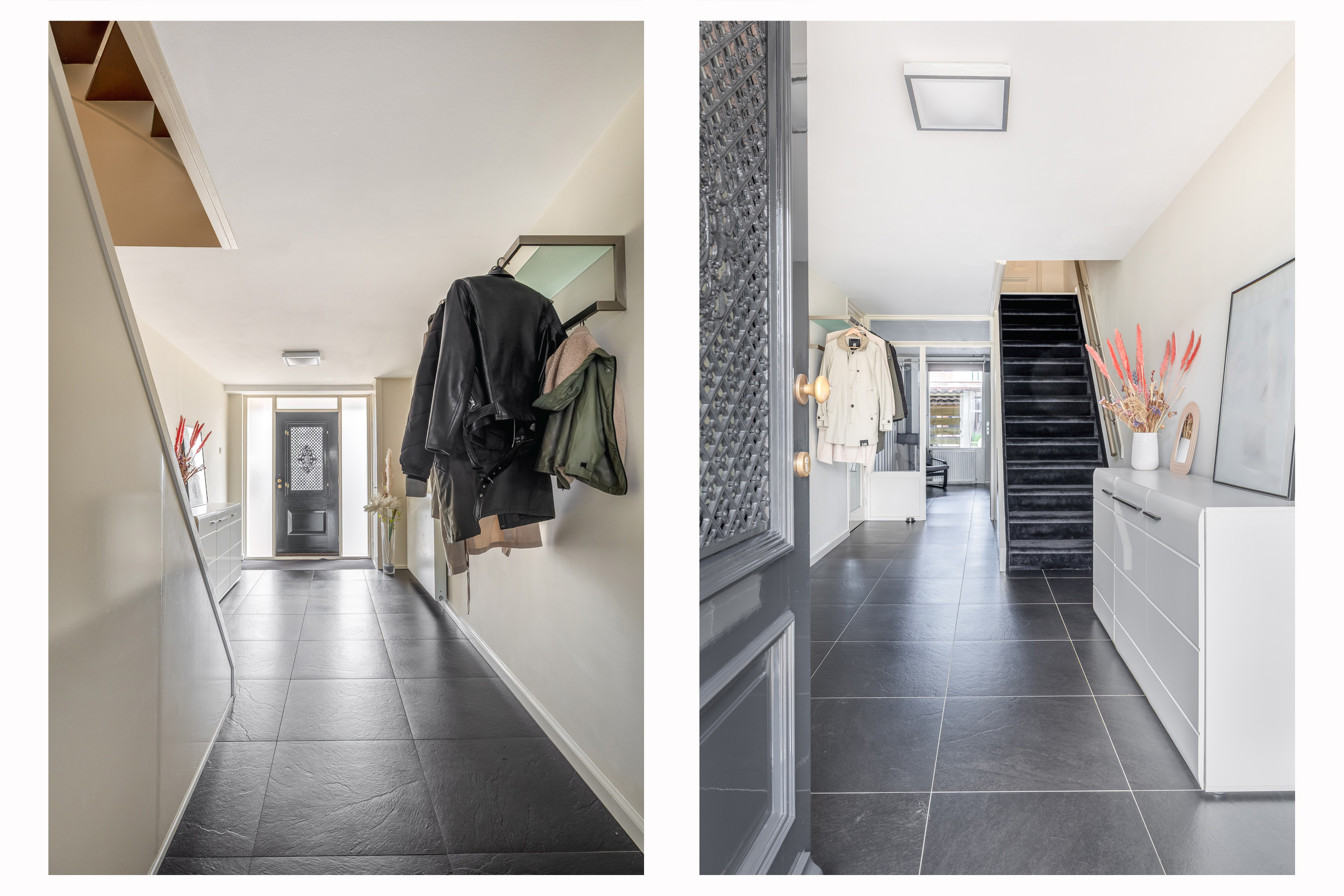Je betreedt de woning via de entree, waar je de trap naar de eerste verdieping vindt. Vanuit de hal heb je toegang tot de tuinkamer/slaapkamer en de ruime garage. De tuinkamer/slaapkamer is praktisch ingedeeld en beschikt over een inbouwkast en een deur naar de achtertuin, waardoor deze ruimte multifunctioneel te gebruiken is. De aangrenzende garage is netjes afgewerkt en voorzien van water, elektra en verwarming. Ook hier is er een deur naar de achtertuin en een elektrische sectionaaldeur, waardoor de garage ideaal is voor parkeren, opslag of als extra werkruimte.