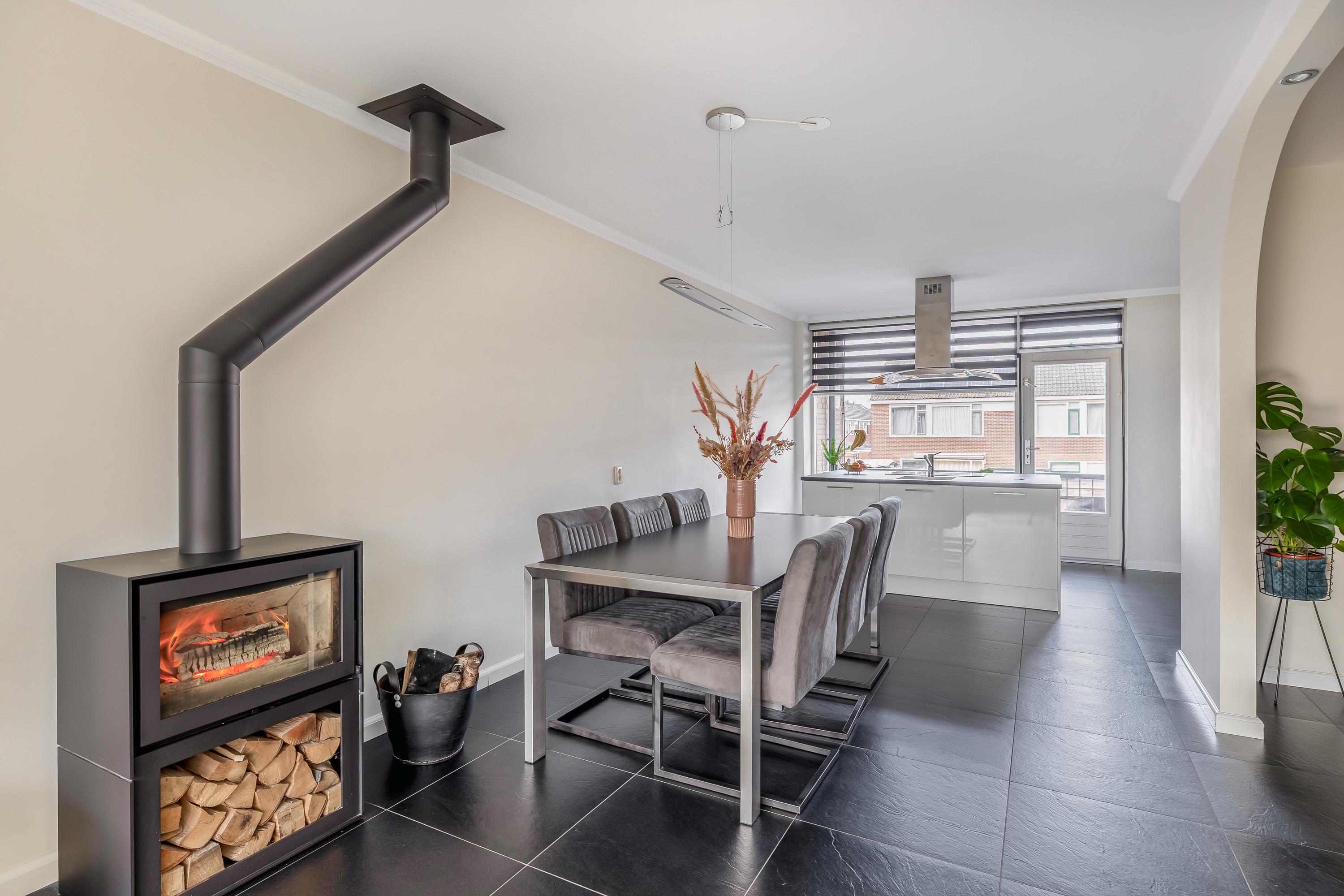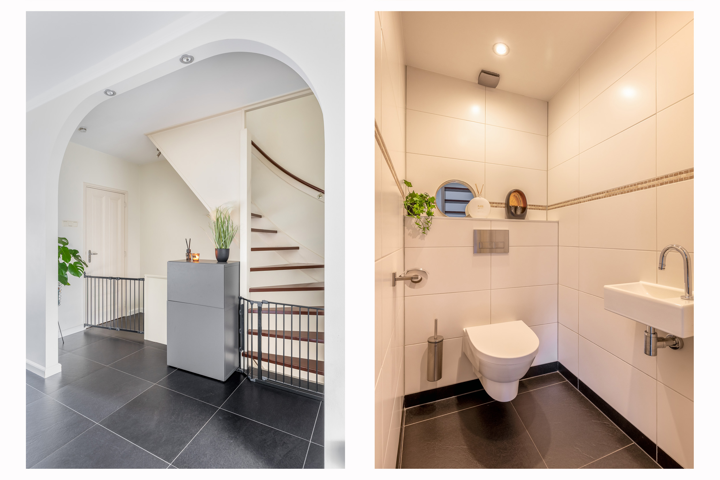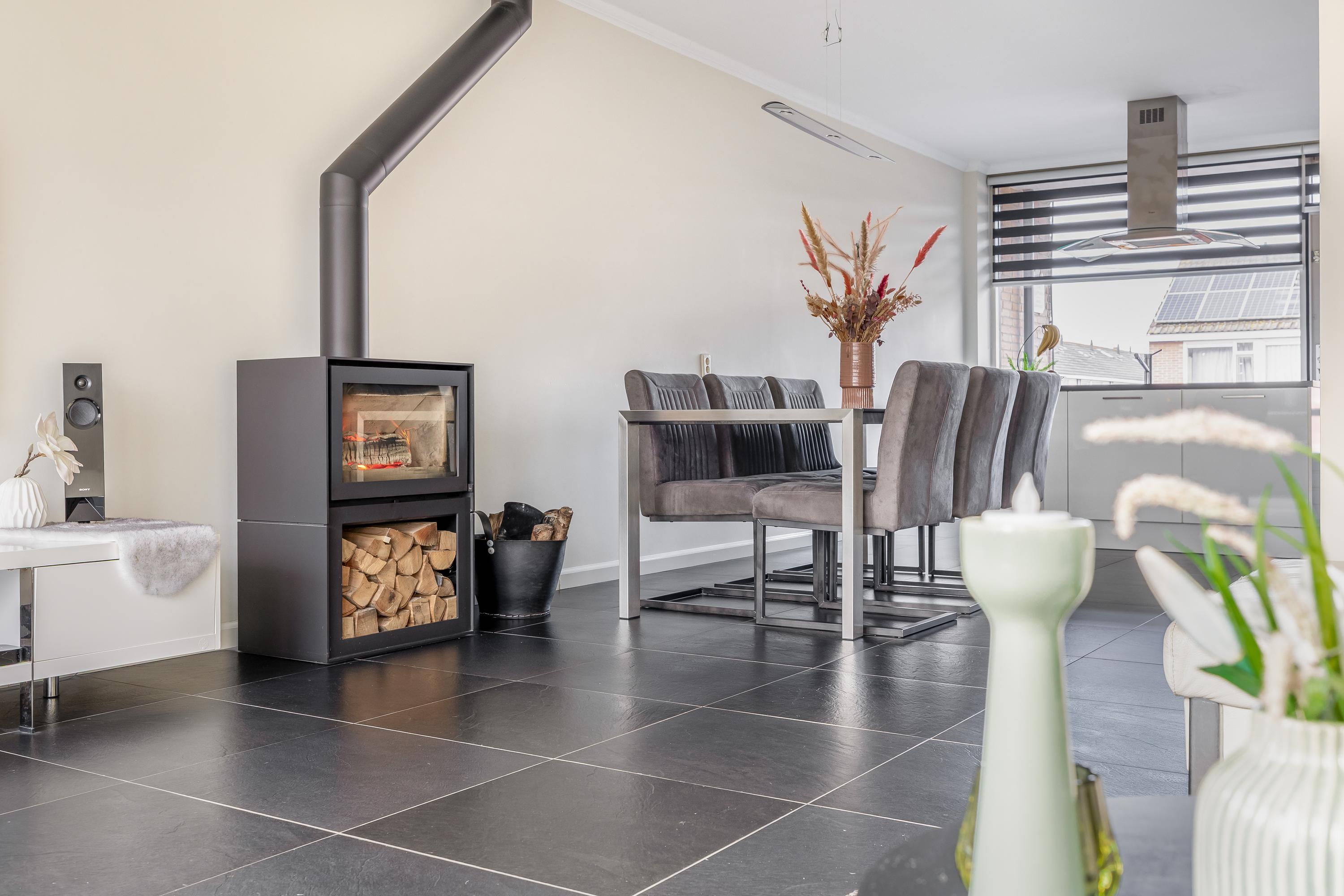 Via de trap bereik je de 1e verdieping. Op de overloop bevindt zich de modern afgewerkte toiletruimte, volledig betegeld en voorzien van een hangend closet en fontein. De woonkamer bevindt zich aan de voorzijde van de woning en is sfeervol en comfortabel ingericht en is voorzien van een houtkachel en airconditioning. Hier bevindt zich ook een deur die toegang geeft tot een balkon op het zuidoosten, dit balkon is voorzien van elektrische zonwering en hier bevindt zich de unit van de airconditioning. Aangrenzend aan de woonkamer bevindt zich de open keuken, uitgerust met diverse inbouwapparatuur, waaronder een keramische kookplaat, afzuigkap, koel-vriescombinatie, combimagnetron en vaatwasser. Via de keuken is er toegang tot het balkon aan de achterzijde, via dit balkon is de achtertuin bereikbaar doormiddel van een trap. Ook bevindt hier een kast met de opstelling van de cv-combiketel (Remeha 2017). De vloer is afgewerkt met keramische tegels en de gehele verdieping is voorzien van vloerverwarming, wat zorgt voor een aangenaam wooncomfort.