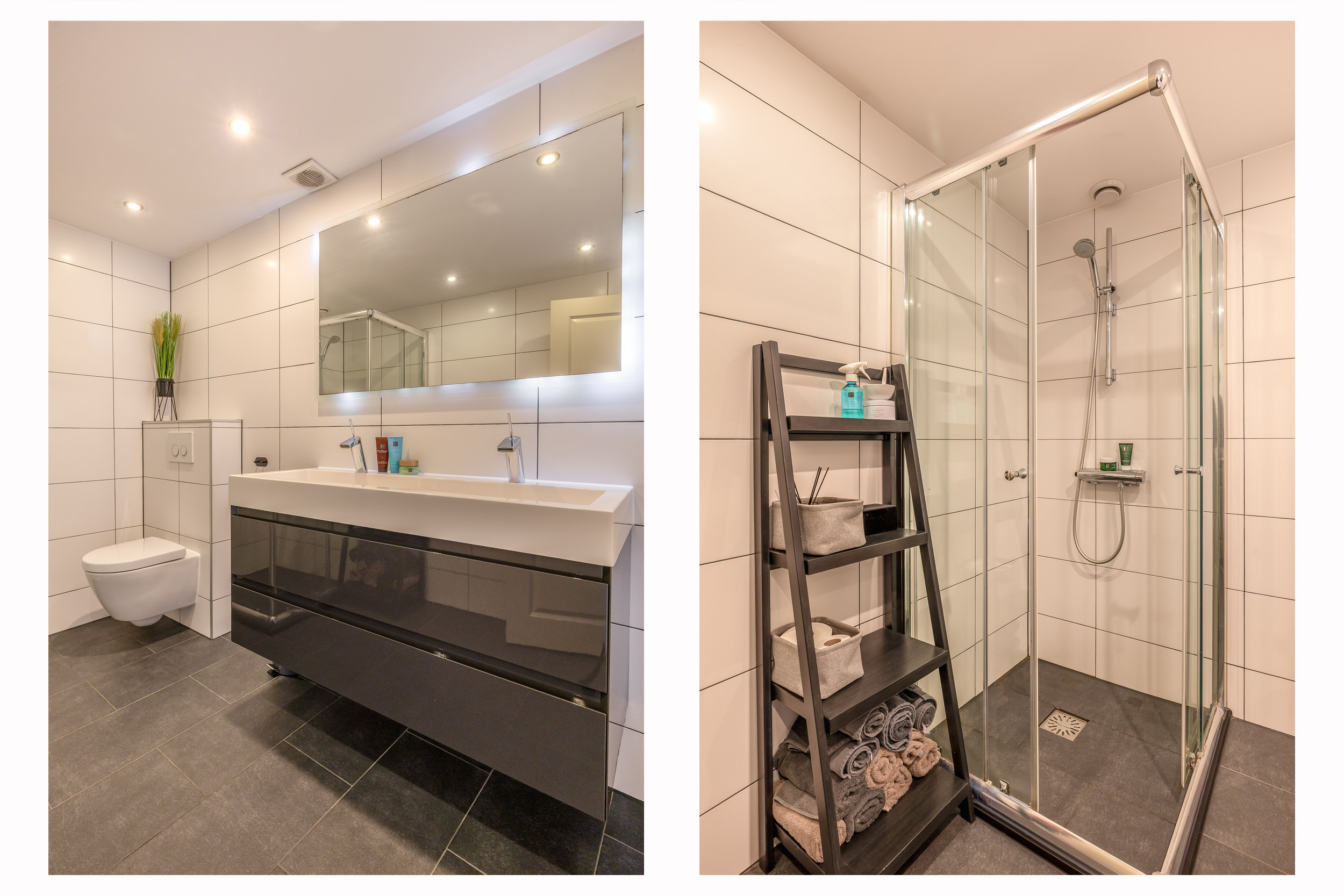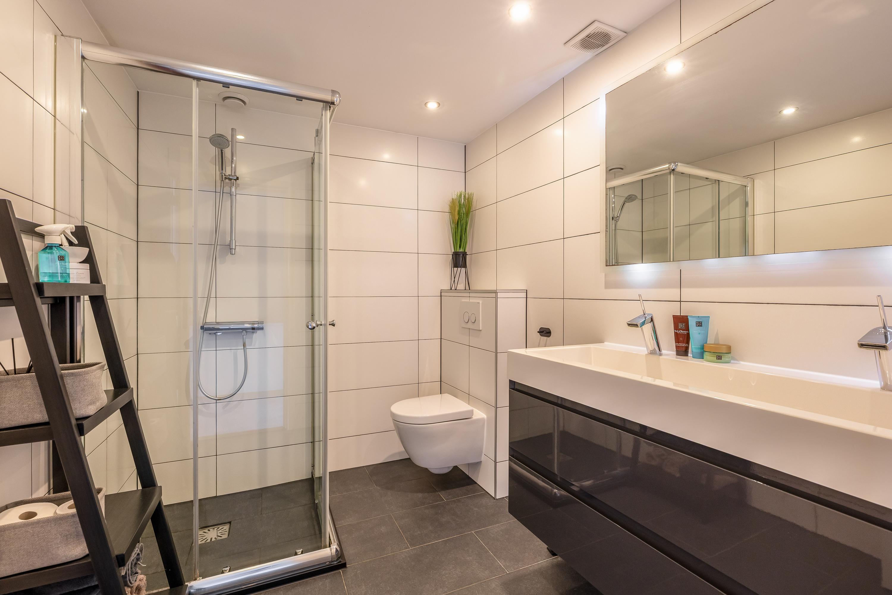 Ook bereik je via de overloop de badkamer met een douche, hangend toilet en dubbel wastafelmeubel. Voor extra gemak en privacy is de achterzijde van deze verdieping voorzien van elektrische rolluiken. De verdiepingsvloer is afgewerkt met vloerbedekking.